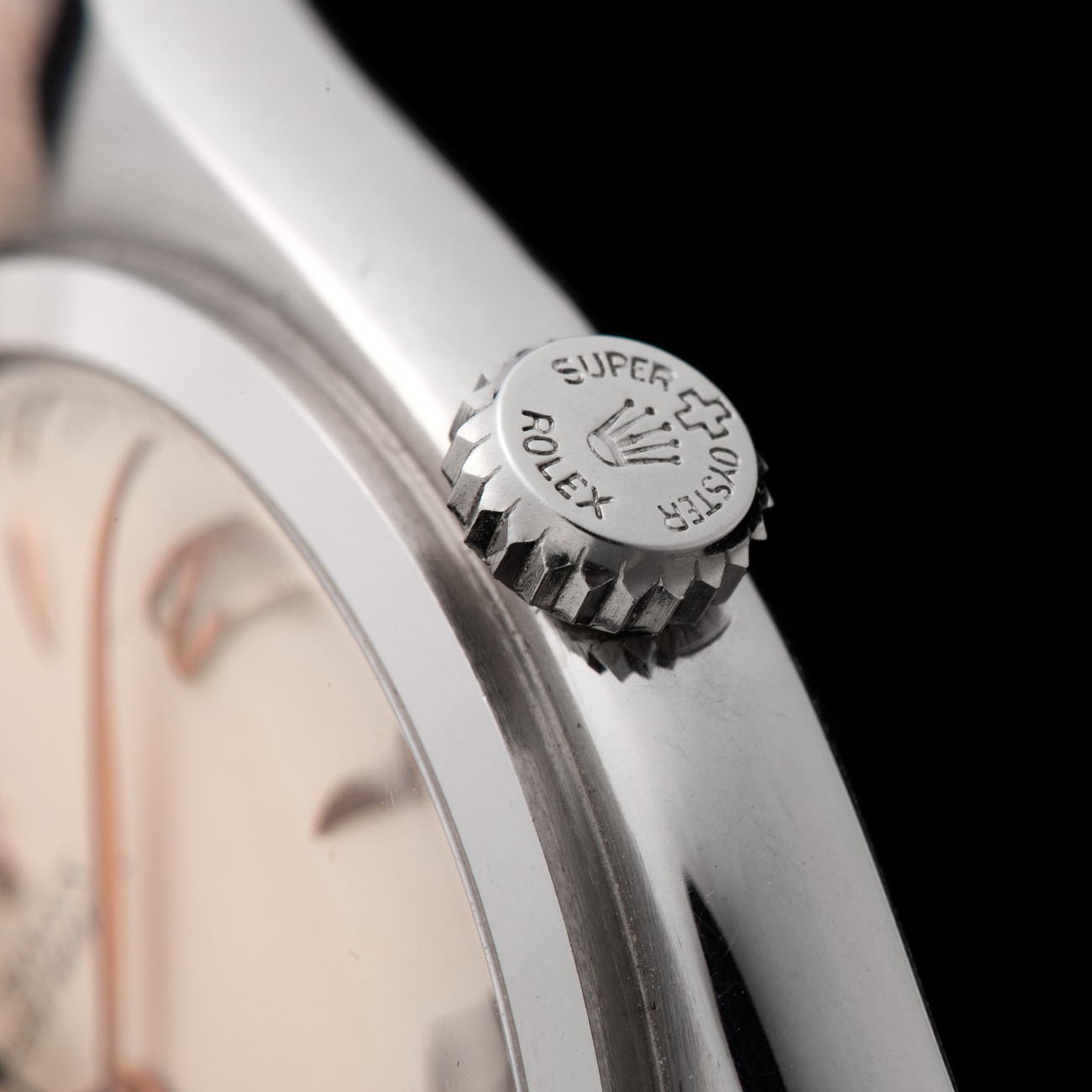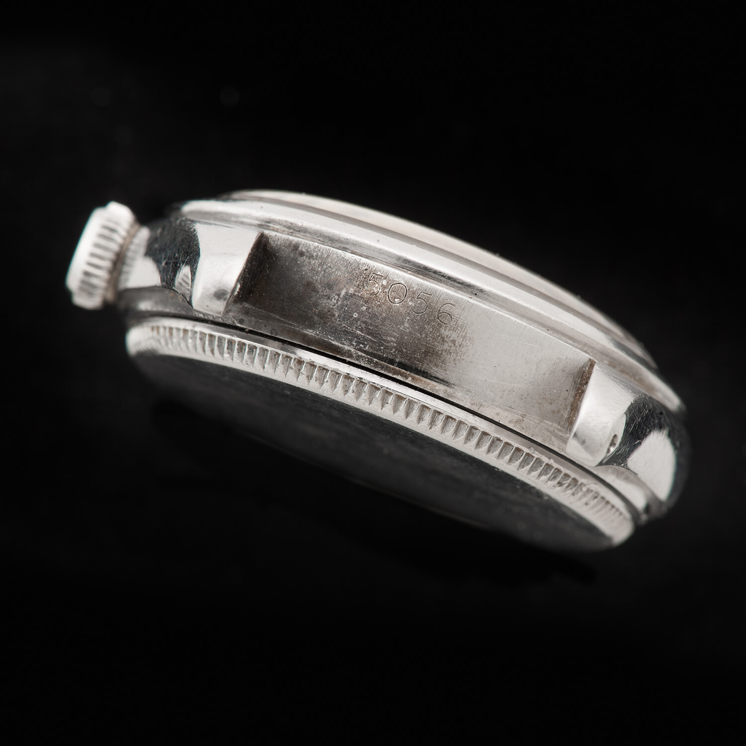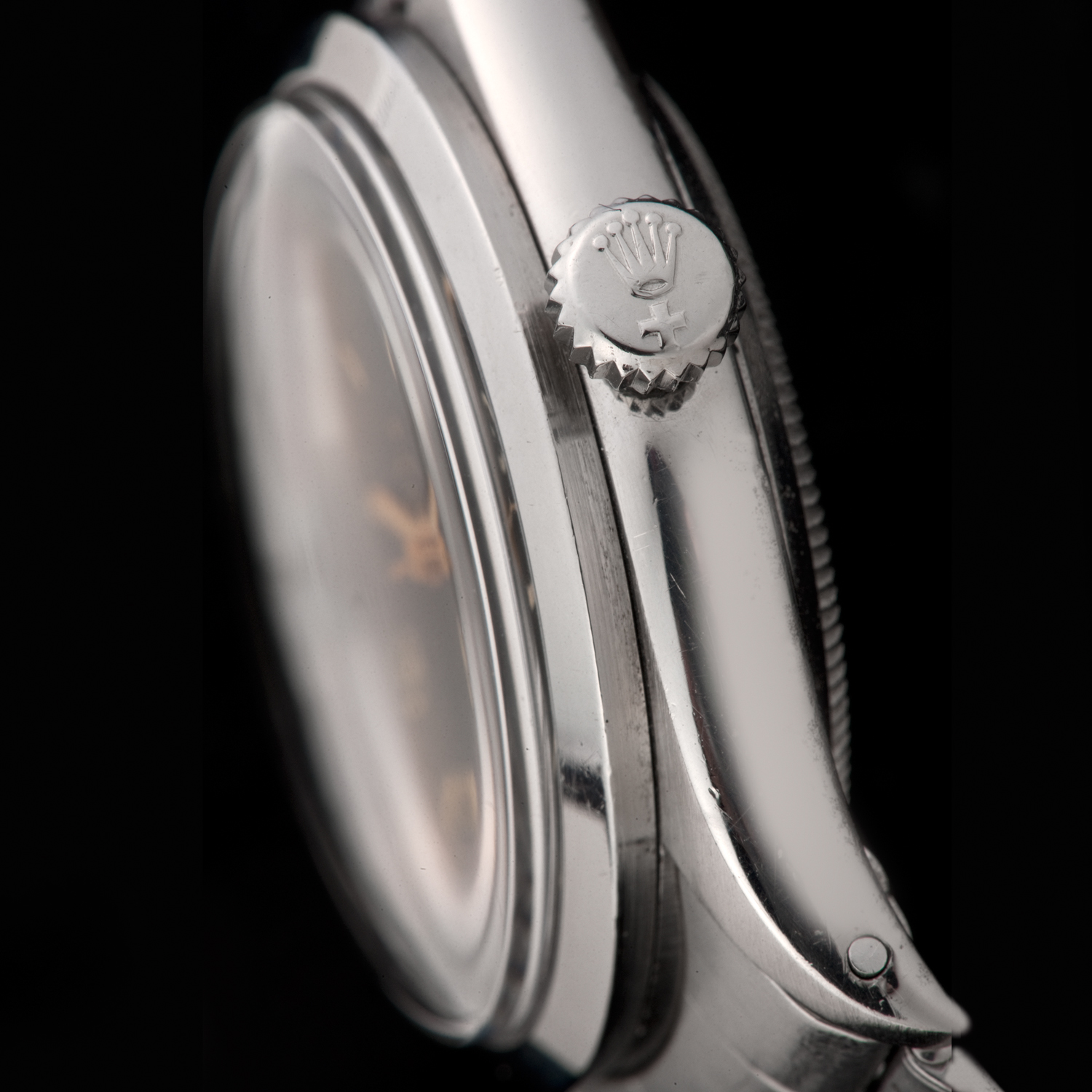プロトタイプともいうべき大変珍しいケースデザインが特徴のオイスターパーペチュアルで、ベネズエラの高級宝飾店であるSERPICO Y LAINO社の銘が入るダブルネームモデルとなります。