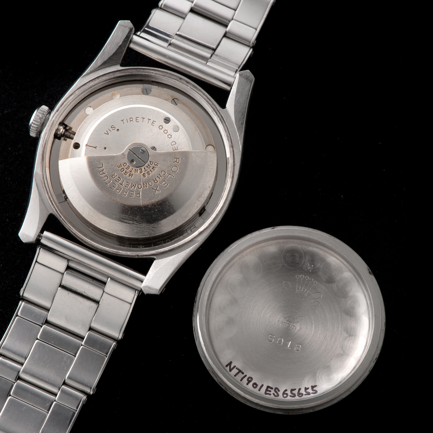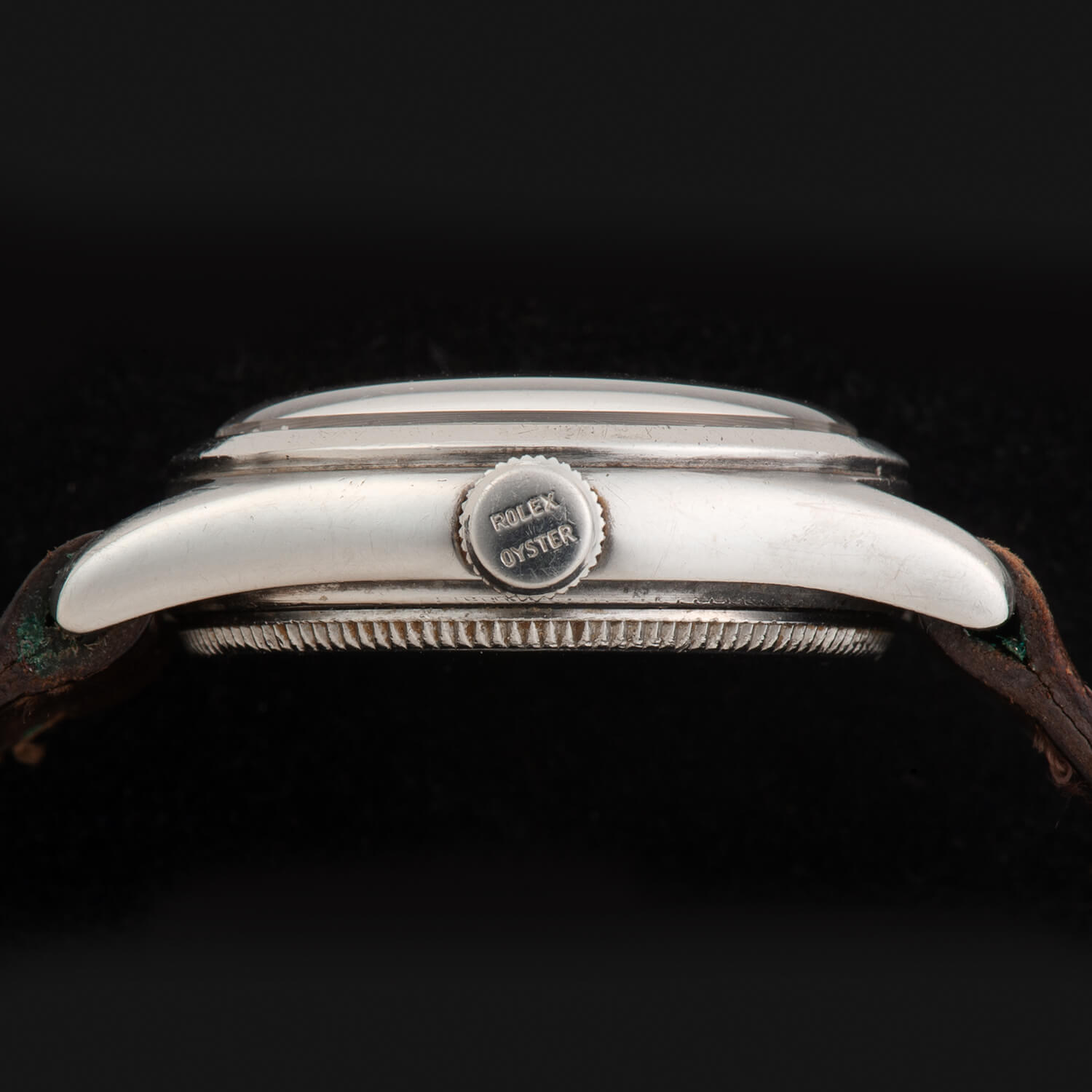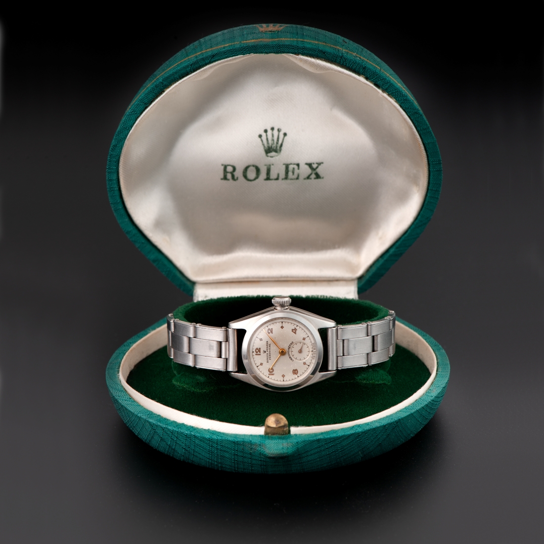 プロトタイプともいうべき大変珍しいケースデザインが特徴のオイスターパーペチュアルで、ベネズエラの高級宝飾店であるSERPICO Y LAINO社の銘が入るダブルネームモデルとなります。