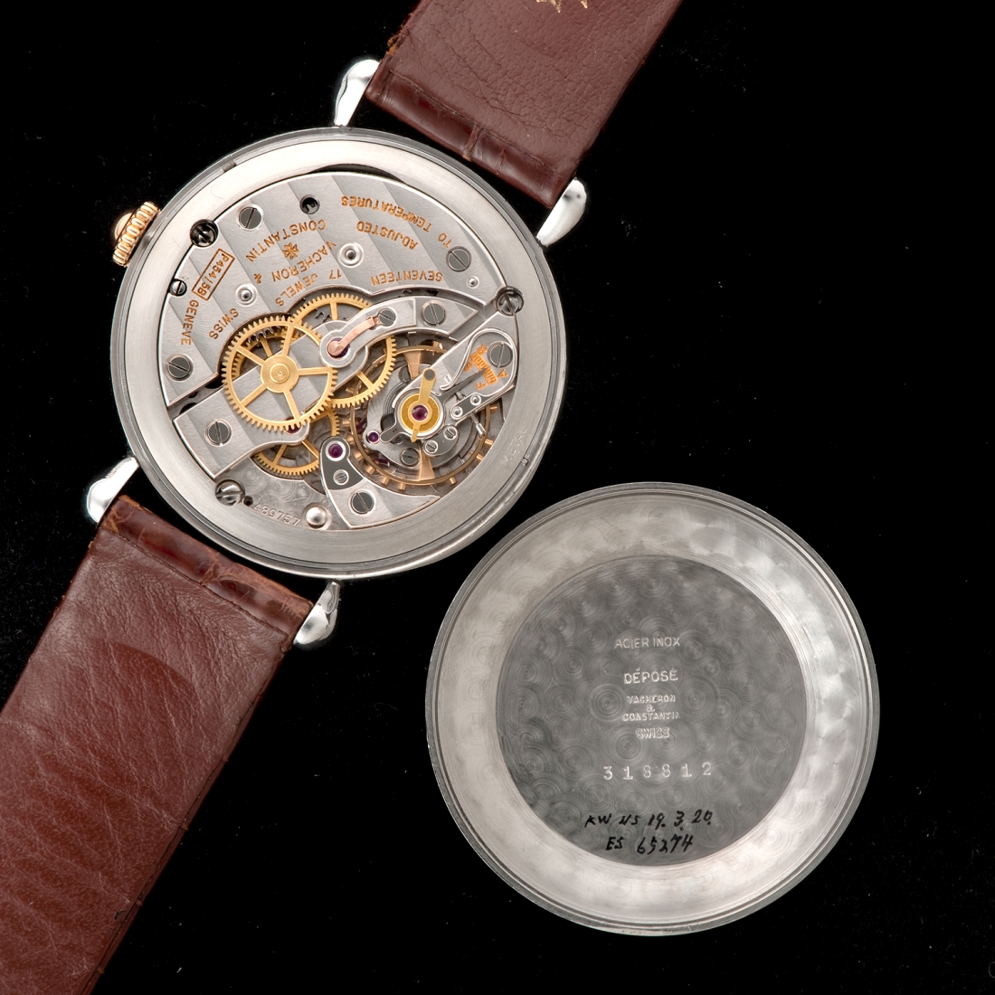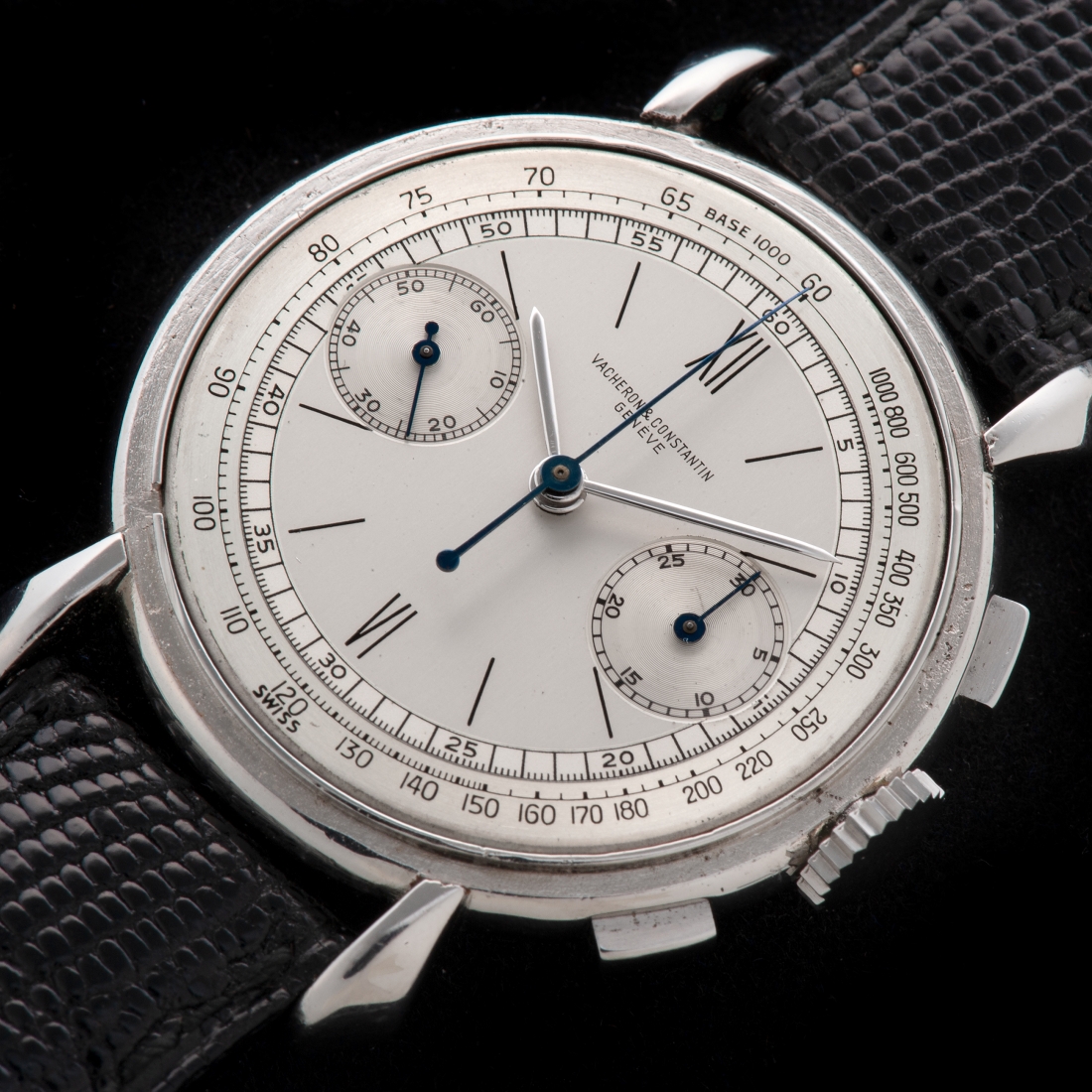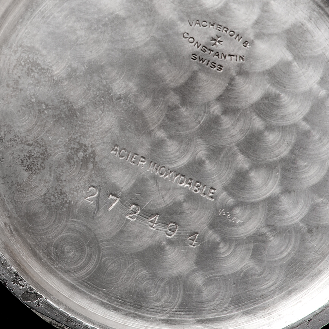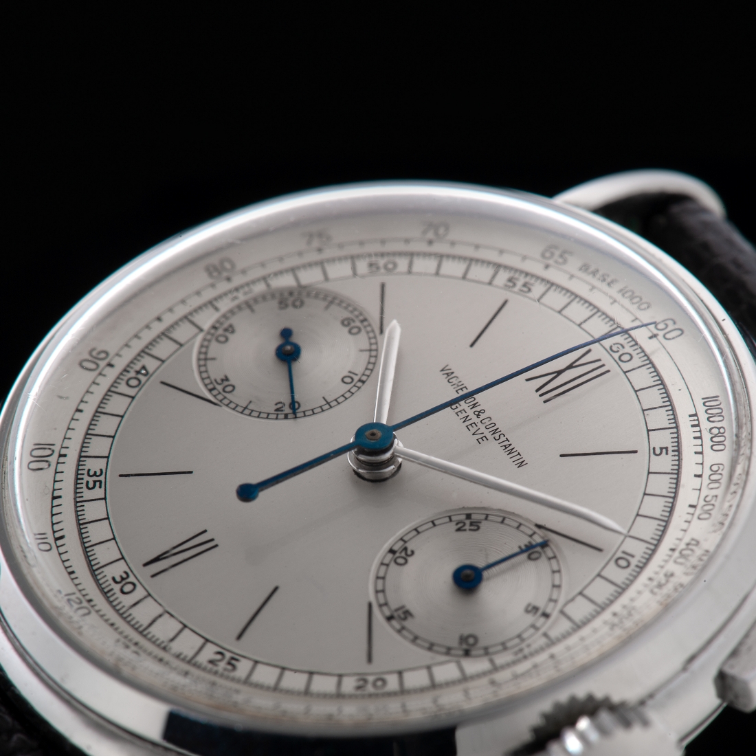 大変希少なステンレス製のクロノグラフです。金無垢素材のバセロンクロノは定期的に入荷致しますが、ステンレス製となると入荷する事のないレアピースです。パテックなども同じように金無垢で造られた物の方が多く、当時の定価は当然金無垢の方が高価でしたが、ヴィンテージ時計のマーケット(パテックやバセロンなどの一部のブランド)では、希少性の観点からステンレス製の方が高価になる事があります。