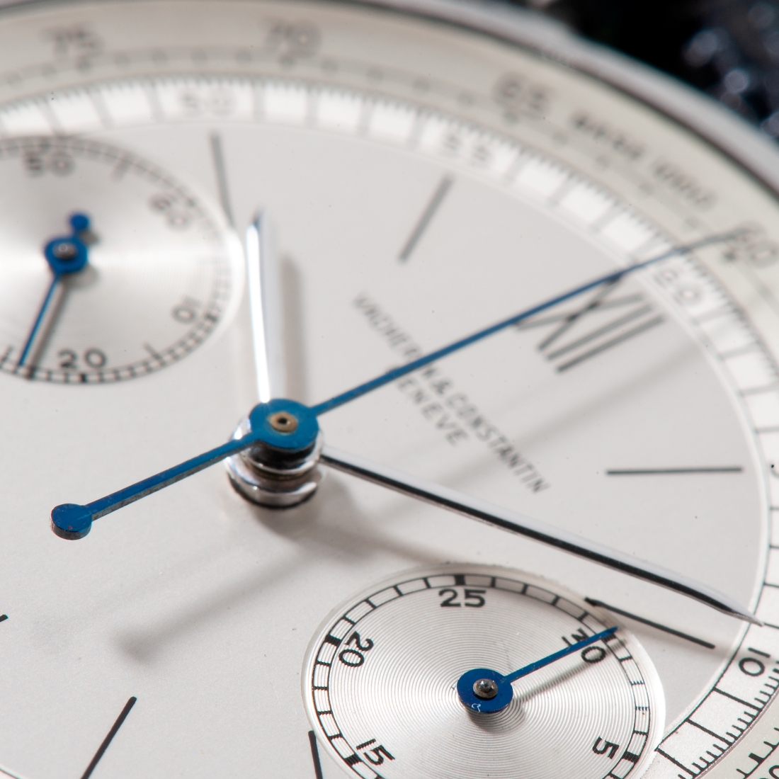 ミドルケースはバセロンらしいティアドロップラグが印象的で、線の細いローマ数字が品格を高めております。クロノ積算計は全てブルースチールに焼き入れされており、センターセコンドの”尾”の部分が他ブランドに比べて長いのも特徴の一つです。