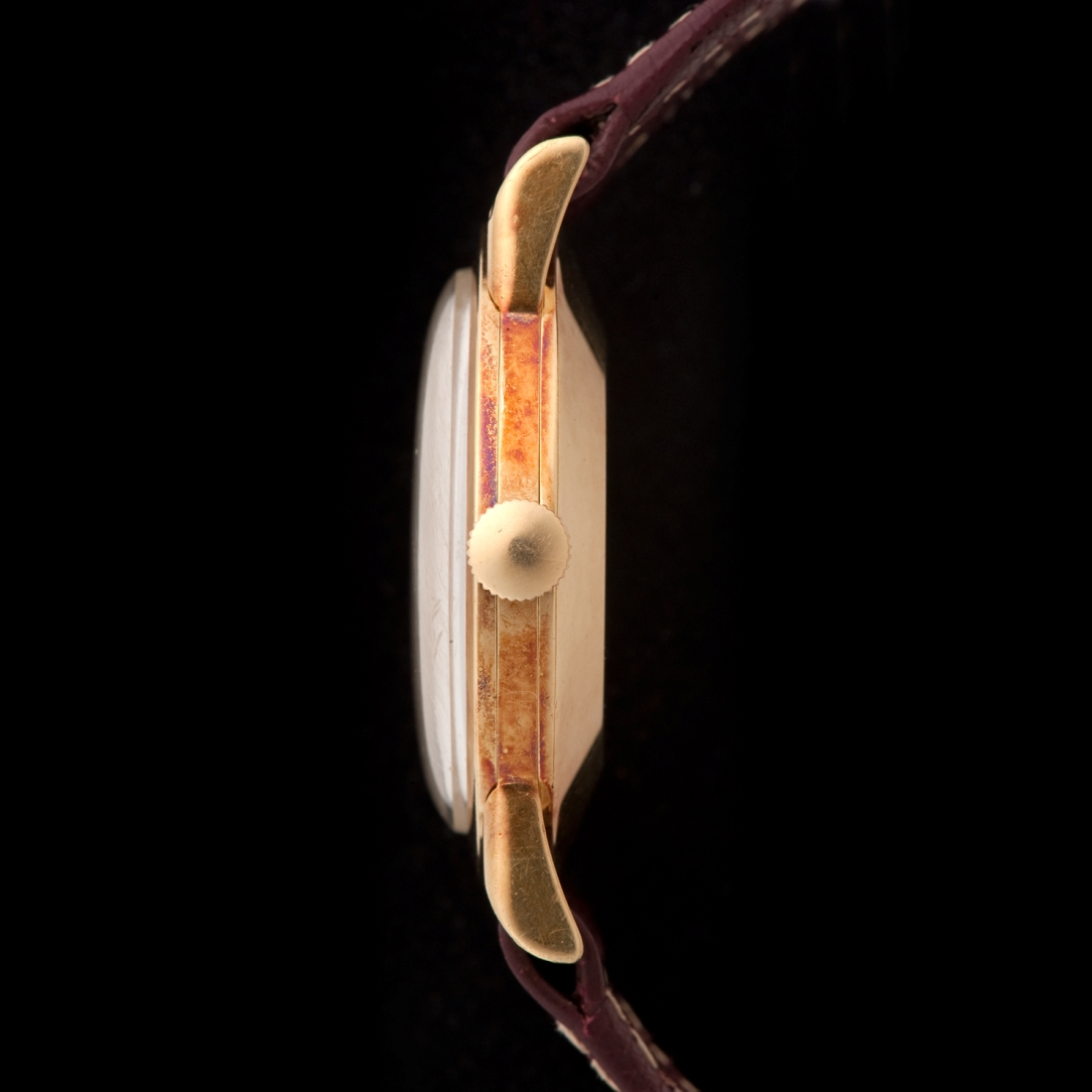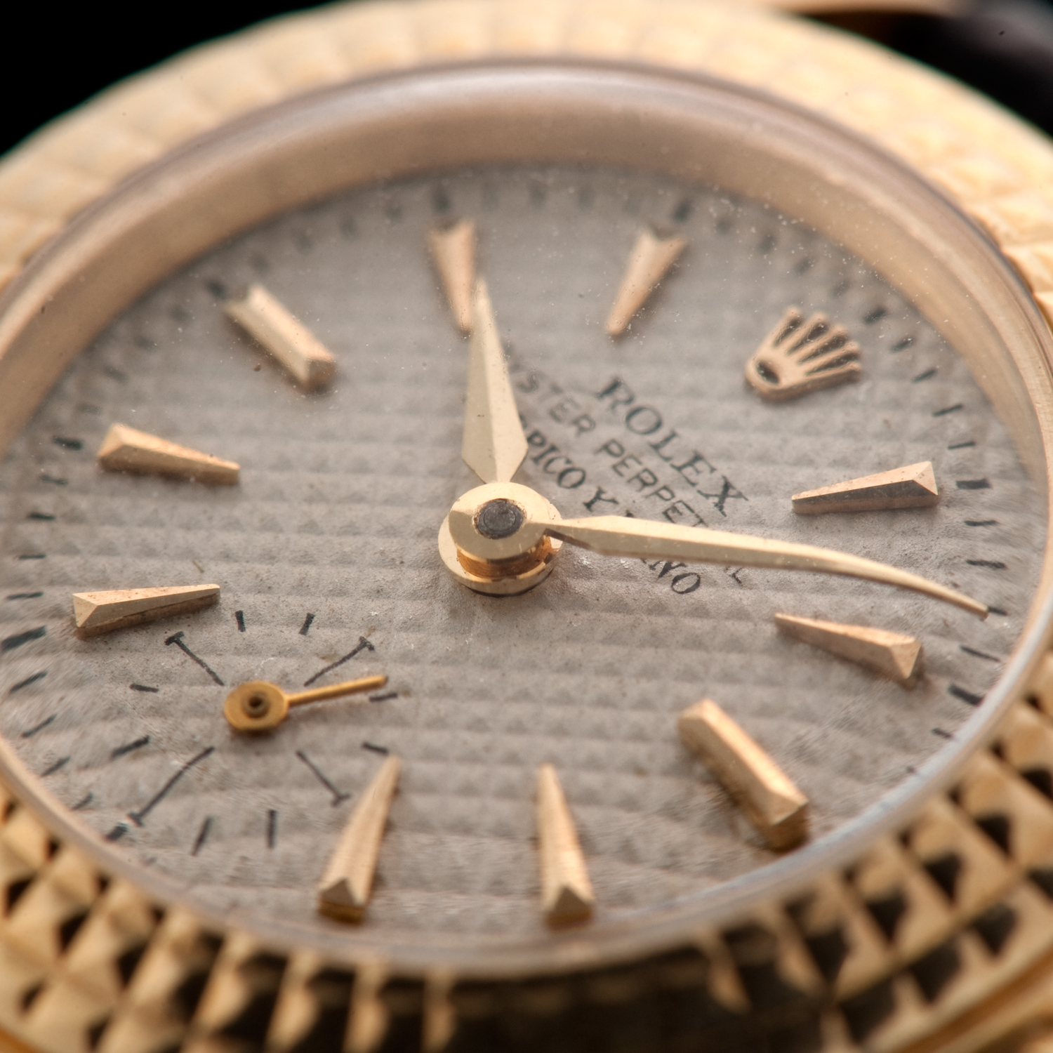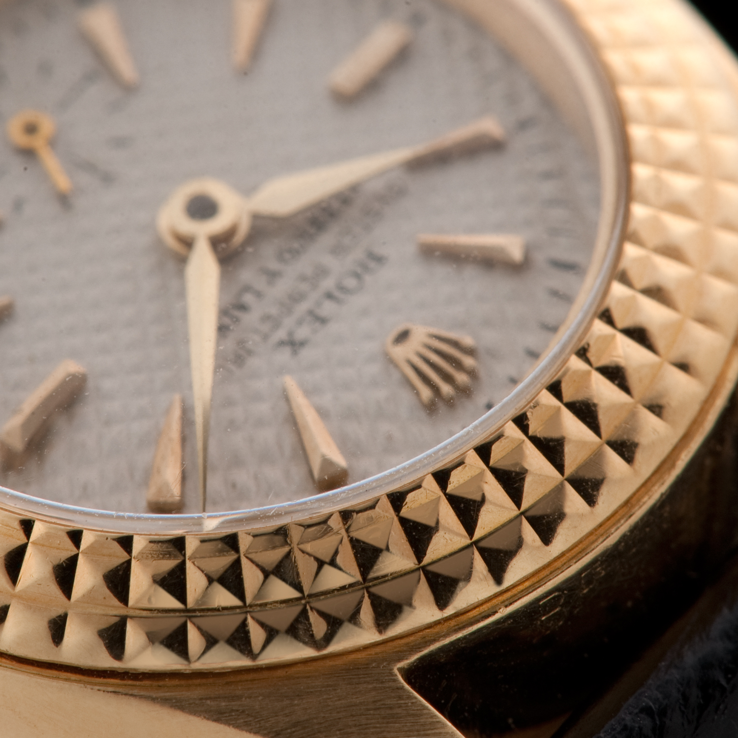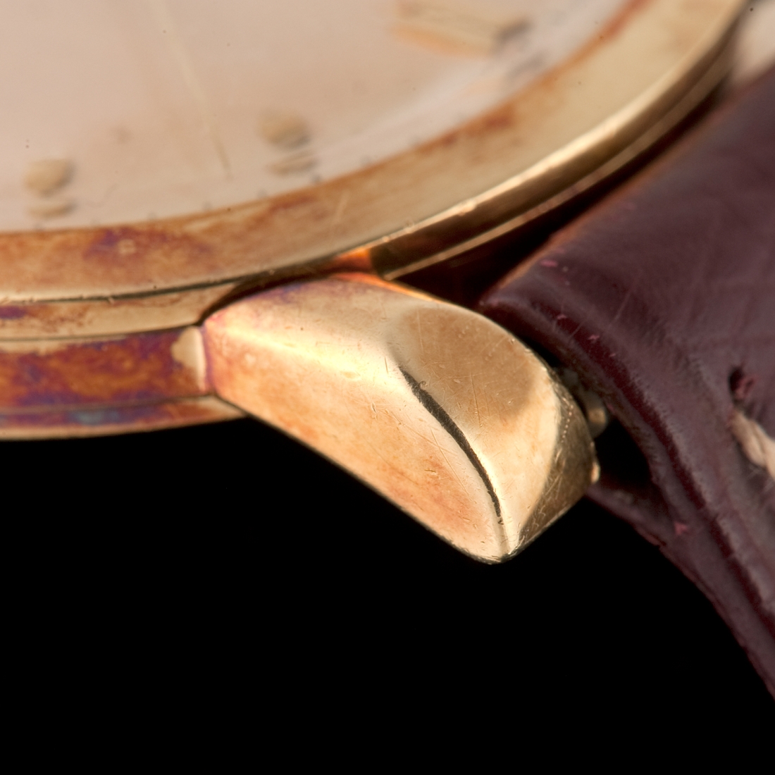 1950年代を代表するギョウシェダイアルを採用した時計ですが、18K素材のケースはダイアルと同様の立体的な彫りを加えたベゼルが最大の特徴です。幅広に設けたベゼルには面取りを加えた格子模様が三重に施されており、過度な仕上げを経ていないケースコンディションの為、立体的なベゼルの意匠をはじめ本来のシェイプが保たれております。