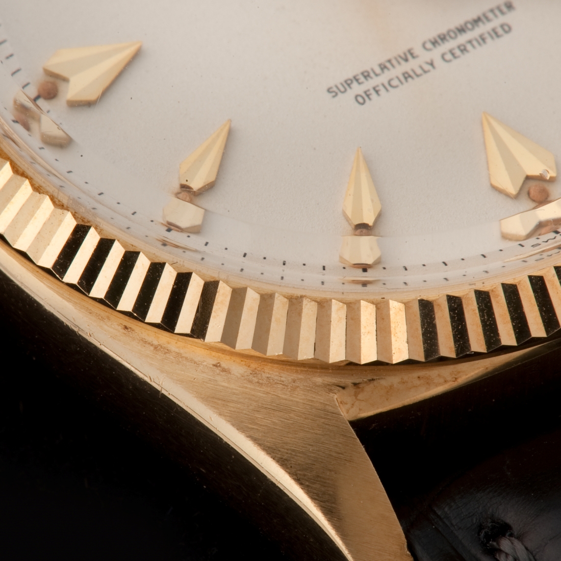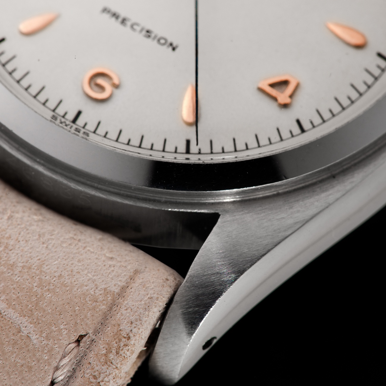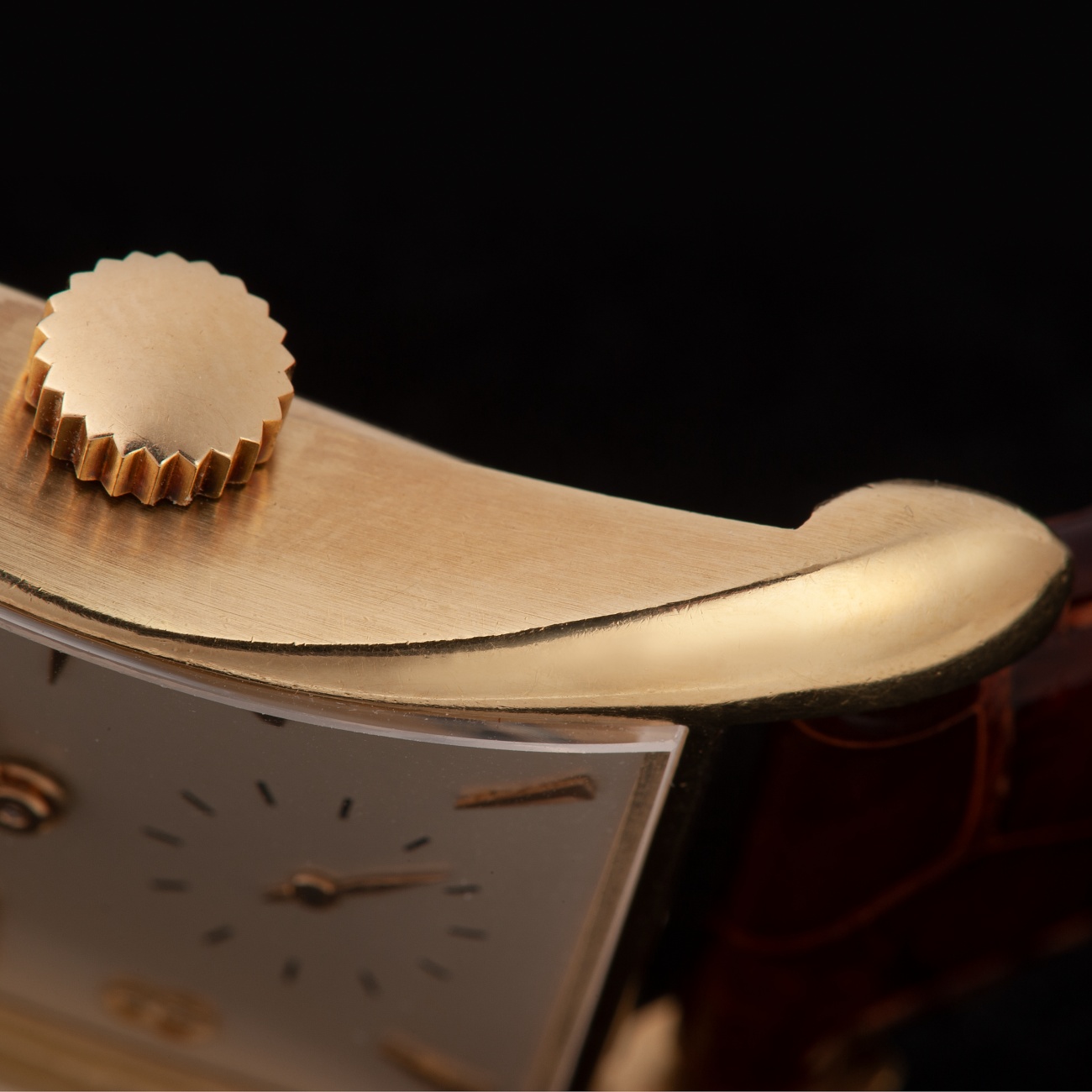 1950年代を代表するギョウシェダイアルを採用した時計ですが、18K素材のケースはダイアルと同様の立体的な彫りを加えたベゼルが最大の特徴です。幅広に設けたベゼルには面取りを加えた格子模様が三重に施されており、過度な仕上げを経ていないケースコンディションの為、立体的なベゼルの意匠をはじめ本来のシェイプが保たれております。
