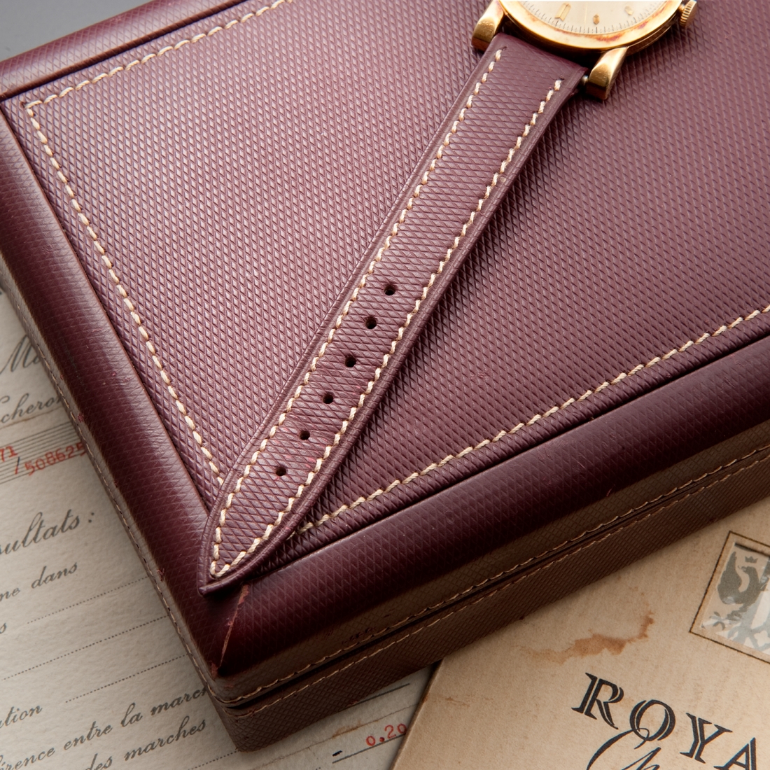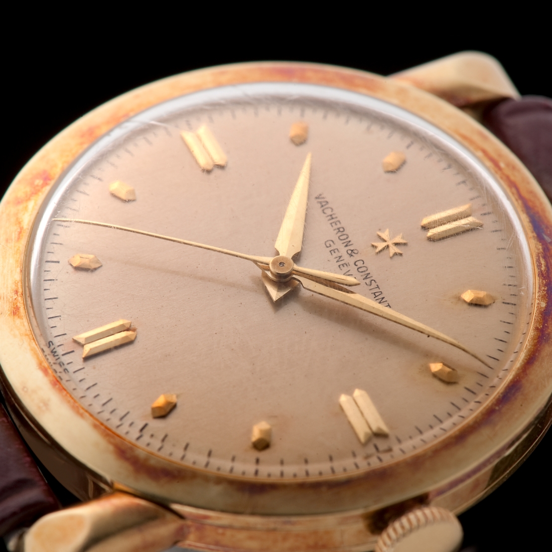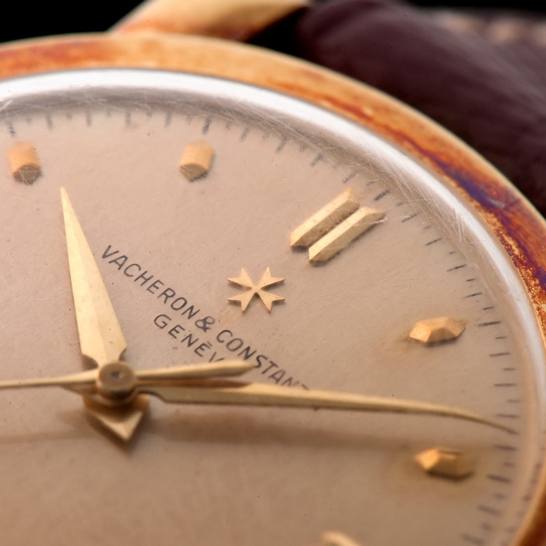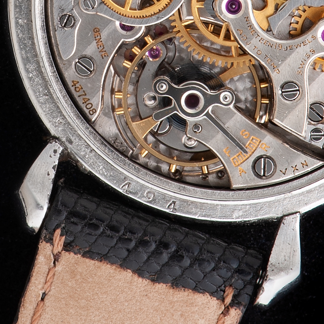 1950年代を代表するギョウシェダイアルを採用した時計ですが、18K素材のケースはダイアルと同様の立体的な彫りを加えたベゼルが最大の特徴です。幅広に設けたベゼルには面取りを加えた格子模様が三重に施されており、過度な仕上げを経ていないケースコンディションの為、立体的なベゼルの意匠をはじめ本来のシェイプが保たれております。