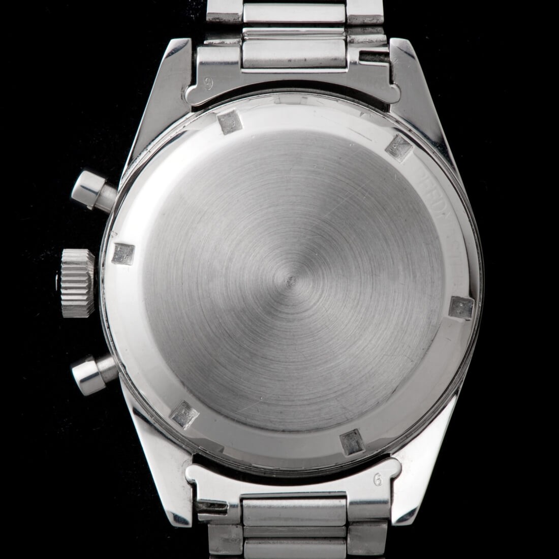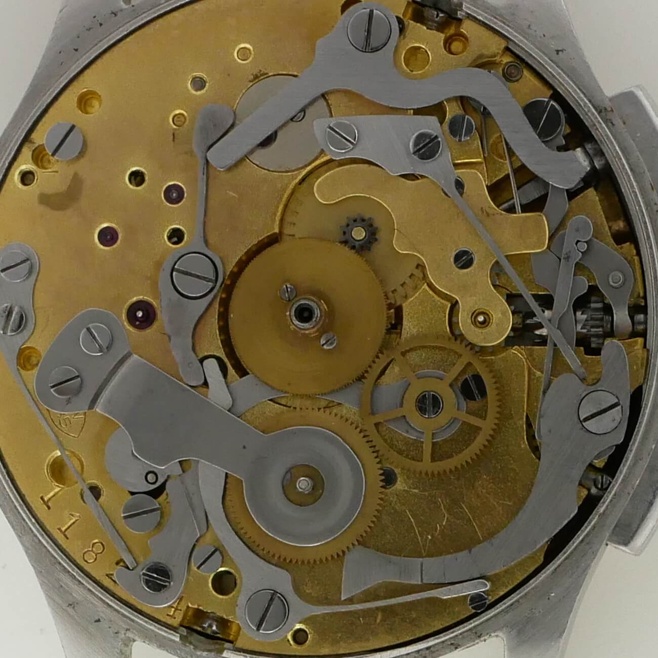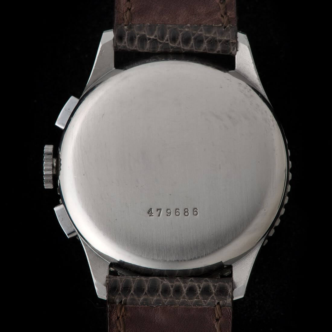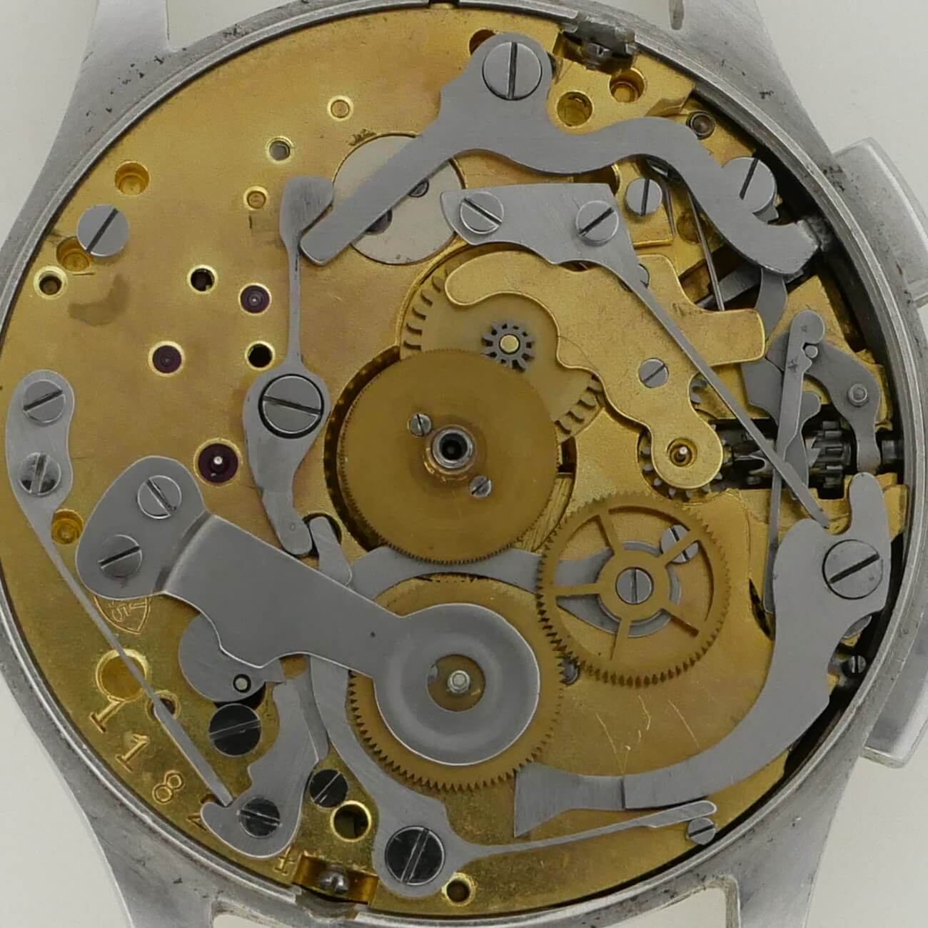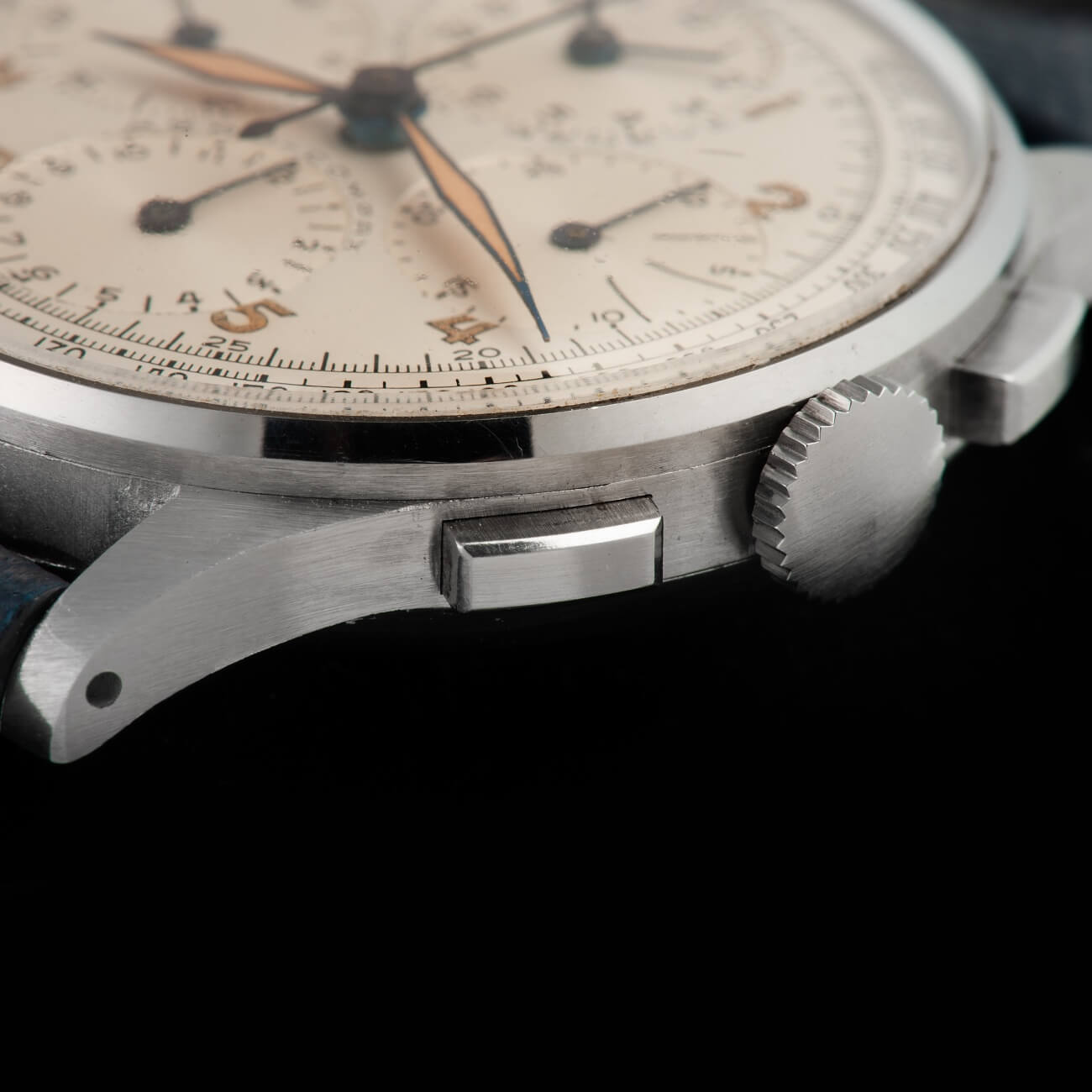 ヴィーナス搭載のモデルとの違いの一つがリューズからのプッシャーまでの距離で、2時プッシャーと4時プッシャーがアシンメトリー配置になる点を見る事でバルジュームーブメント搭載であることが分かります。また、ヴィーナス178搭載機のバックケースに入るRef”806″の刻印が多くの場合入らない点も特徴です。
