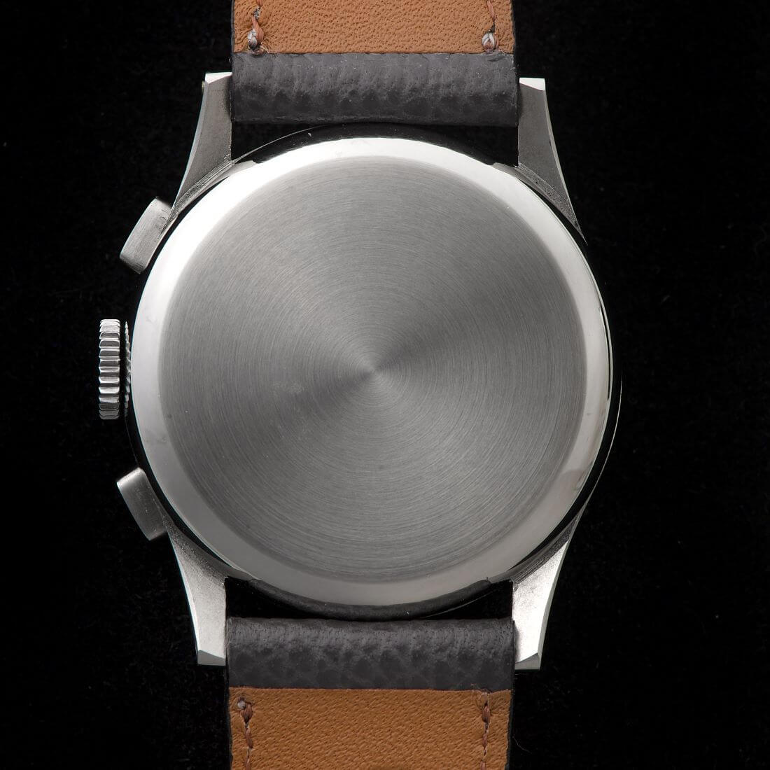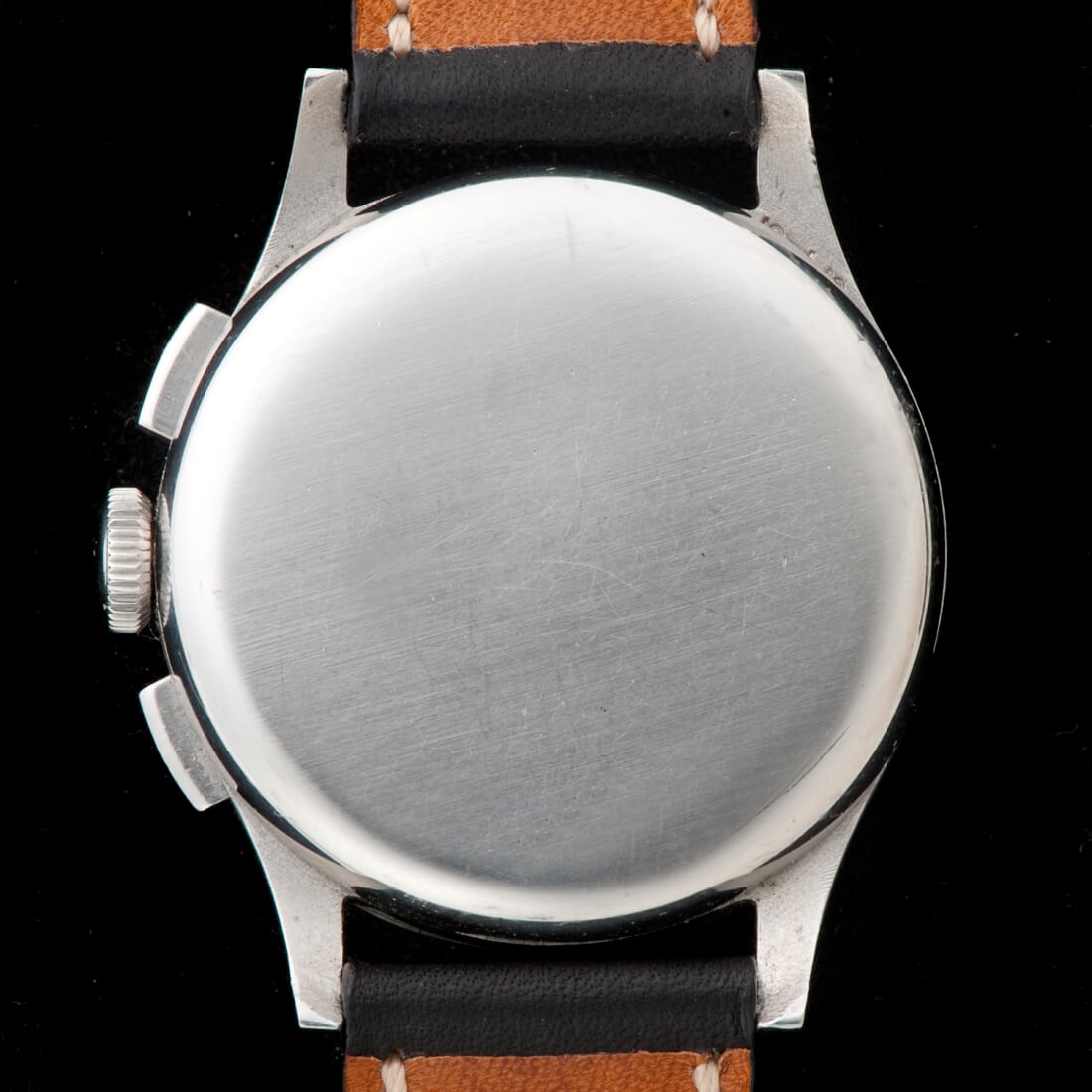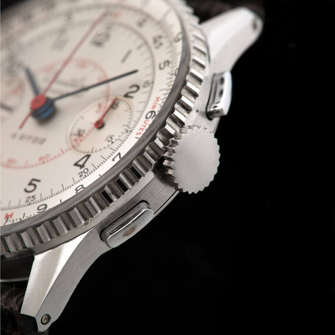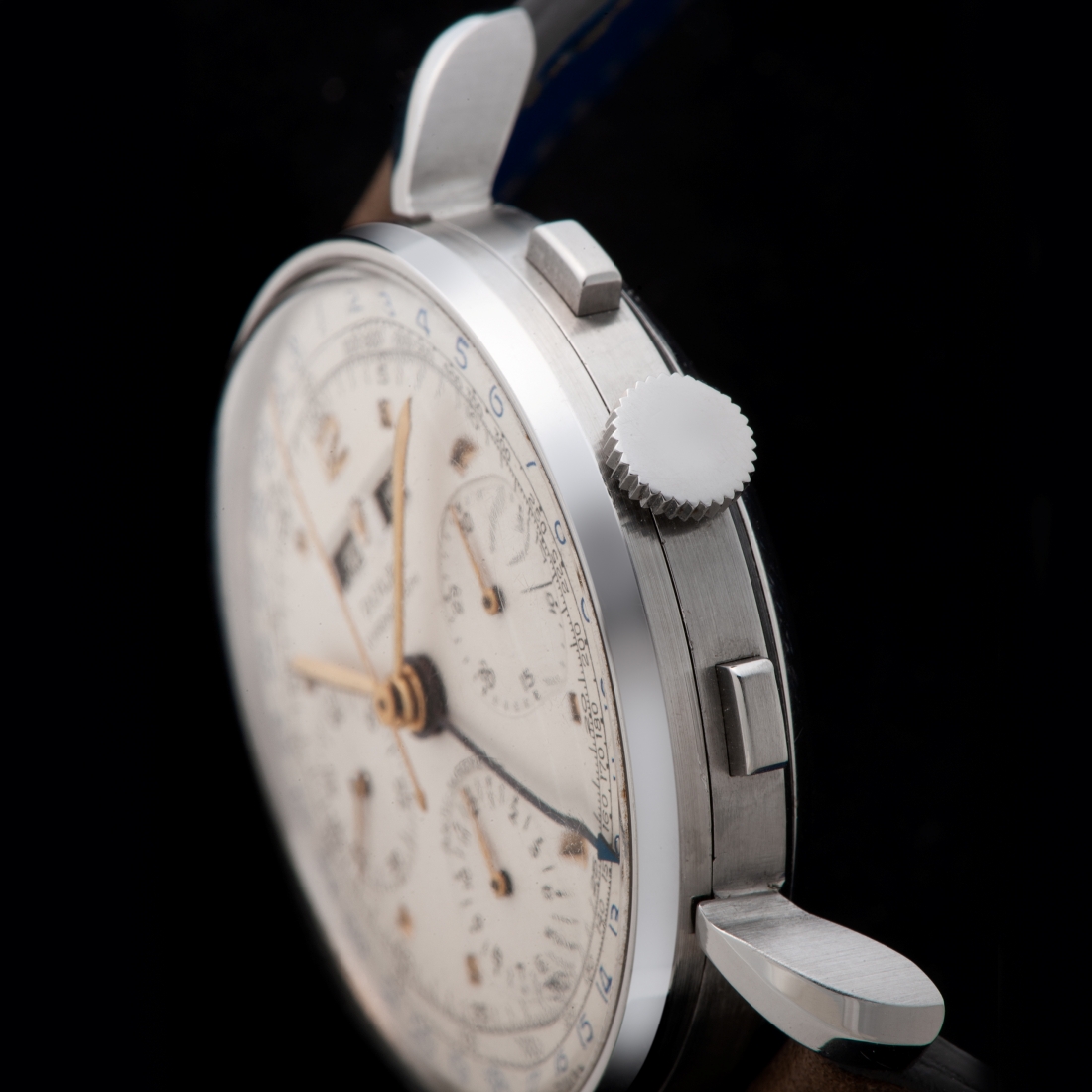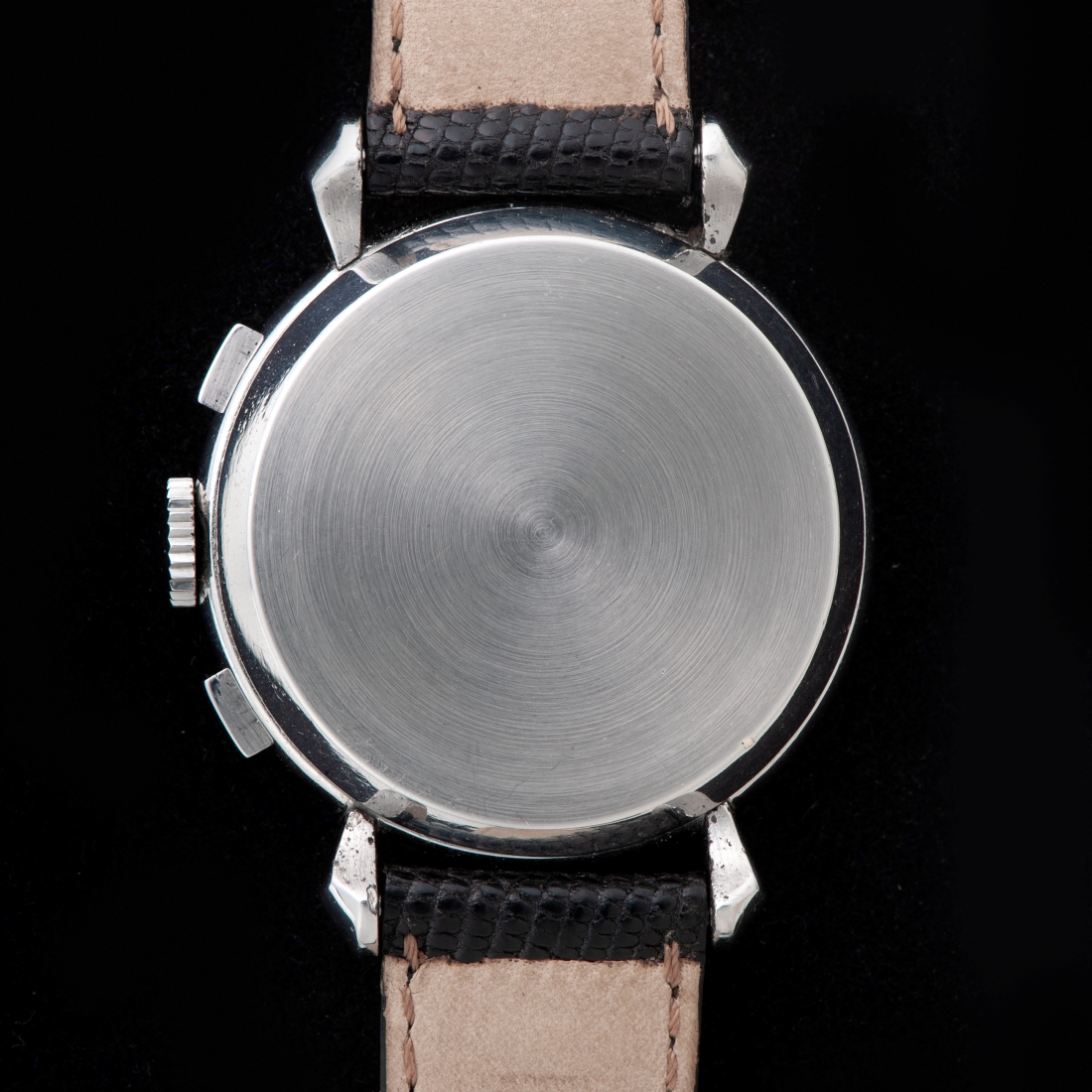 ヴィーナス搭載のモデルとの違いの一つがリューズからのプッシャーまでの距離で、2時プッシャーと4時プッシャーがアシンメトリー配置になる点を見る事でバルジュームーブメント搭載であることが分かります。また、ヴィーナス178搭載機のバックケースに入るRef”806″の刻印が多くの場合入らない点も特徴です。