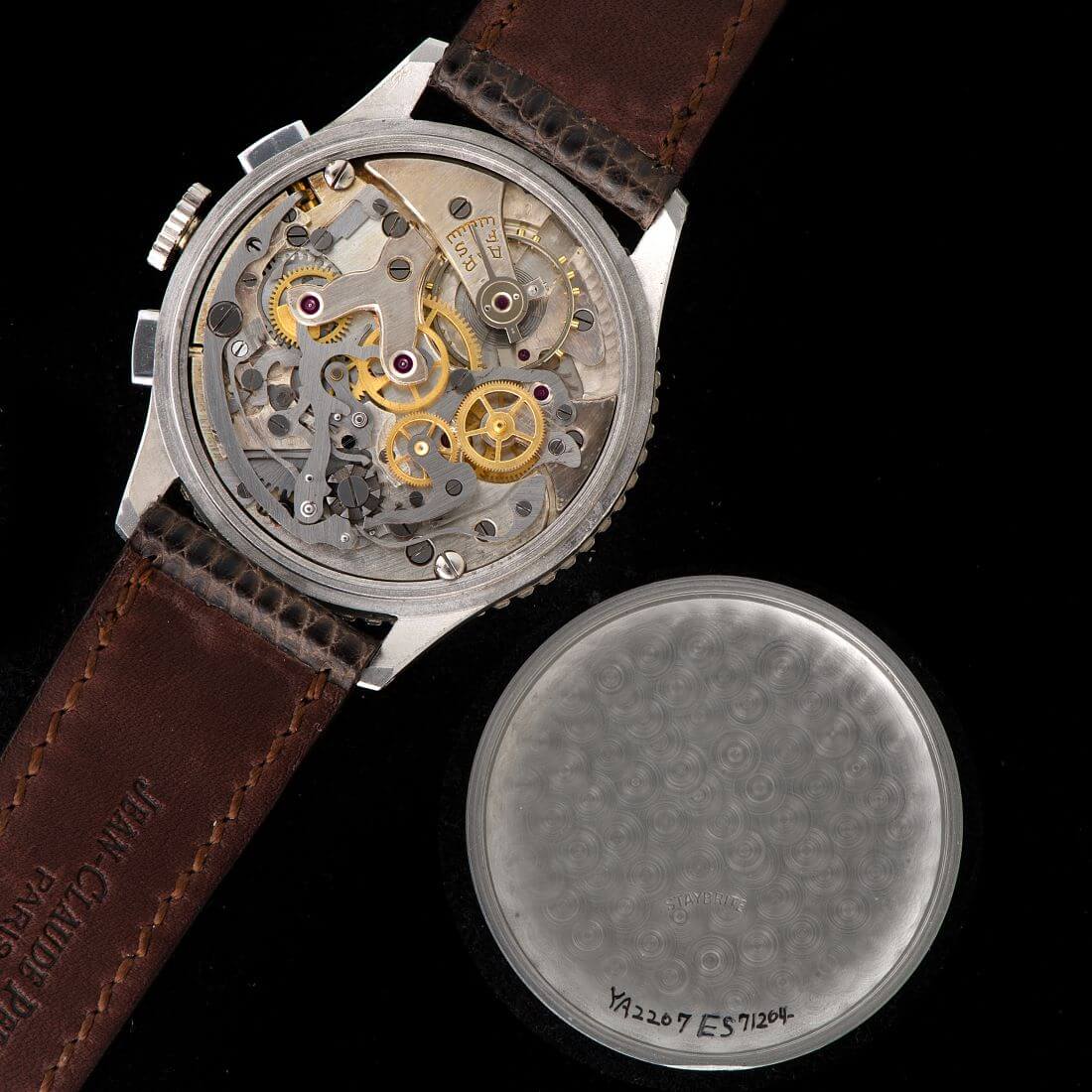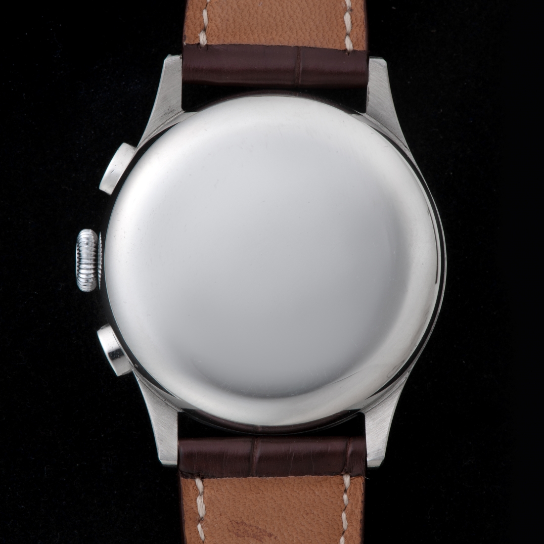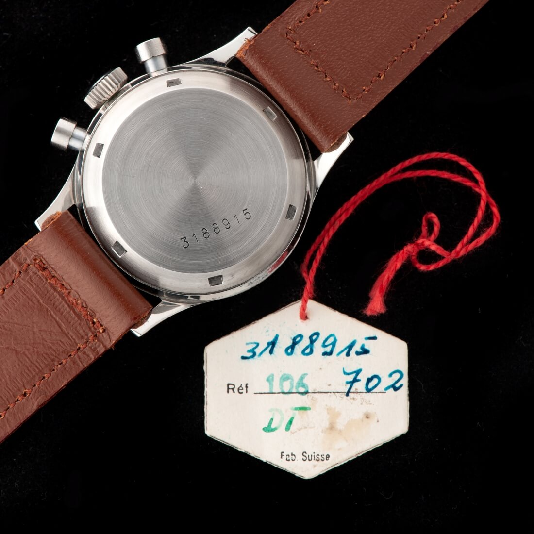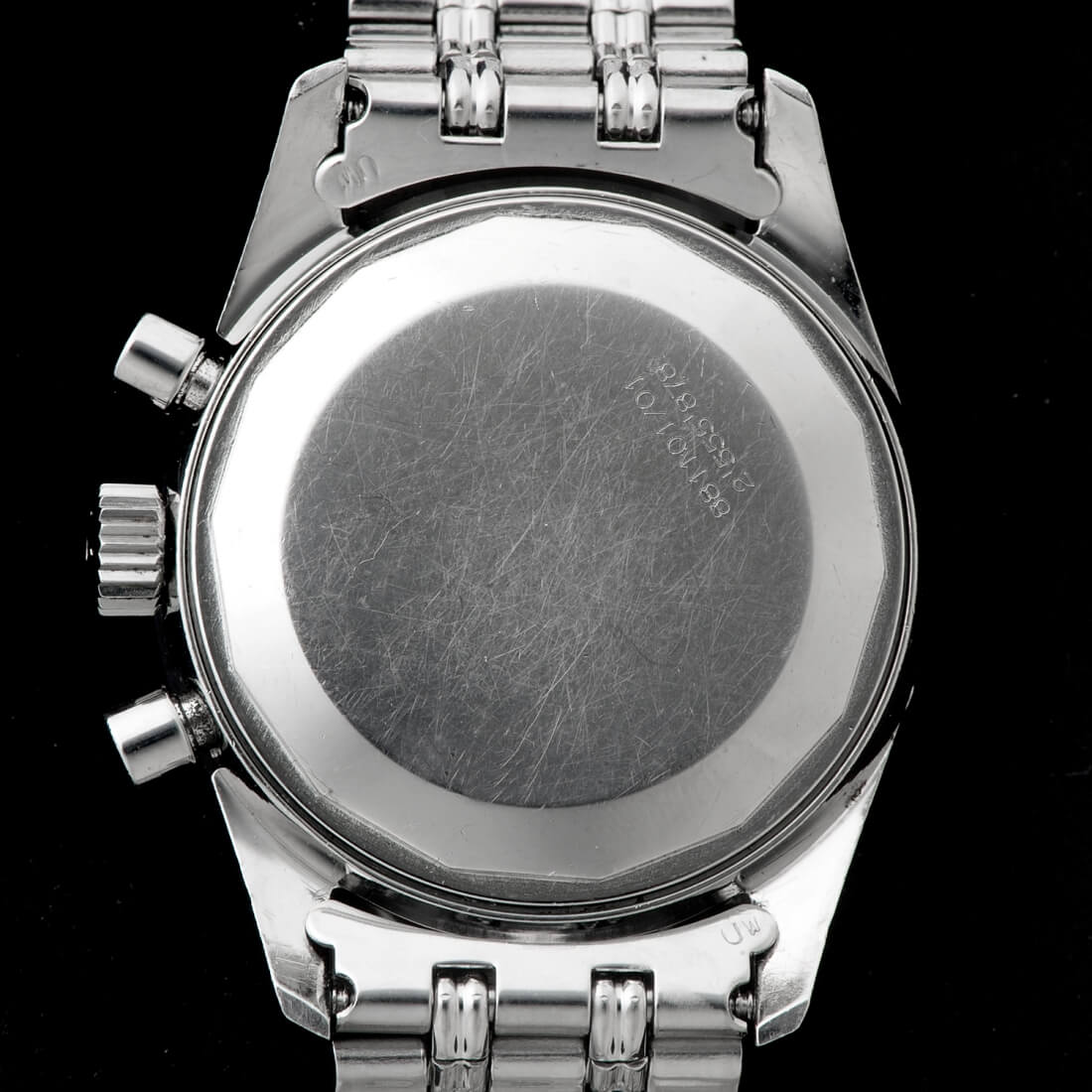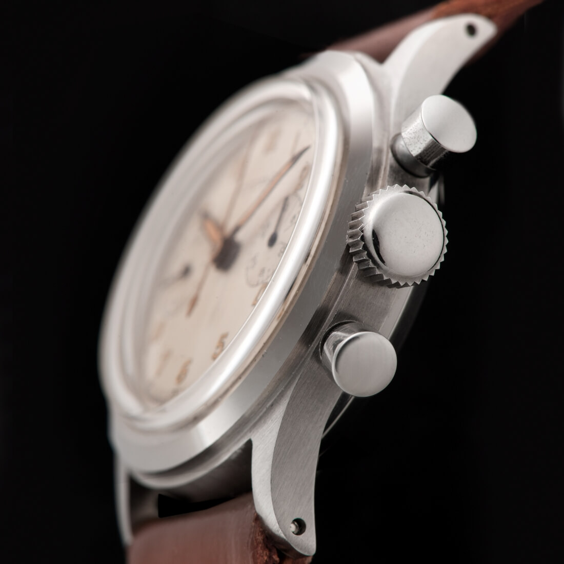 ヴィーナス搭載のモデルとの違いの一つがリューズからのプッシャーまでの距離で、2時プッシャーと4時プッシャーがアシンメトリー配置になる点を見る事でバルジュームーブメント搭載であることが分かります。また、ヴィーナス178搭載機のバックケースに入るRef”806″の刻印が多くの場合入らない点も特徴です。