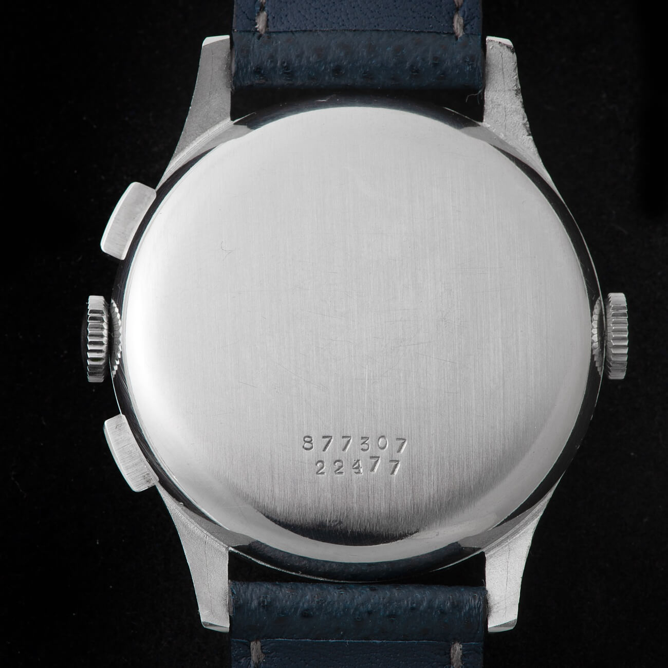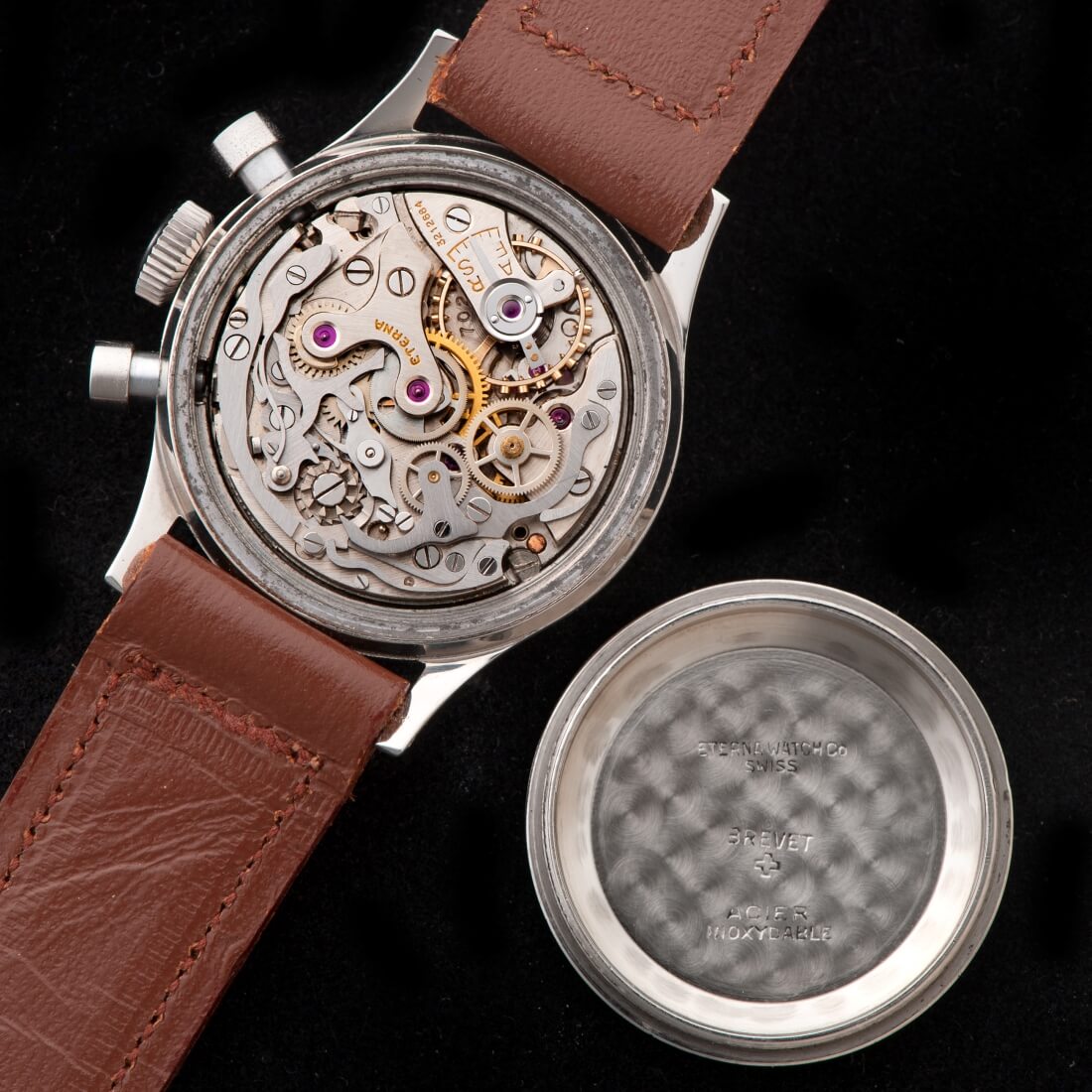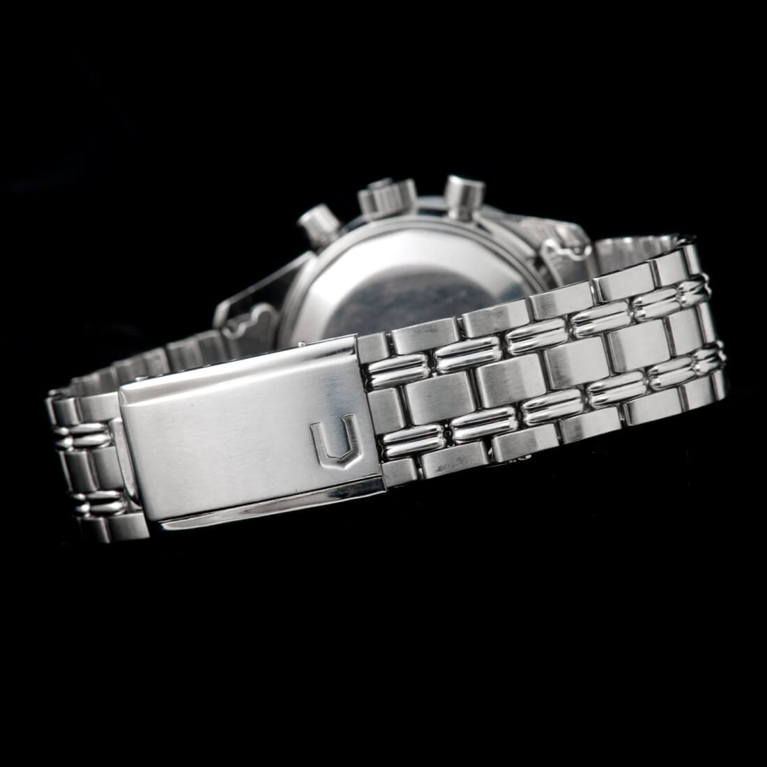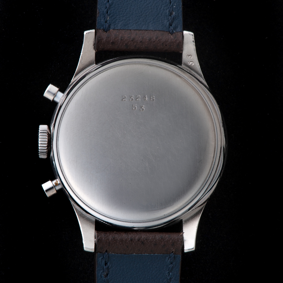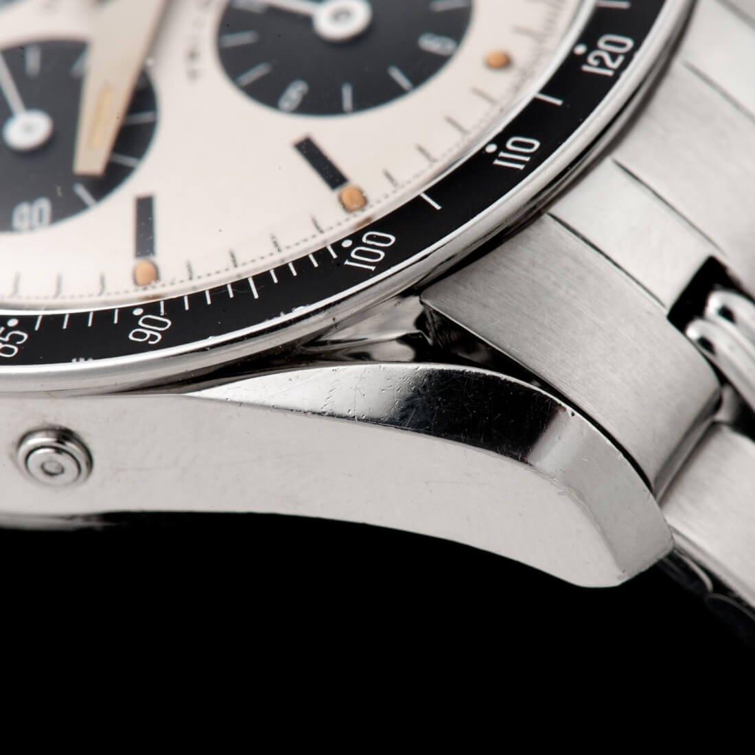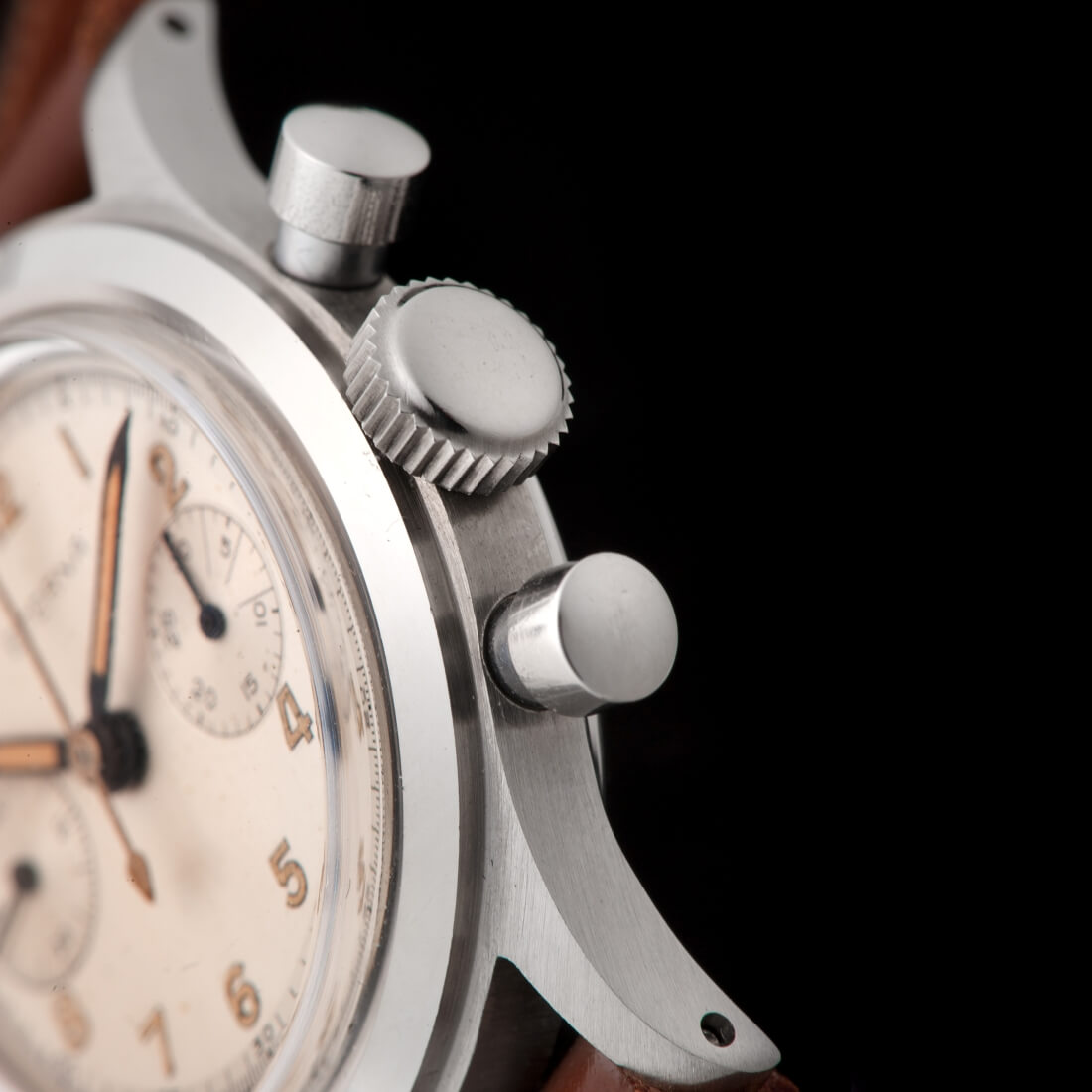 ヴィーナス搭載のモデルとの違いの一つがリューズからのプッシャーまでの距離で、2時プッシャーと4時プッシャーがアシンメトリー配置になる点を見る事でバルジュームーブメント搭載であることが分かります。また、ヴィーナス178搭載機のバックケースに入るRef”806″の刻印が多くの場合入らない点も特徴です。