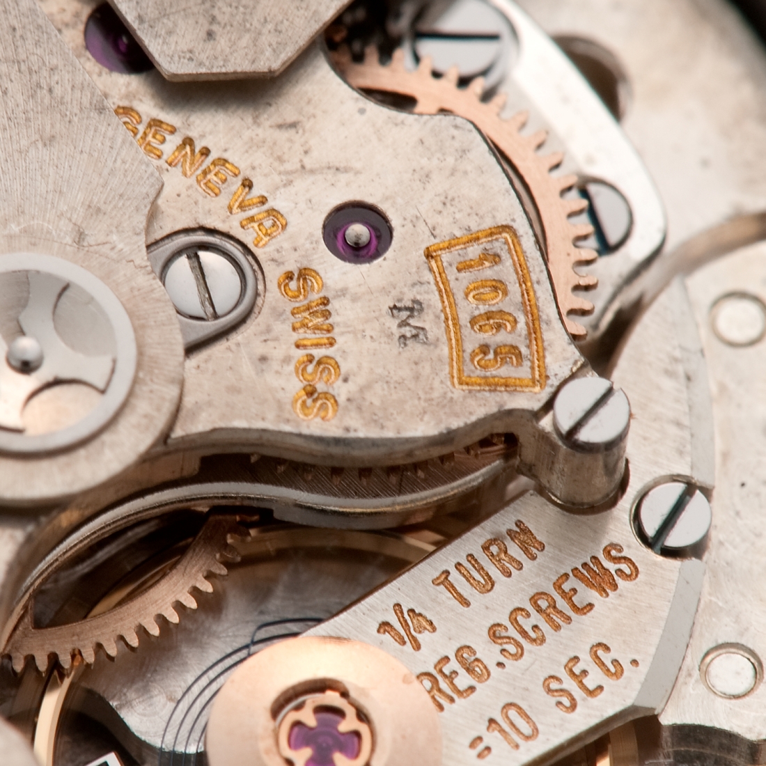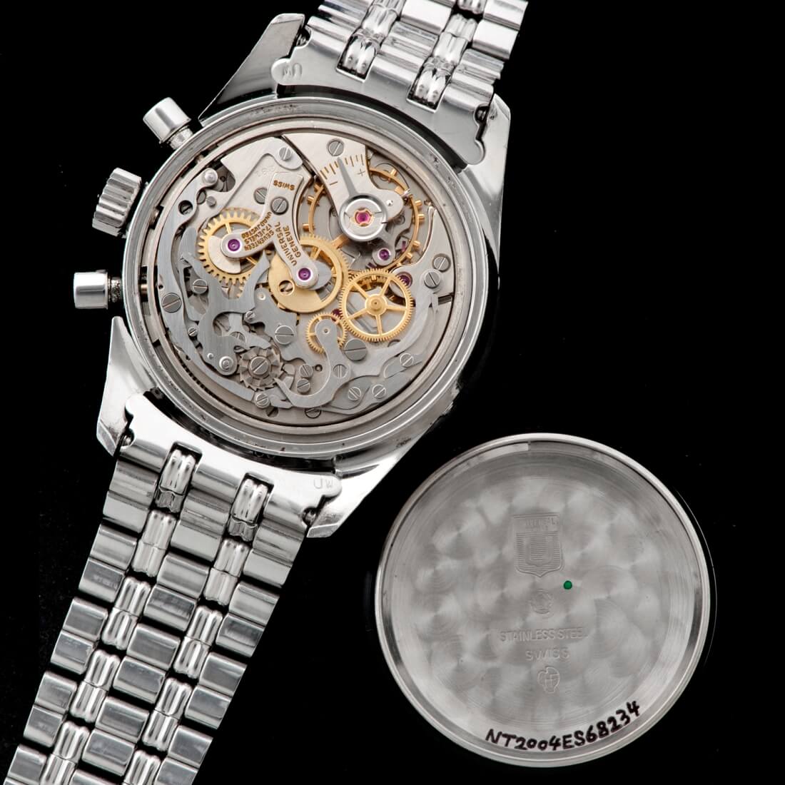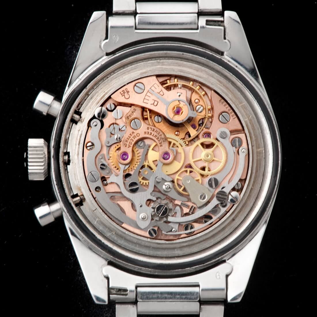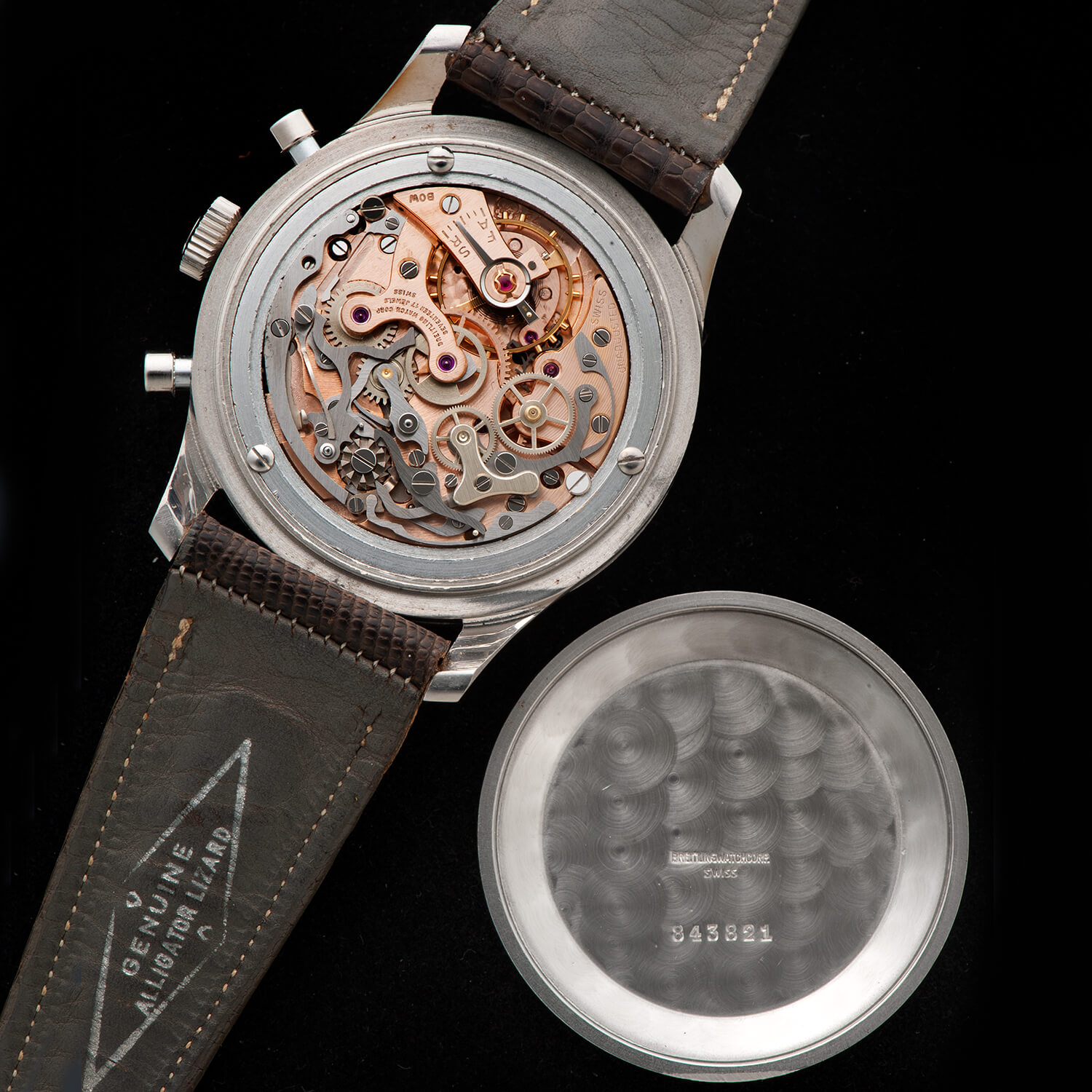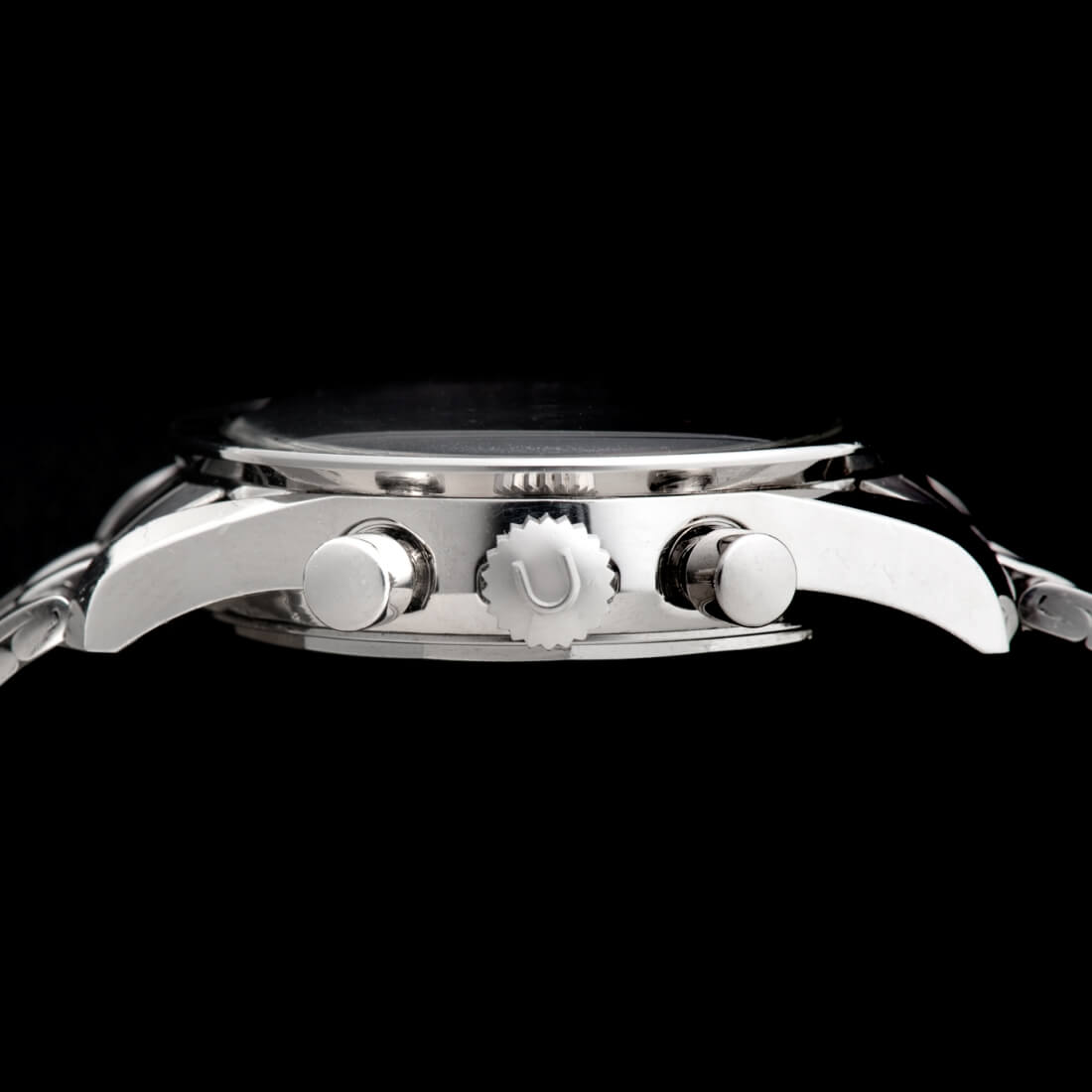 ヴィーナス搭載のモデルとの違いの一つがリューズからのプッシャーまでの距離で、2時プッシャーと4時プッシャーがアシンメトリー配置になる点を見る事でバルジュームーブメント搭載であることが分かります。また、ヴィーナス178搭載機のバックケースに入るRef”806″の刻印が多くの場合入らない点も特徴です。