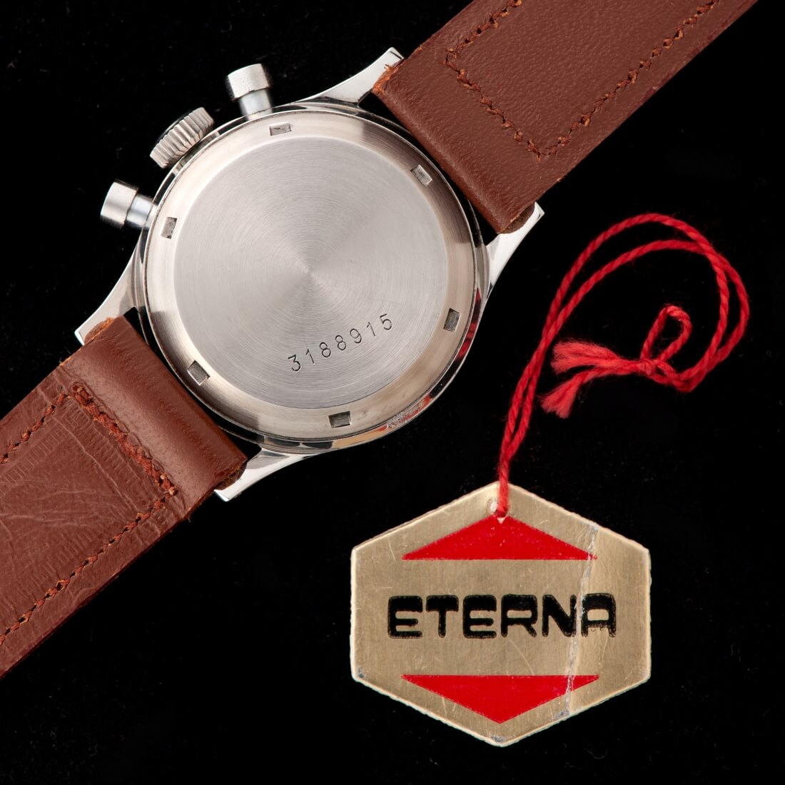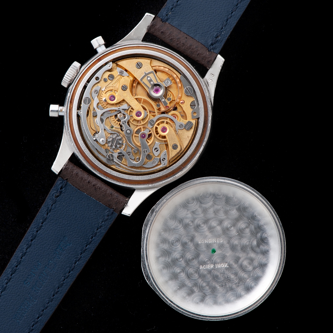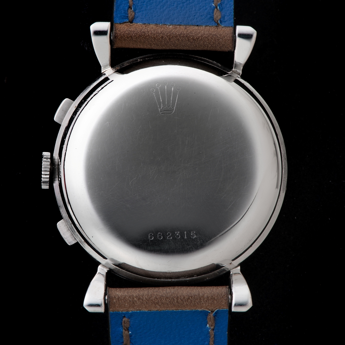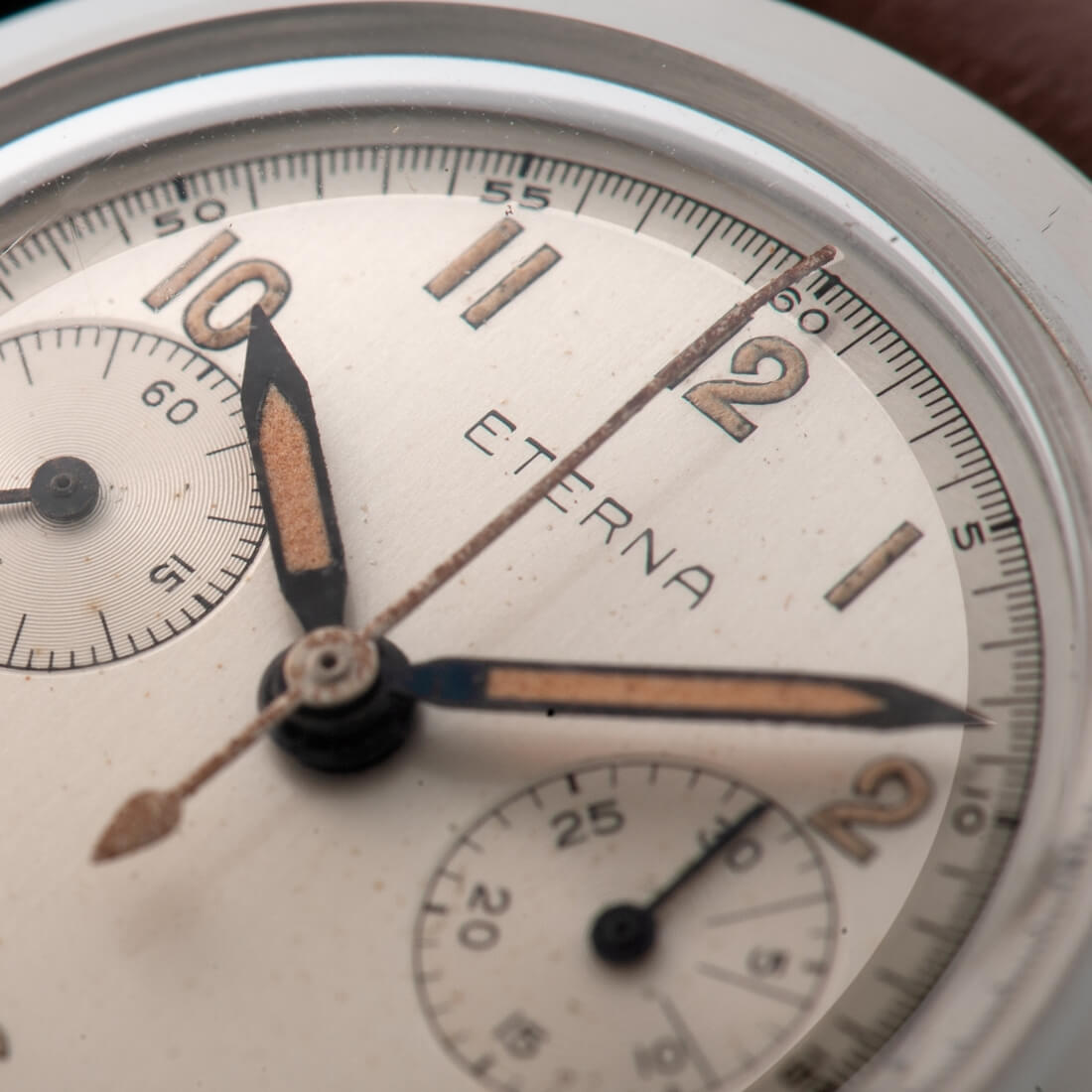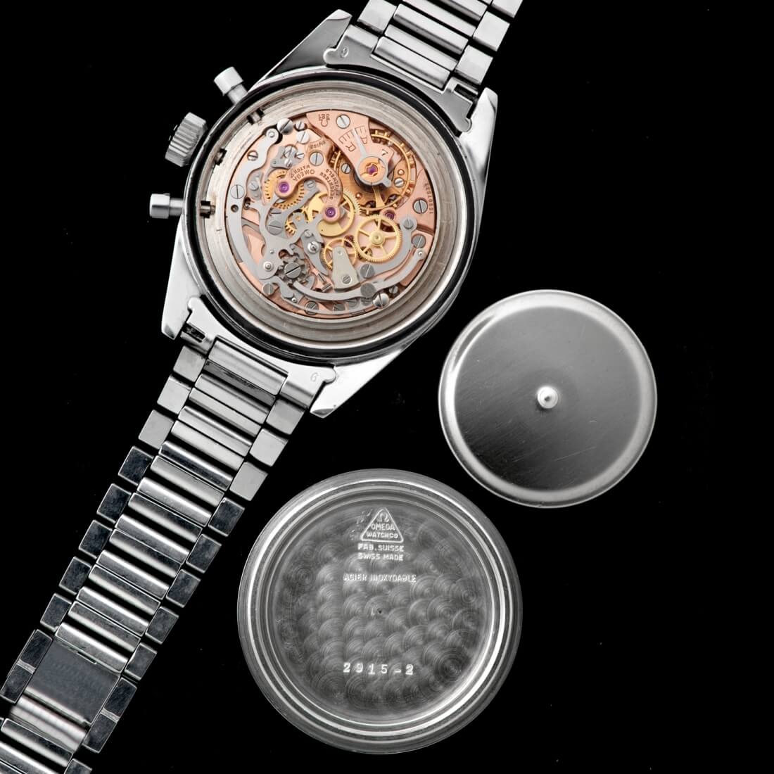 ヴィーナス搭載のモデルとの違いの一つがリューズからのプッシャーまでの距離で、2時プッシャーと4時プッシャーがアシンメトリー配置になる点を見る事でバルジュームーブメント搭載であることが分かります。また、ヴィーナス178搭載機のバックケースに入るRef”806″の刻印が多くの場合入らない点も特徴です。