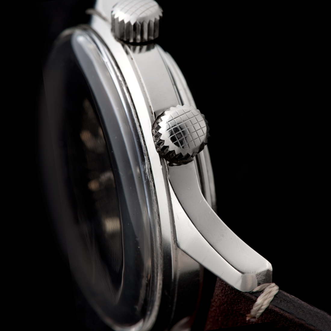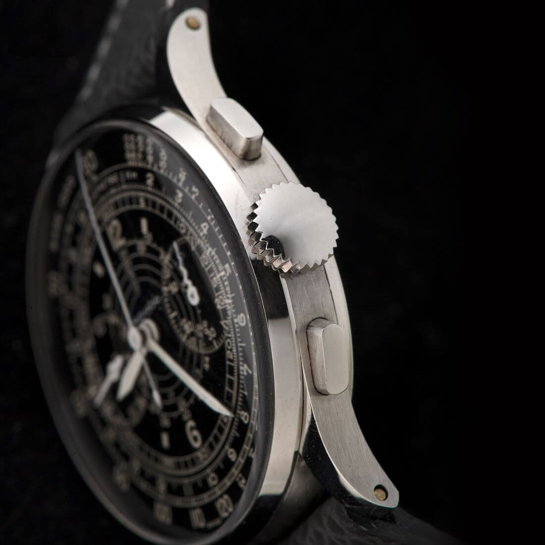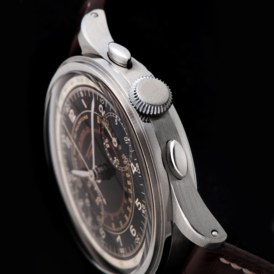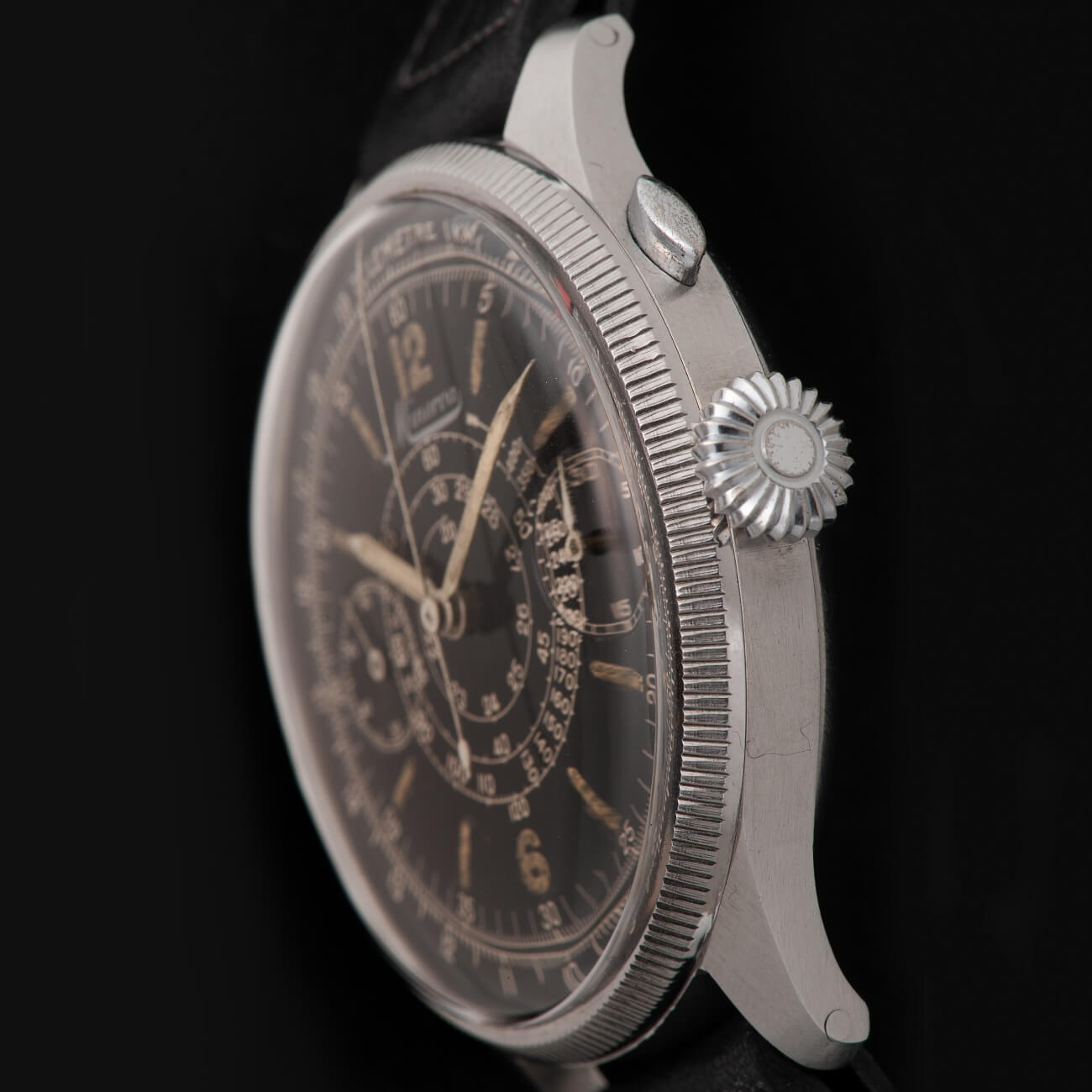 ワンプッシュタイプとツープッシュタイプがあります。ケース径46mmは希少性が高く、なおかつ回転ベゼルを備えている物はめったに見る事ができないモデルです。艶を十分に残したブラックミラーダイアルは、ケース径と相まって非常に迫力を感じます。ダイアルの夜光塗料はアンタッチのラジウム。クラシカルな菊型リューズが付くミドルケースはアンポリッシュで、コインエッジタイプの赤いマーカーが付く回転ベゼルは、ゼロマーカーとして経過時間の確認に使用されます。ムーブメントは自社製のCal.9CH が搭載されております。