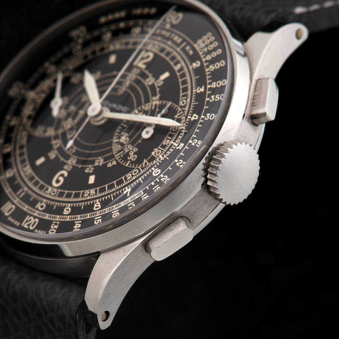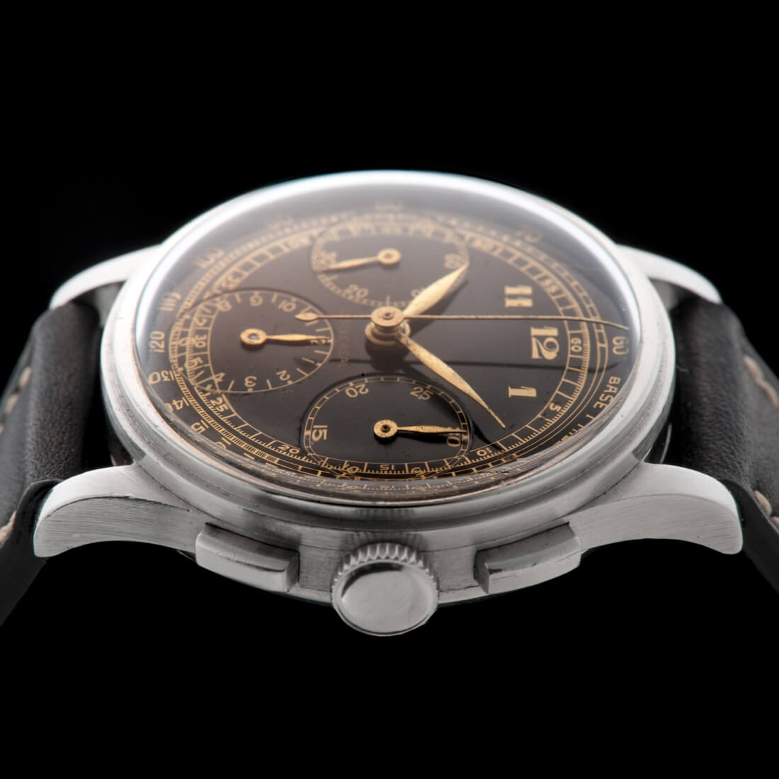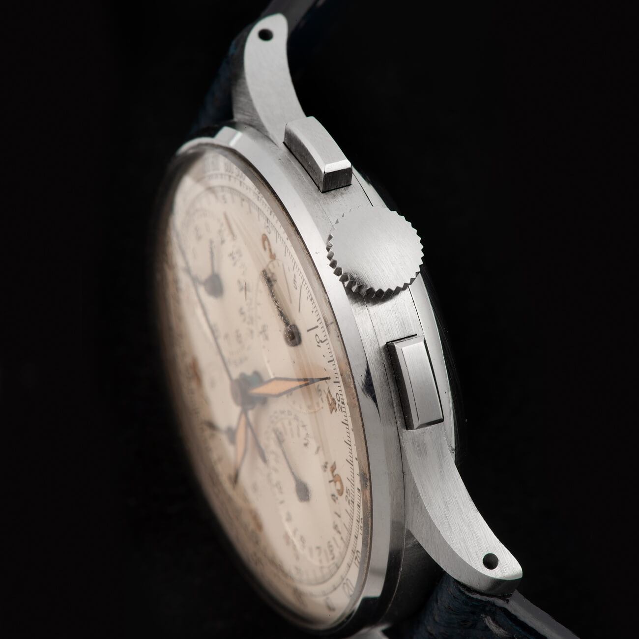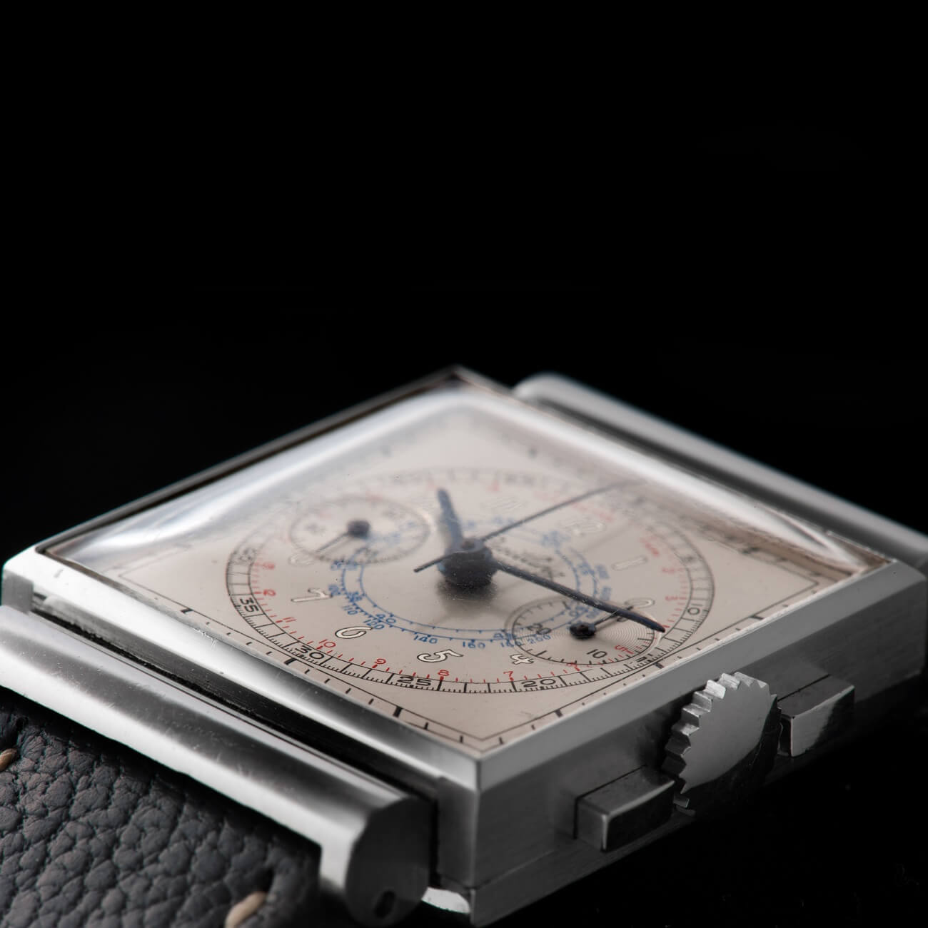 1930年代~1940年代にごく一部のメーカーがこの様な角型のクロノグラフを作りました。「ROLEX」「UNIVERSAL」などでも稀に見かけます。本品はほとんど磨きが入っていないケースコンディションでラグのデザインに大きな特徴があり、一直線でカバーされております。ダイアルは赤やブルーのスケールがアクセントを加えております。ムーヴメントは「Valjoux 69」が搭載されています。