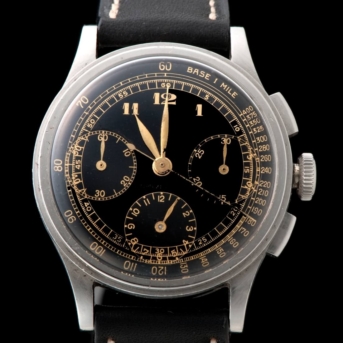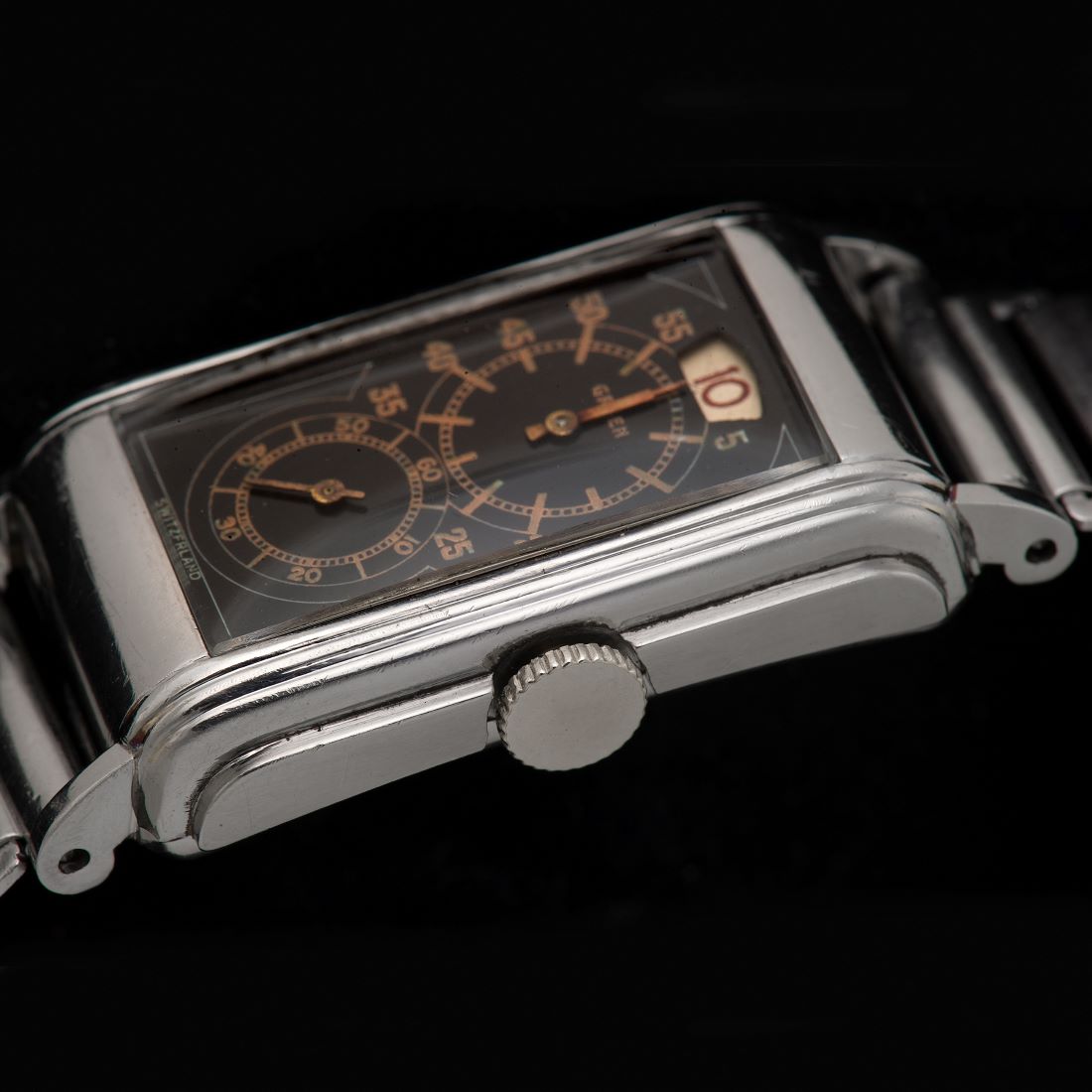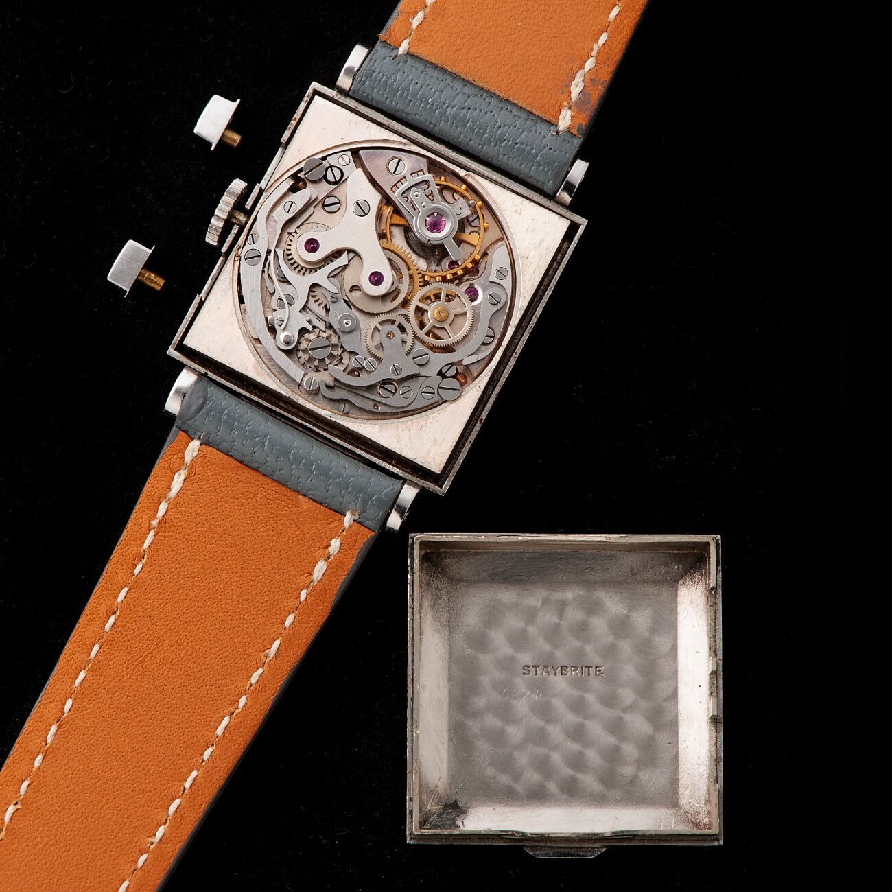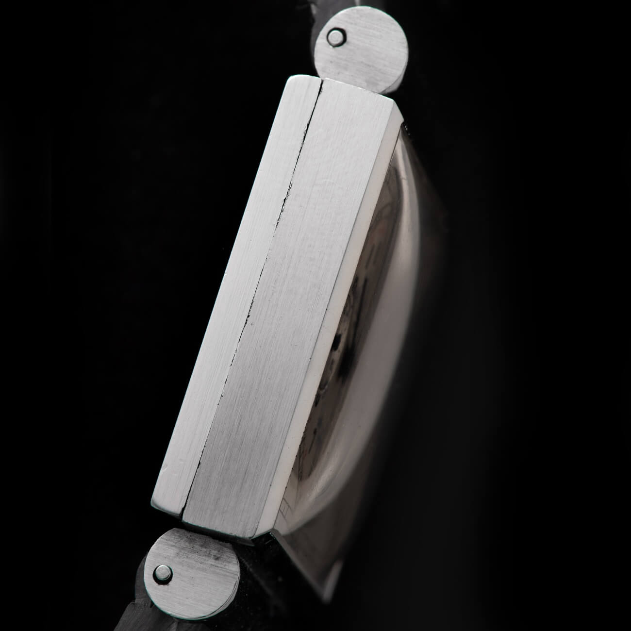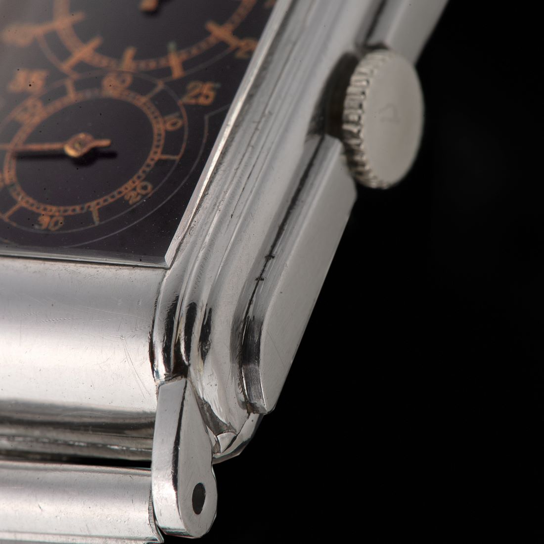 1930年代~1940年代にごく一部のメーカーがこの様な角型のクロノグラフを作りました。「ROLEX」「UNIVERSAL」などでも稀に見かけます。本品はほとんど磨きが入っていないケースコンディションでラグのデザインに大きな特徴があり、一直線でカバーされております。ダイアルは赤やブルーのスケールがアクセントを加えております。ムーヴメントは「Valjoux 69」が搭載されています。