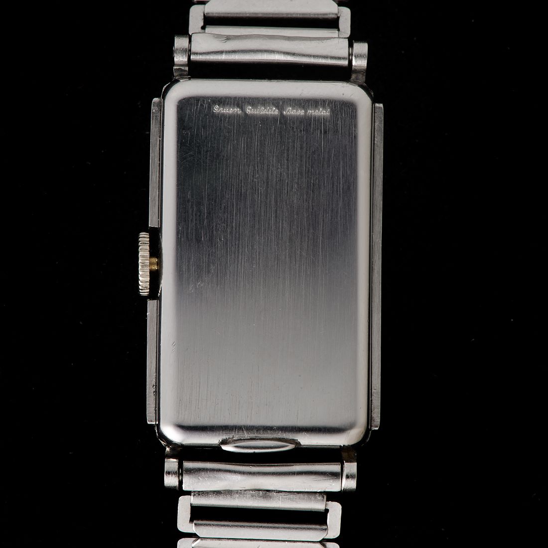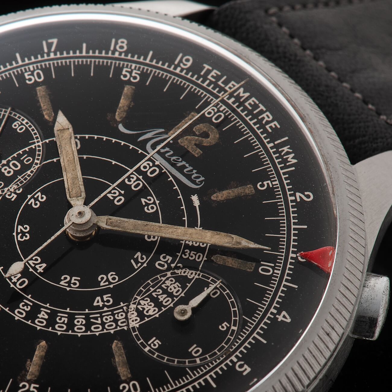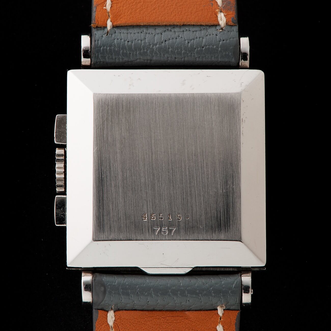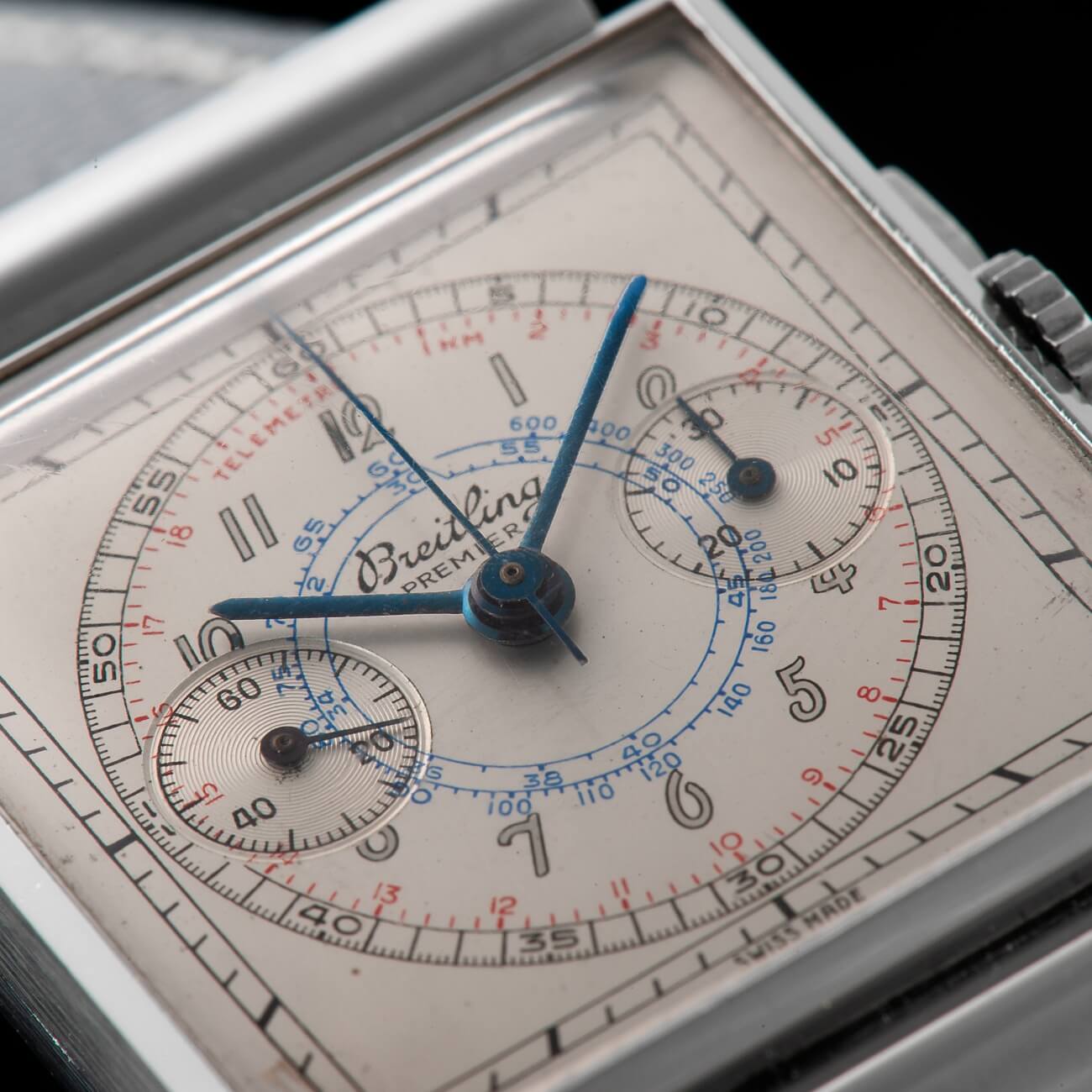 1930年代~1940年代にごく一部のメーカーがこの様な角型のクロノグラフを作りました。「ROLEX」「UNIVERSAL」などでも稀に見かけます。本品はほとんど磨きが入っていないケースコンディションでラグのデザインに大きな特徴があり、一直線でカバーされております。ダイアルは赤やブルーのスケールがアクセントを加えております。ムーヴメントは「Valjoux 69」が搭載されています。