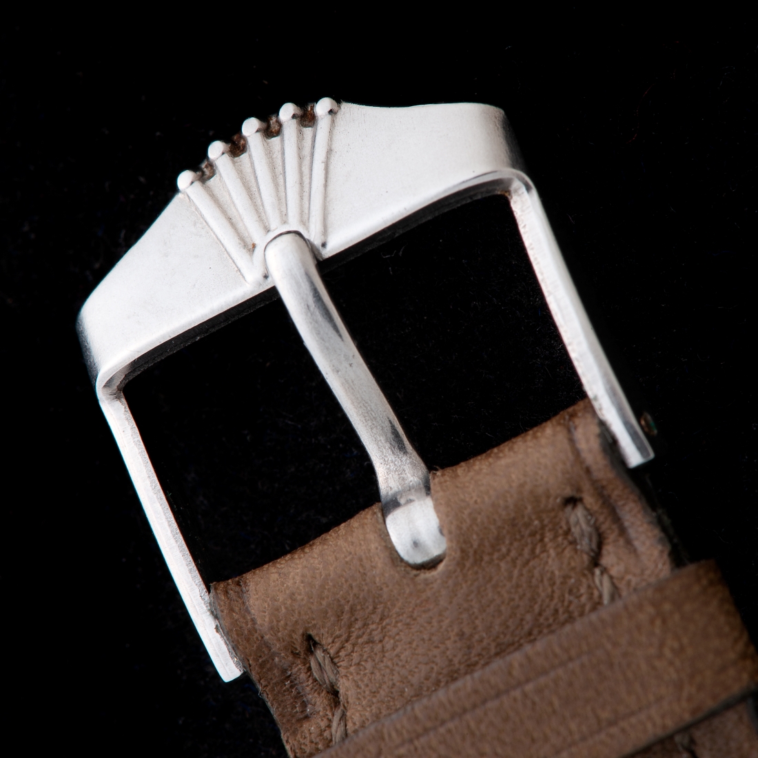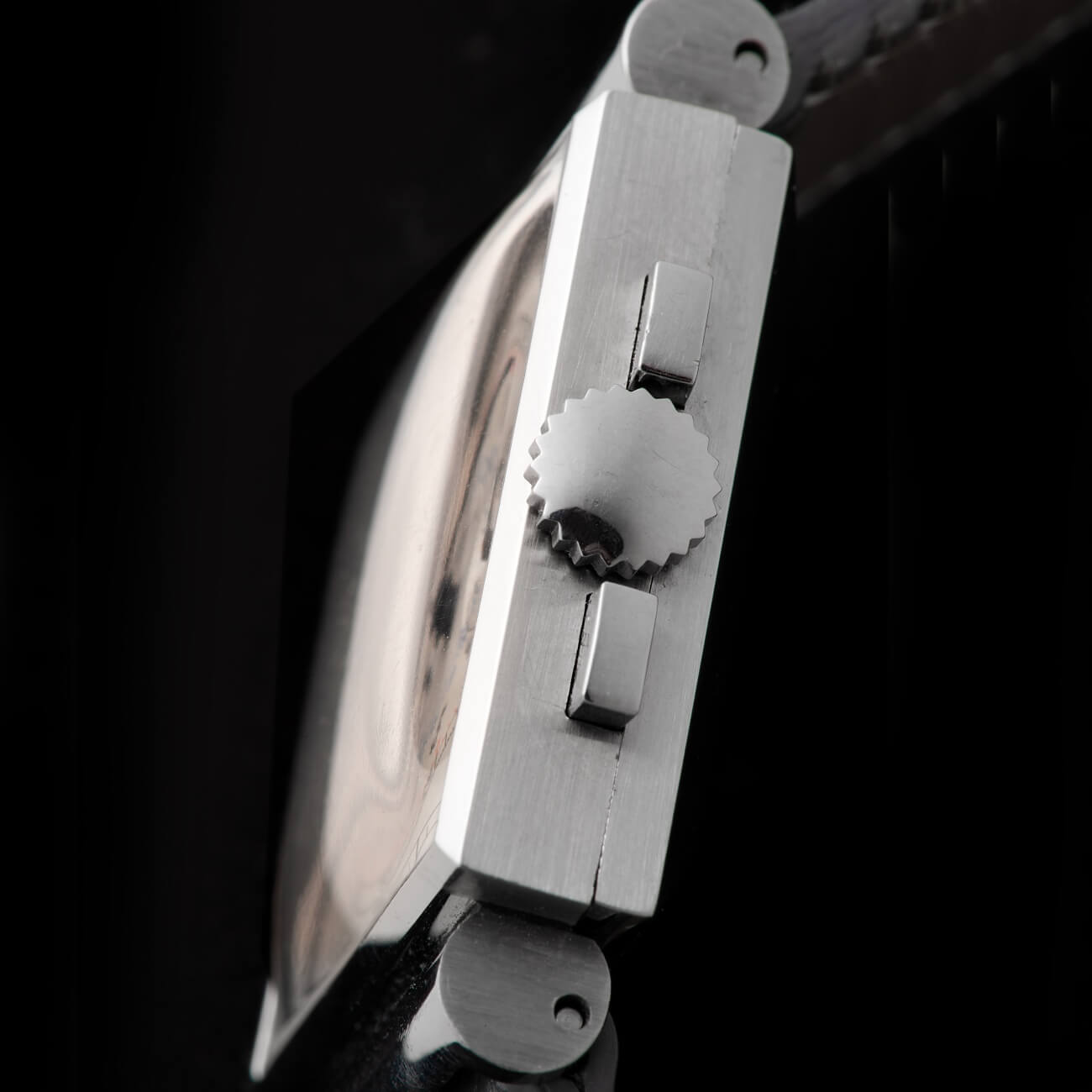 すべて販売当時の完全な未使用状態を維持している点に価値のある時計です。手の込んだラグの形状、ダイアルの作り、リューズや針などのディテールに至るまで、流石の美しさを感じる逸品です。