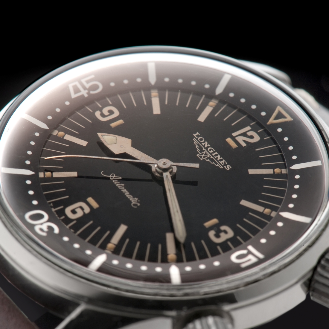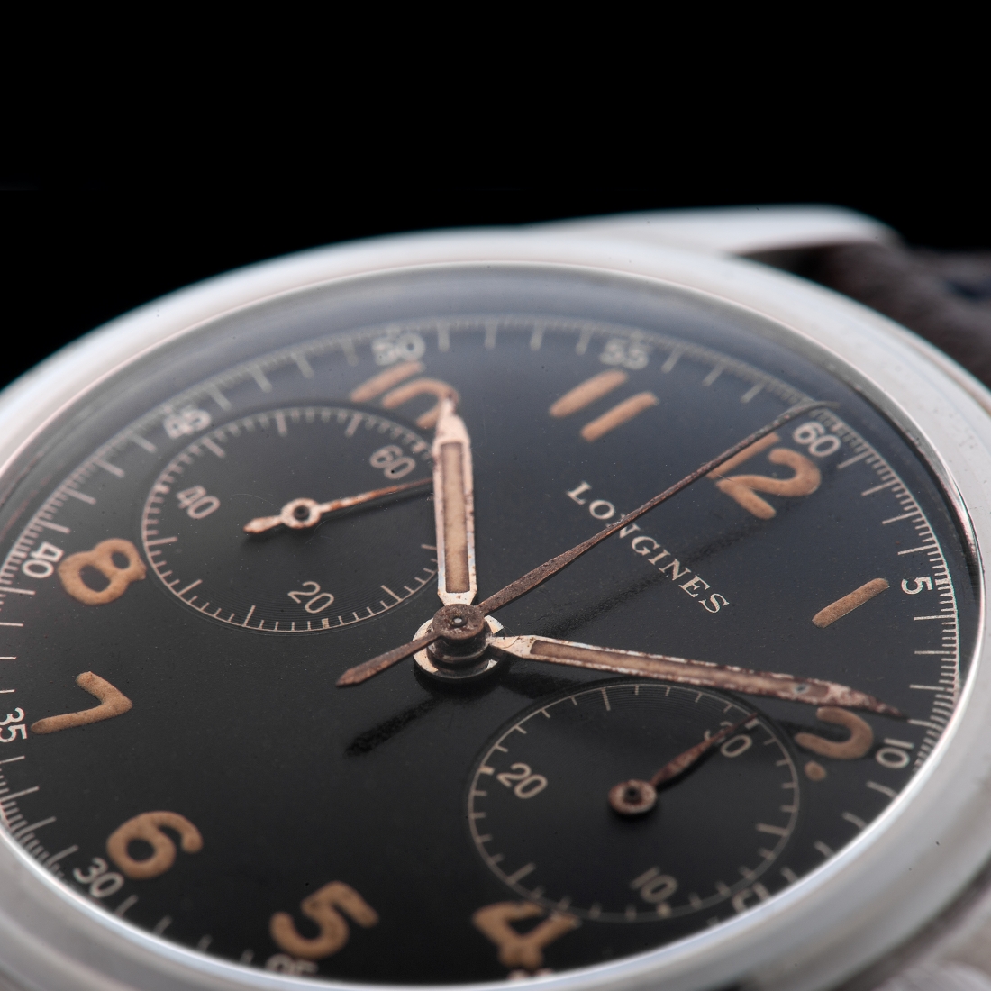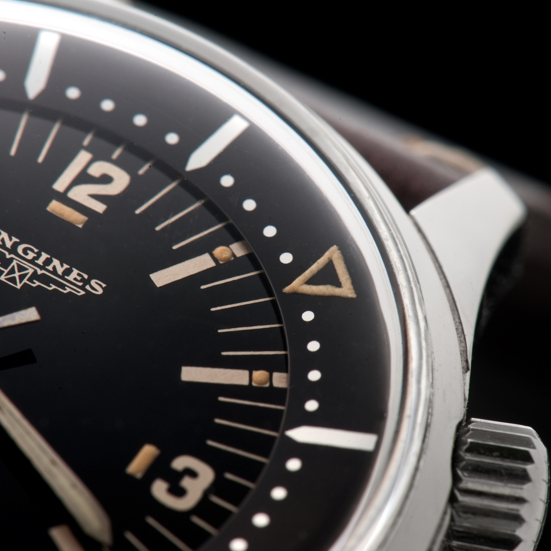 ダイアルはシンプルなデザインながらブラックのギルトダイアルで、インデックス、針共に夜光がオリジナルの状態で残っており、特徴的なレジスター針もオリジナルの状態で残っております。