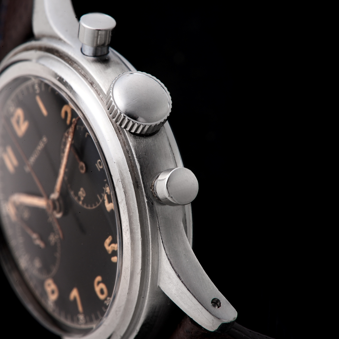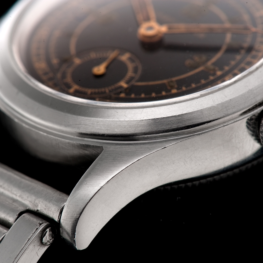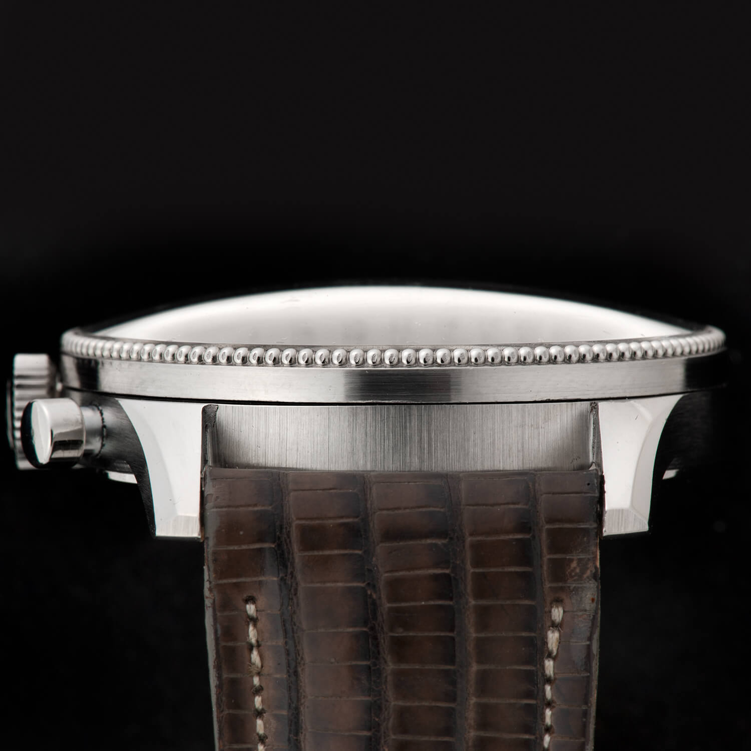 ケースは全体に殆ど磨きの入らないナチュラルな状態を保ち、プッシャー、リューズの状態も良く、ソリッドな状態を残したベゼルのステップ面も魅力です。