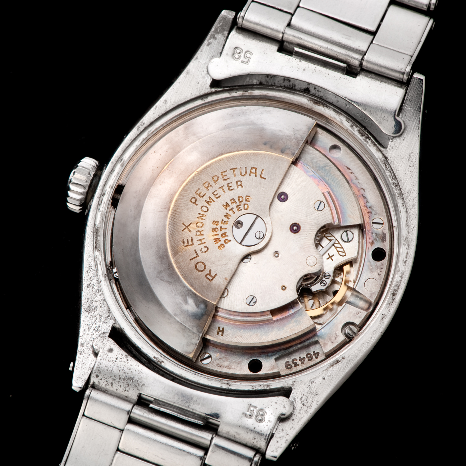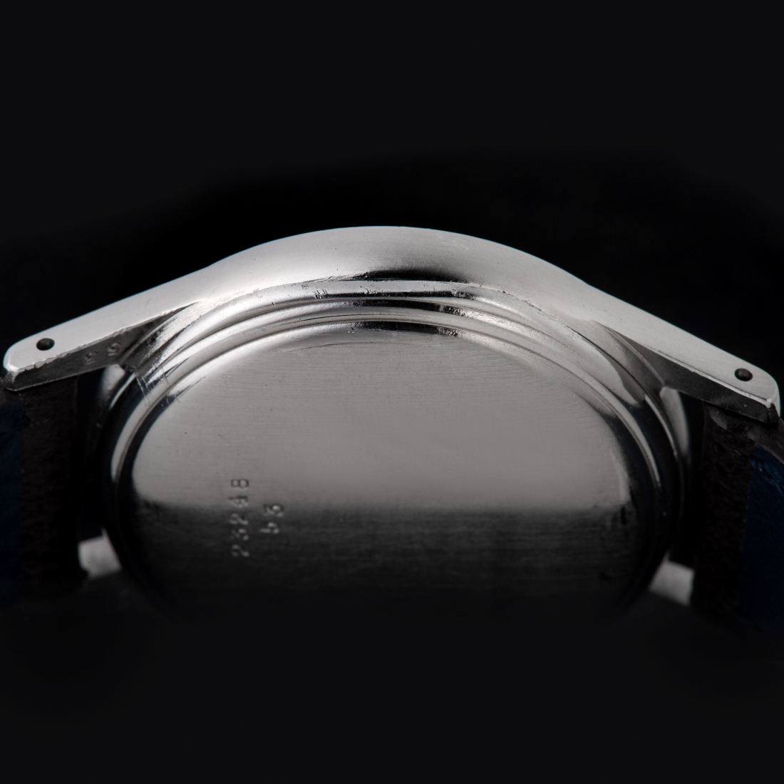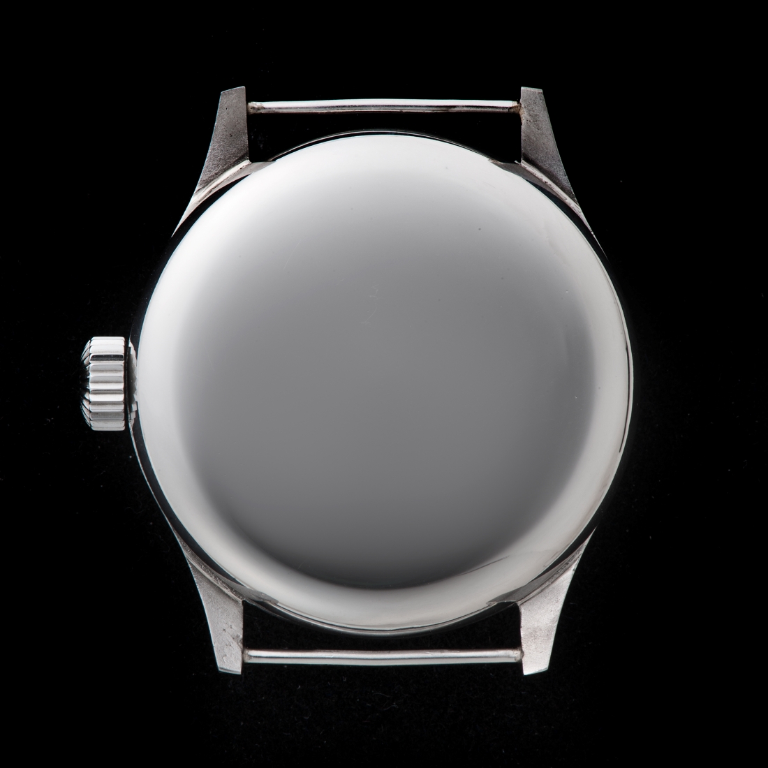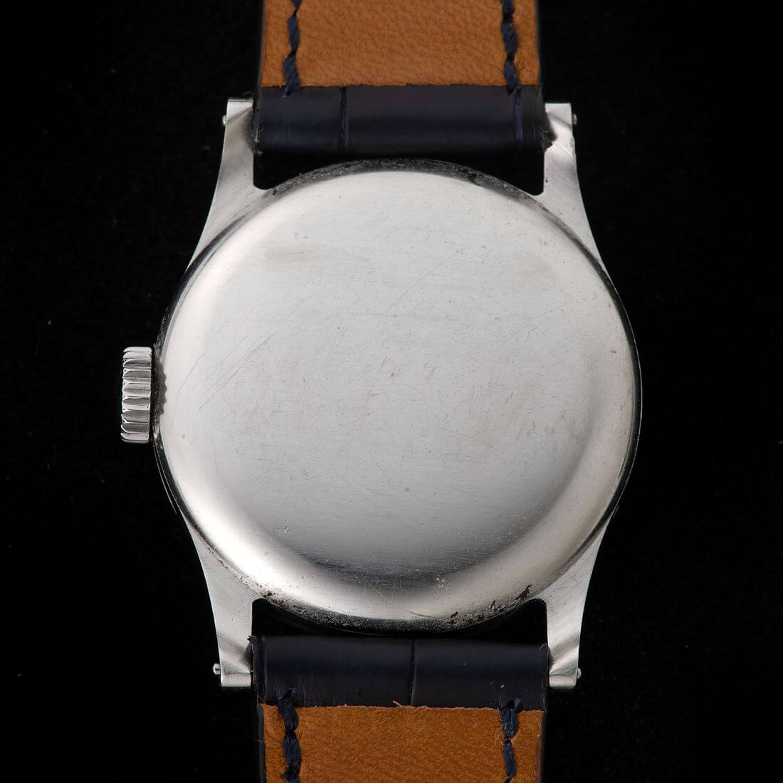 直径34mm強のケースに9 3/4のNAを搭載、ローターの厚みがあるため、裏蓋の縁から中央に大きく膨らんだ造形が後のモデルとは異なるディテールです。