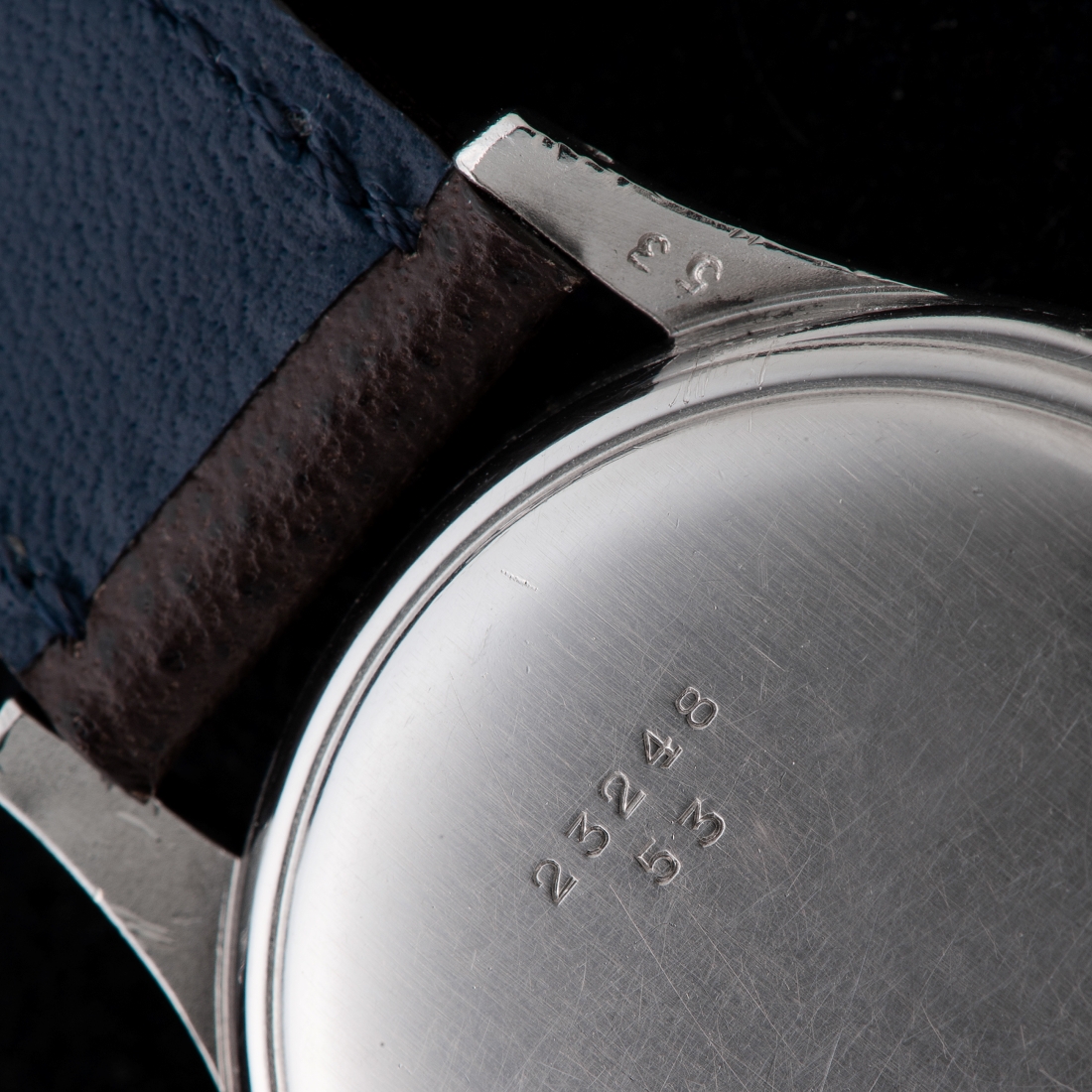 オリジナルバネ棒が残り、アンポリッシュで傷の無い素晴らしいケースコンディションの逸品で、ラグの面取りが美しく、画像にはございませんがケース番号がスタンプされた紙タグがセットで入荷しました。