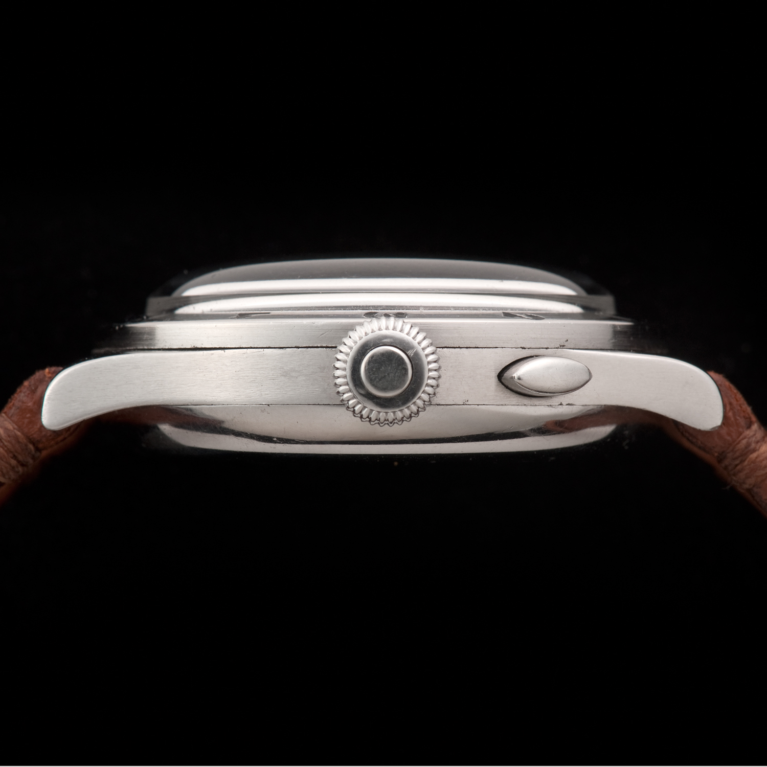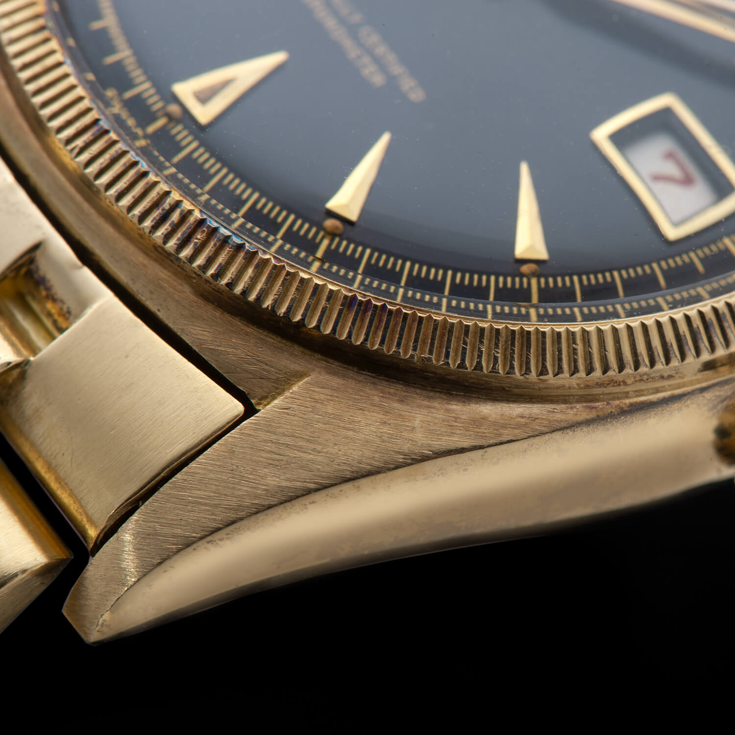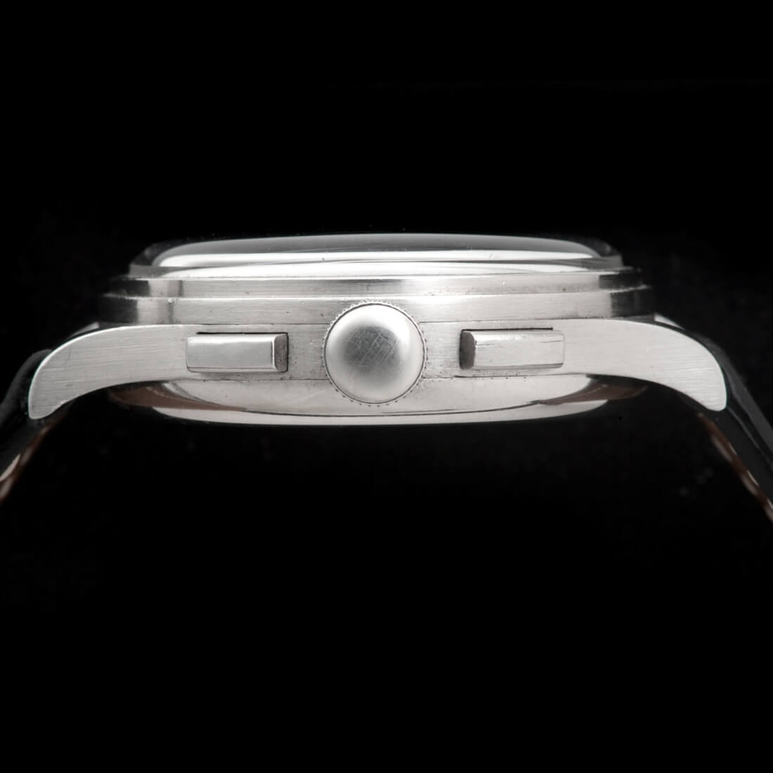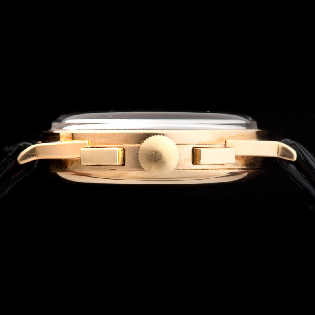 スリーピースの非防水ケースは18KYG製で、フラットデザインのベゼル、面取り処理されたラグ、スクエア型のプッシュボタンと随所にこの年代の意匠が感じられます。ダイアルは所謂ミラーダイアル(ギルトダイアル)とは違い、艶のあるブラックにロゴやテレメータースケールなどは粒子状の塗料でプリントされており、剥がれやペイントロスなどのない状態です。