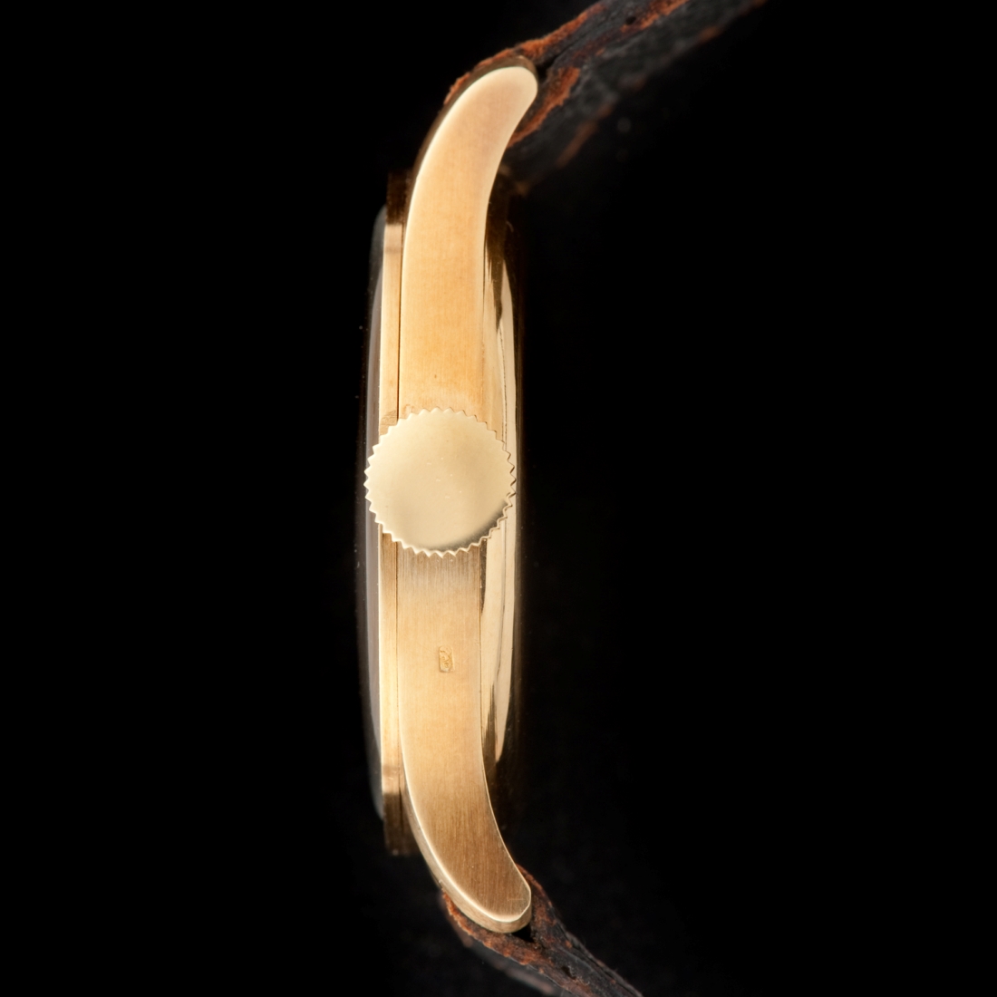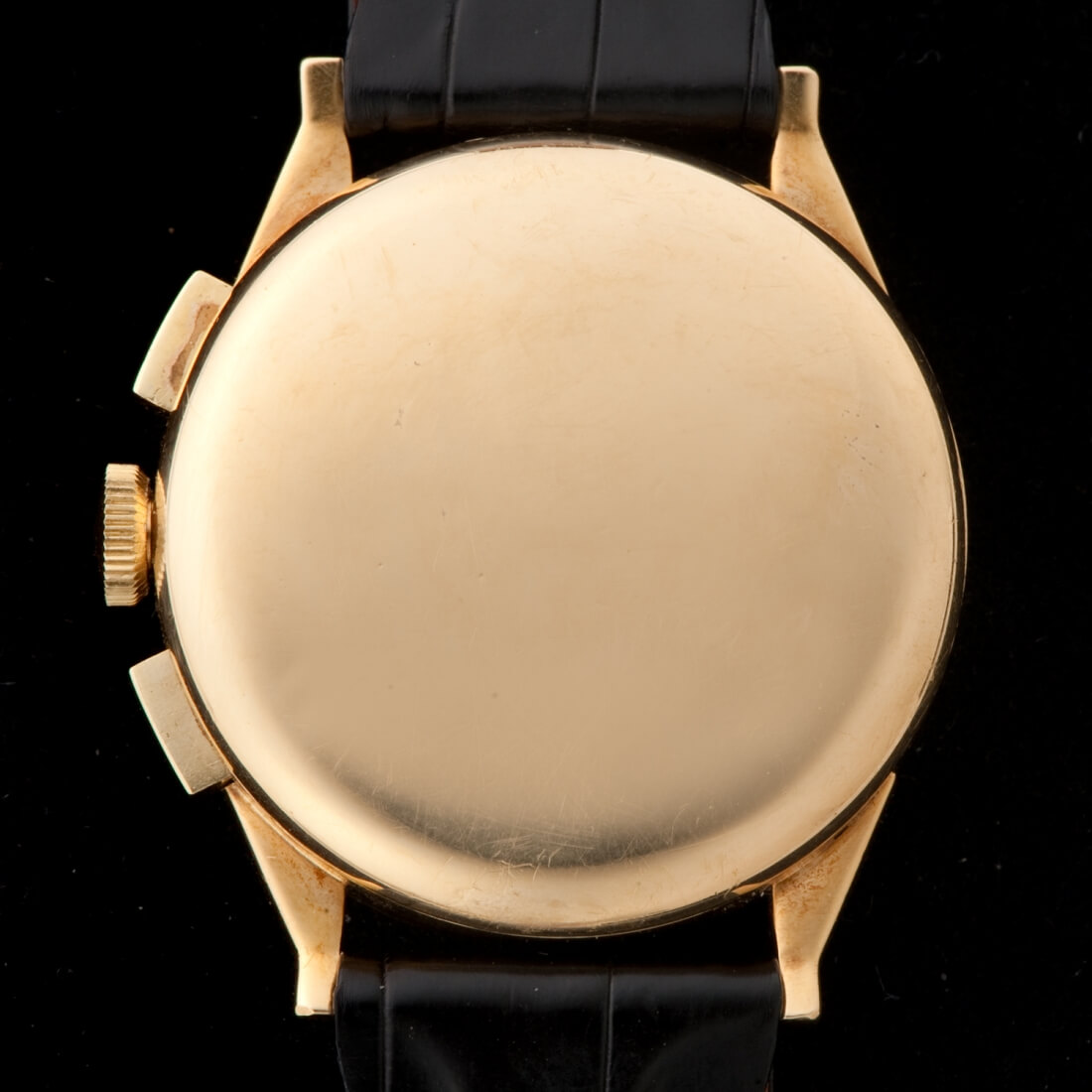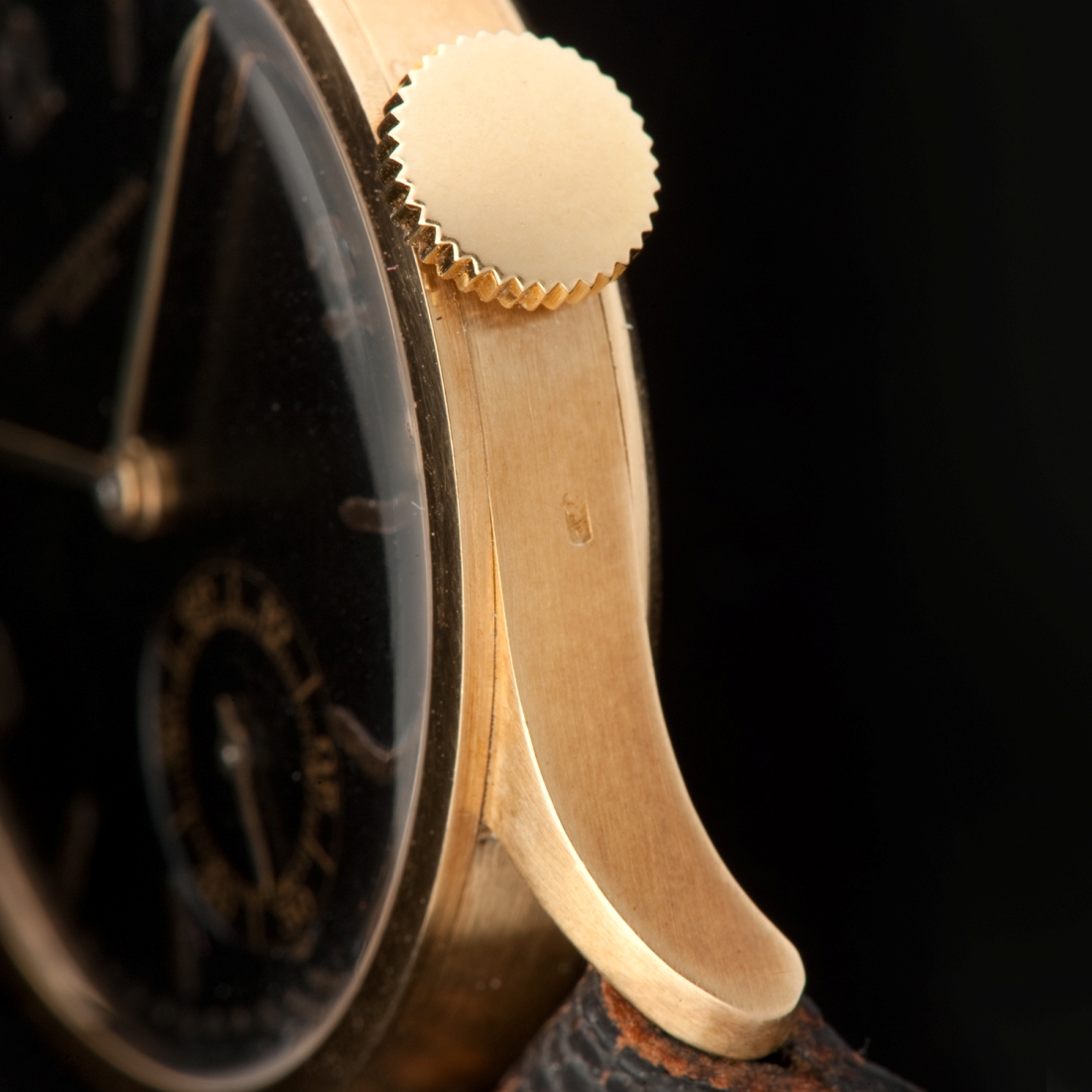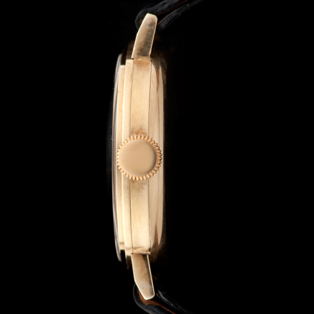 スリーピースの非防水ケースは18KYG製で、フラットデザインのベゼル、面取り処理されたラグ、スクエア型のプッシュボタンと随所にこの年代の意匠が感じられます。ダイアルは所謂ミラーダイアル(ギルトダイアル)とは違い、艶のあるブラックにロゴやテレメータースケールなどは粒子状の塗料でプリントされており、剥がれやペイントロスなどのない状態です。