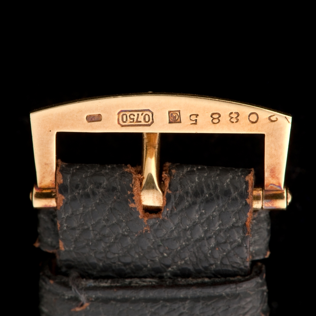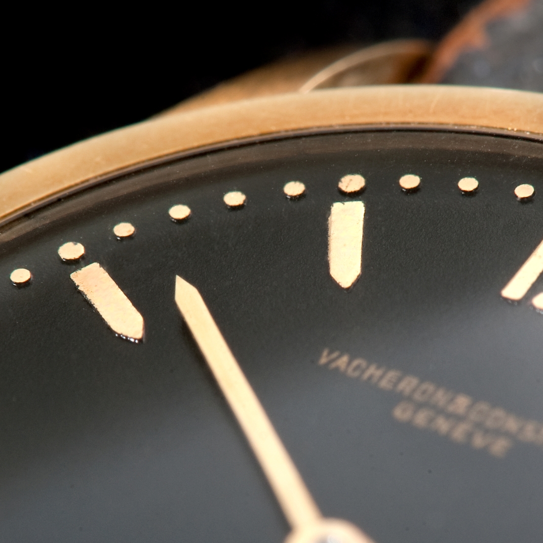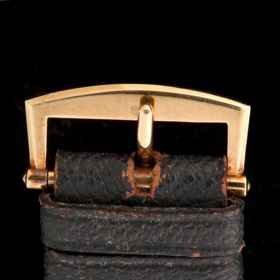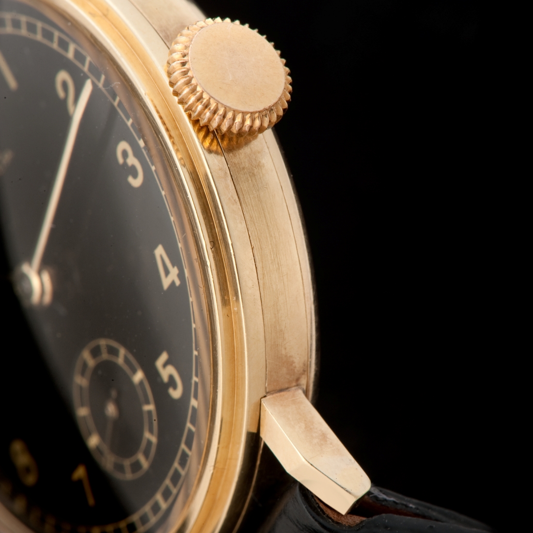 スリーピースの非防水ケースは18KYG製で、フラットデザインのベゼル、面取り処理されたラグ、スクエア型のプッシュボタンと随所にこの年代の意匠が感じられます。ダイアルは所謂ミラーダイアル(ギルトダイアル)とは違い、艶のあるブラックにロゴやテレメータースケールなどは粒子状の塗料でプリントされており、剥がれやペイントロスなどのない状態です。
