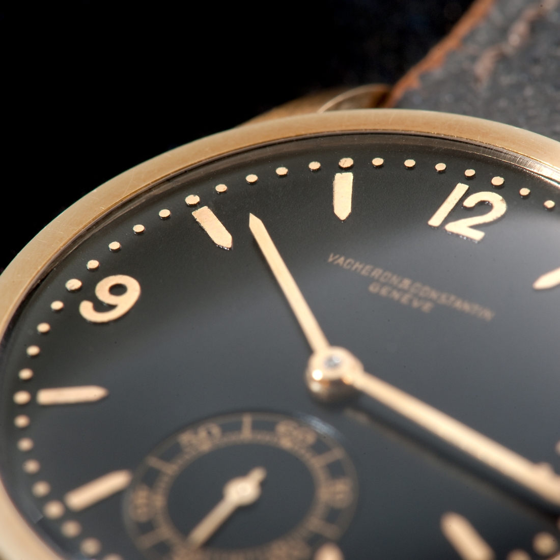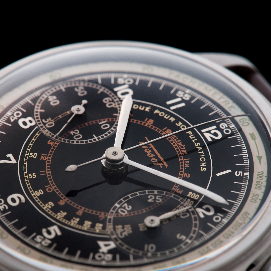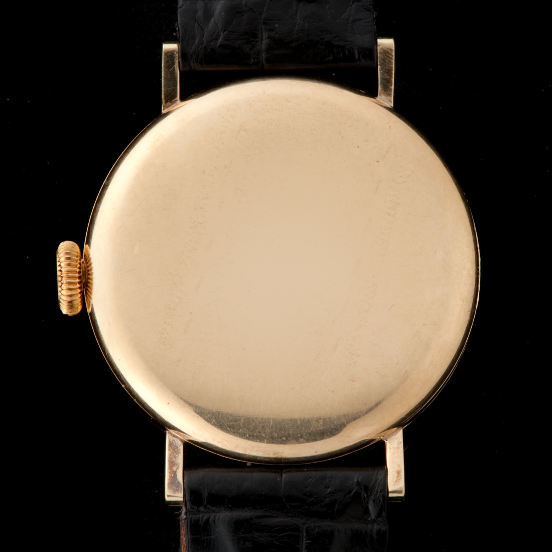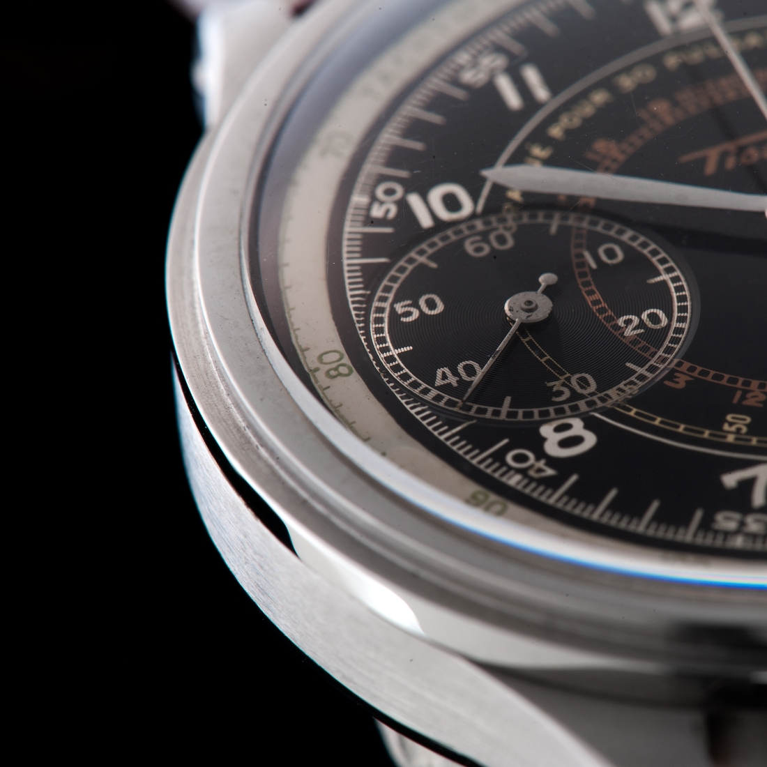 スリーピースの非防水ケースは18KYG製で、フラットデザインのベゼル、面取り処理されたラグ、スクエア型のプッシュボタンと随所にこの年代の意匠が感じられます。ダイアルは所謂ミラーダイアル(ギルトダイアル)とは違い、艶のあるブラックにロゴやテレメータースケールなどは粒子状の塗料でプリントされており、剥がれやペイントロスなどのない状態です。