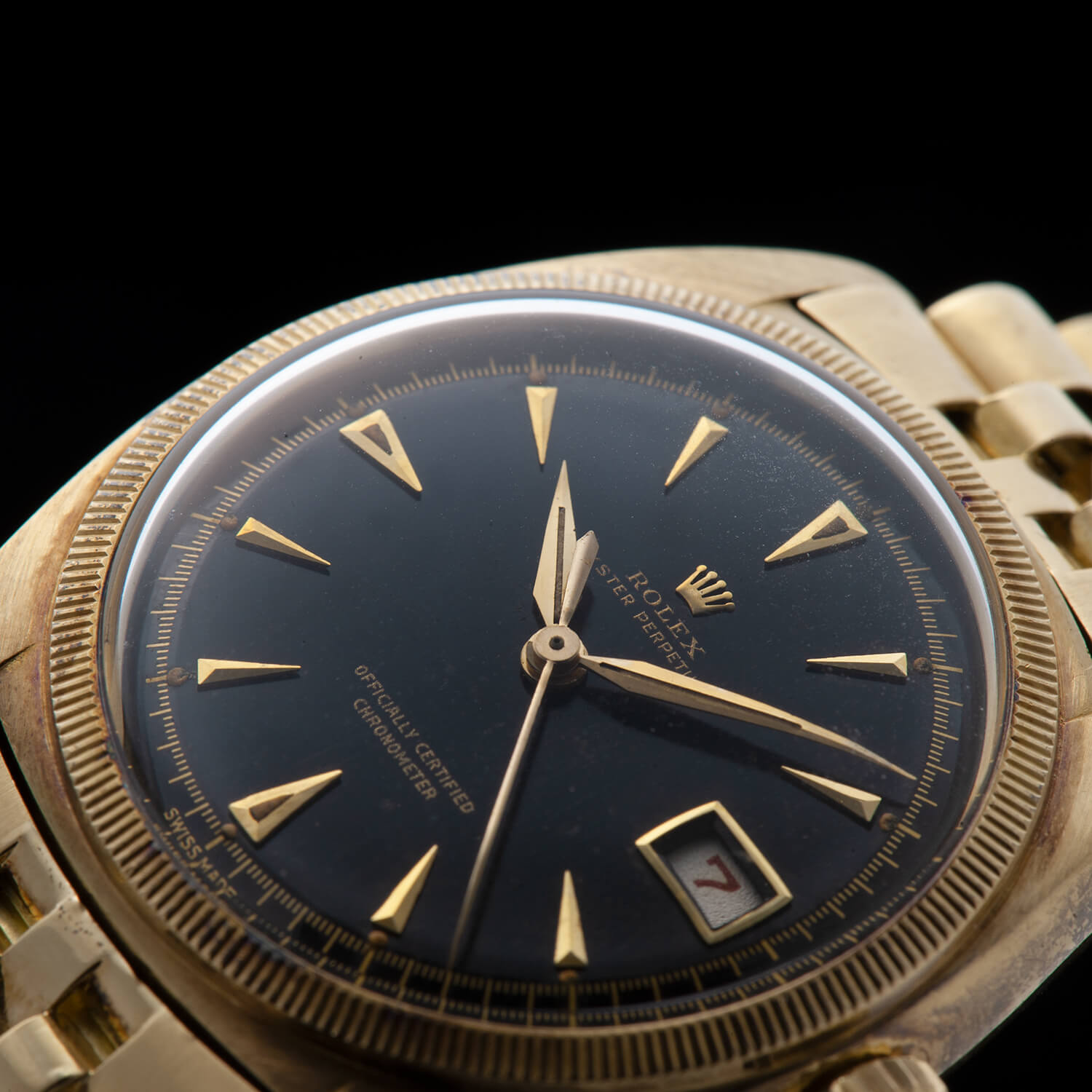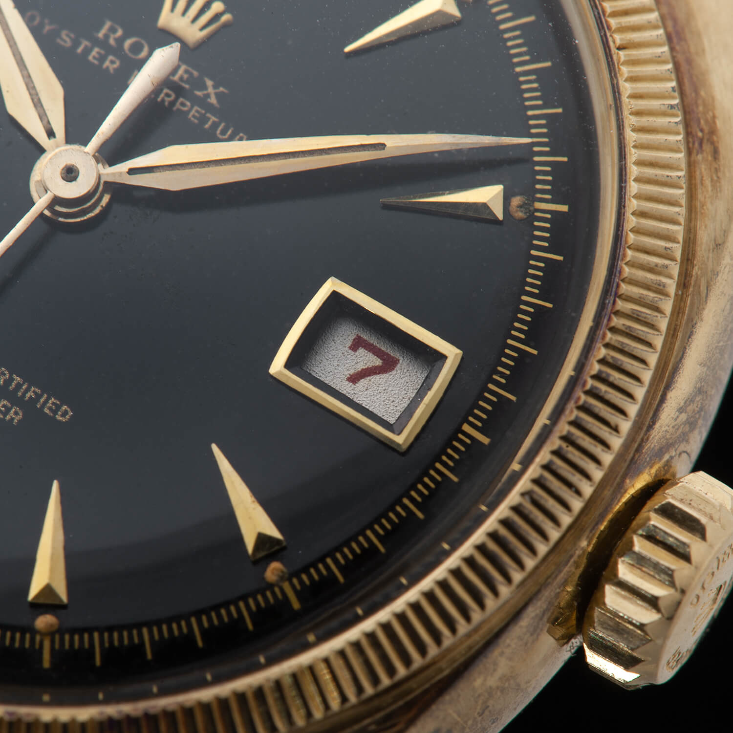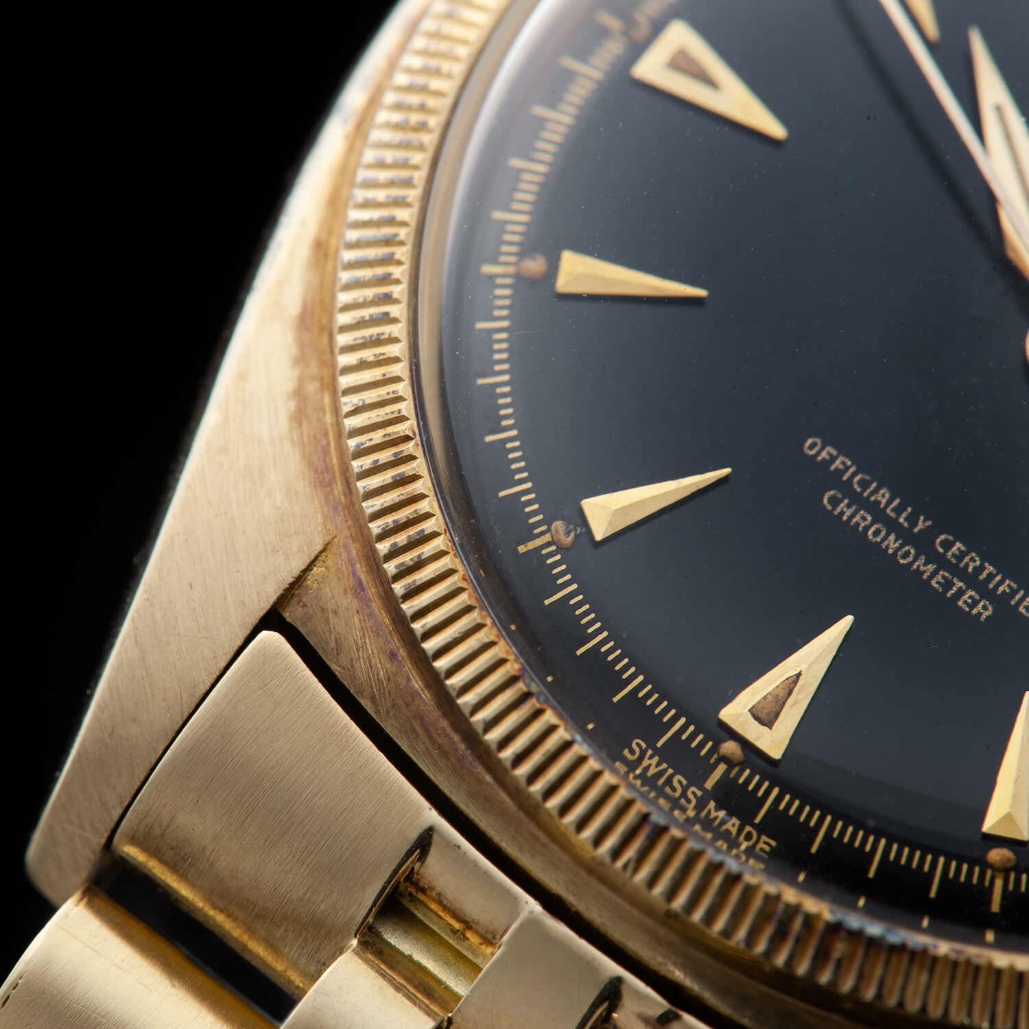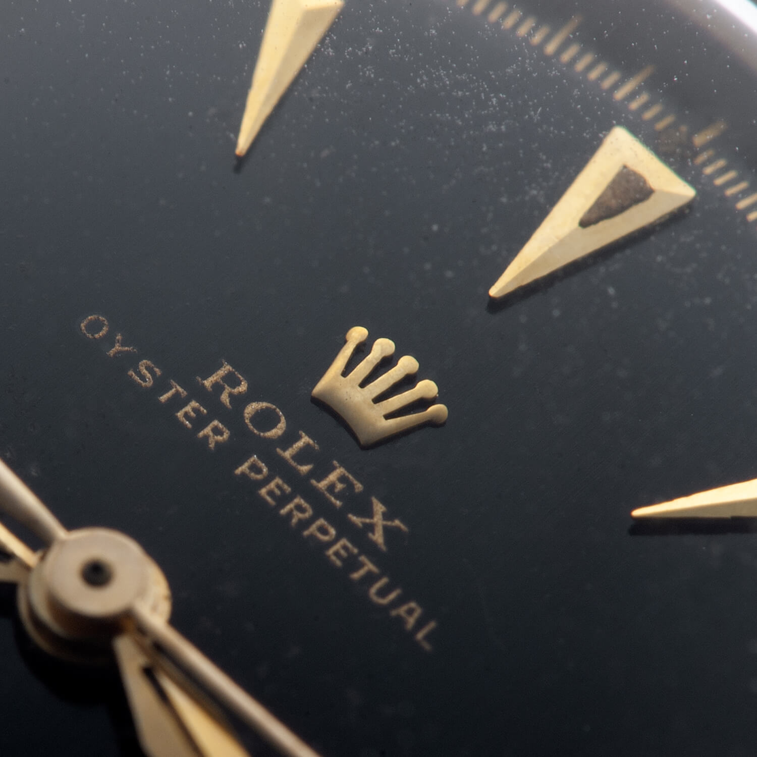 ダイアルはブラックミラー、濃く経年した夜光が針とインデックスに残り、スーパーオイスタークラウン、カレンダーは全て赤表記です。この年代ならではの細かい刻みのベゼル、金無垢ケースの裏蓋タップの刻みもオリジナルエッジの美しさは見事で、金錆の出たボリューム感のあるケースシェイプは唯一無二の存在感を醸し出しております。