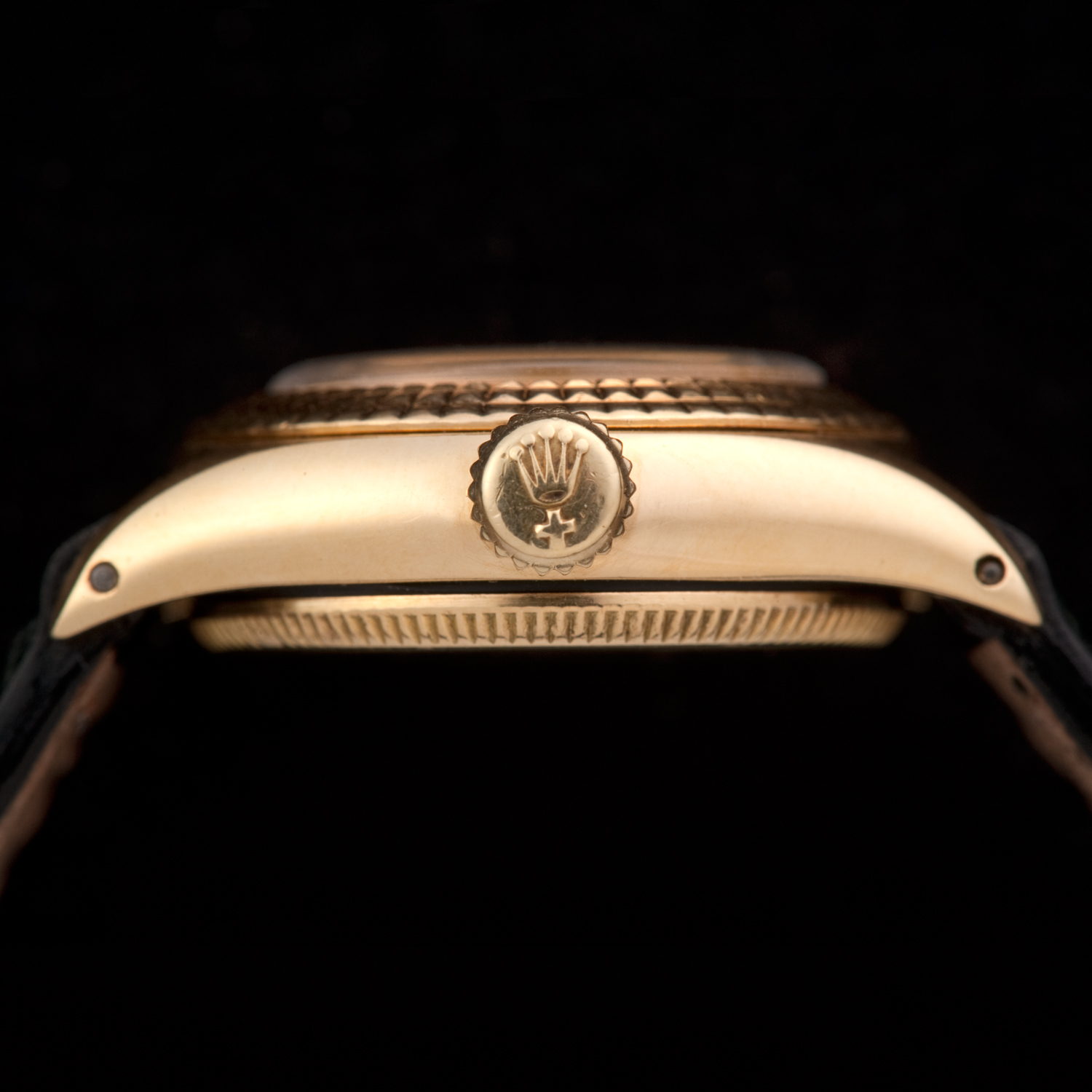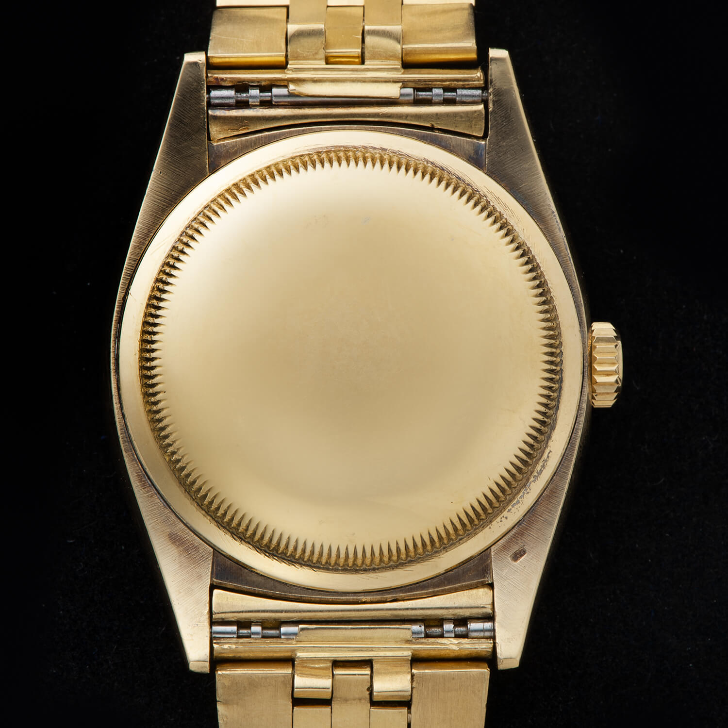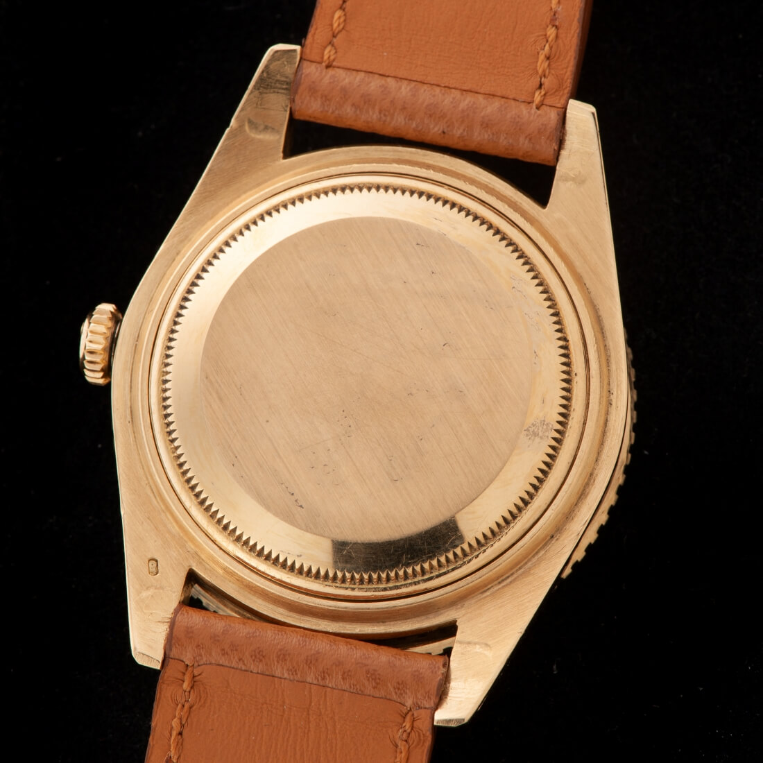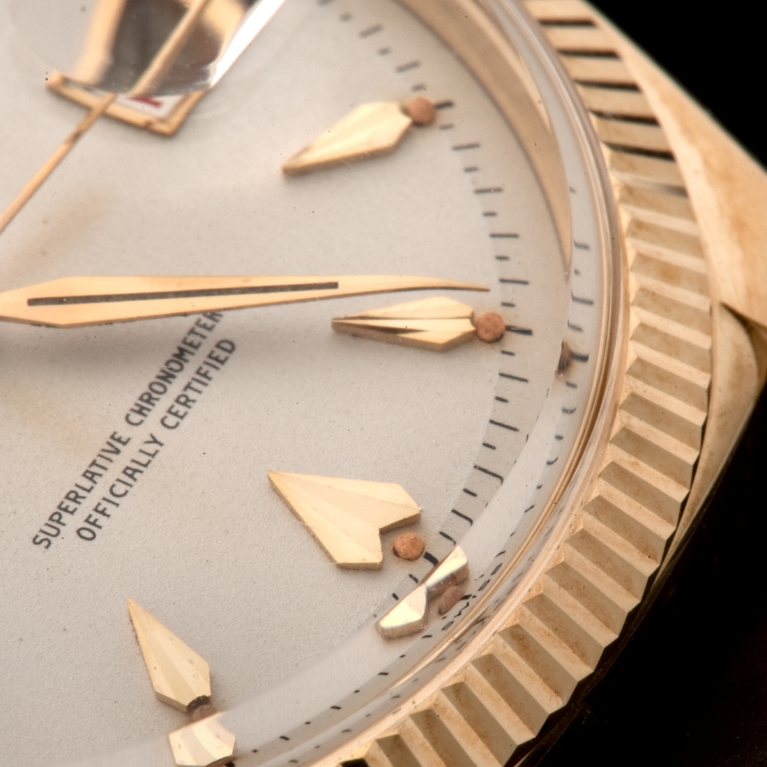 ダイアルはブラックミラー、濃く経年した夜光が針とインデックスに残り、スーパーオイスタークラウン、カレンダーは全て赤表記です。この年代ならではの細かい刻みのベゼル、金無垢ケースの裏蓋タップの刻みもオリジナルエッジの美しさは見事で、金錆の出たボリューム感のあるケースシェイプは唯一無二の存在感を醸し出しております。