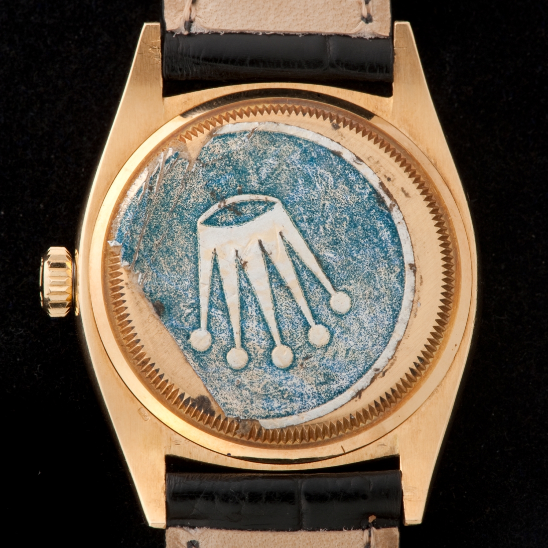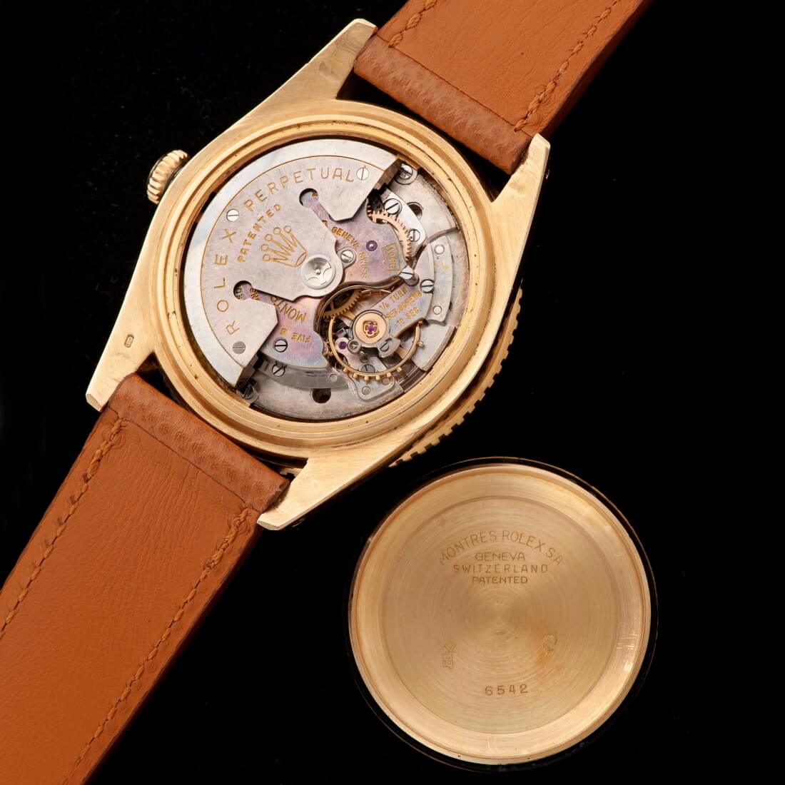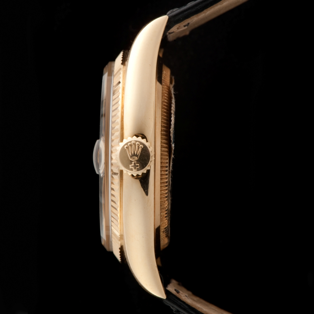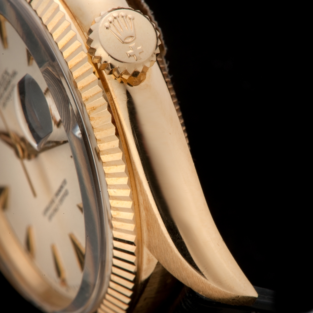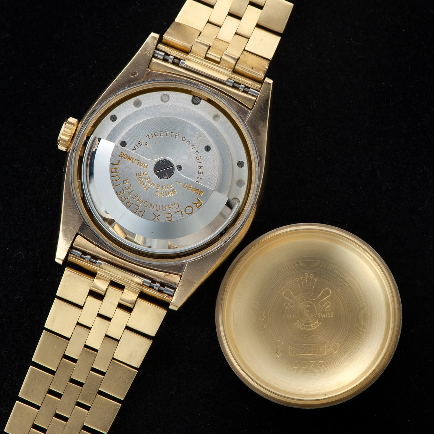 ダイアルはブラックミラー、濃く経年した夜光が針とインデックスに残り、スーパーオイスタークラウン、カレンダーは全て赤表記です。この年代ならではの細かい刻みのベゼル、金無垢ケースの裏蓋タップの刻みもオリジナルエッジの美しさは見事で、金錆の出たボリューム感のあるケースシェイプは唯一無二の存在感を醸し出しております。
