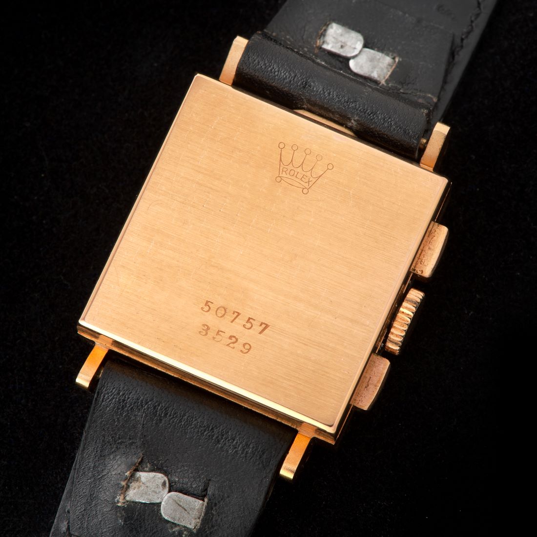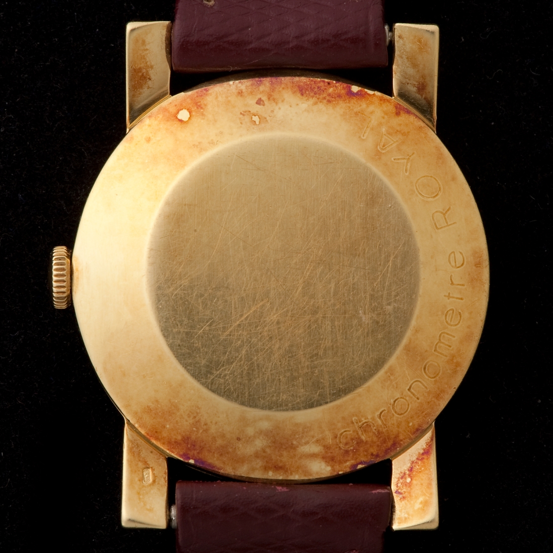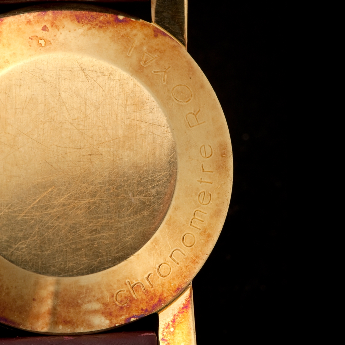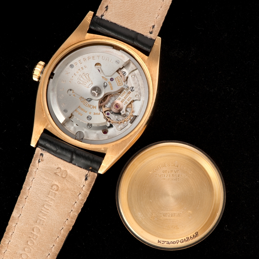 ダイアルはブラックミラー、濃く経年した夜光が針とインデックスに残り、スーパーオイスタークラウン、カレンダーは全て赤表記です。この年代ならではの細かい刻みのベゼル、金無垢ケースの裏蓋タップの刻みもオリジナルエッジの美しさは見事で、金錆の出たボリューム感のあるケースシェイプは唯一無二の存在感を醸し出しております。