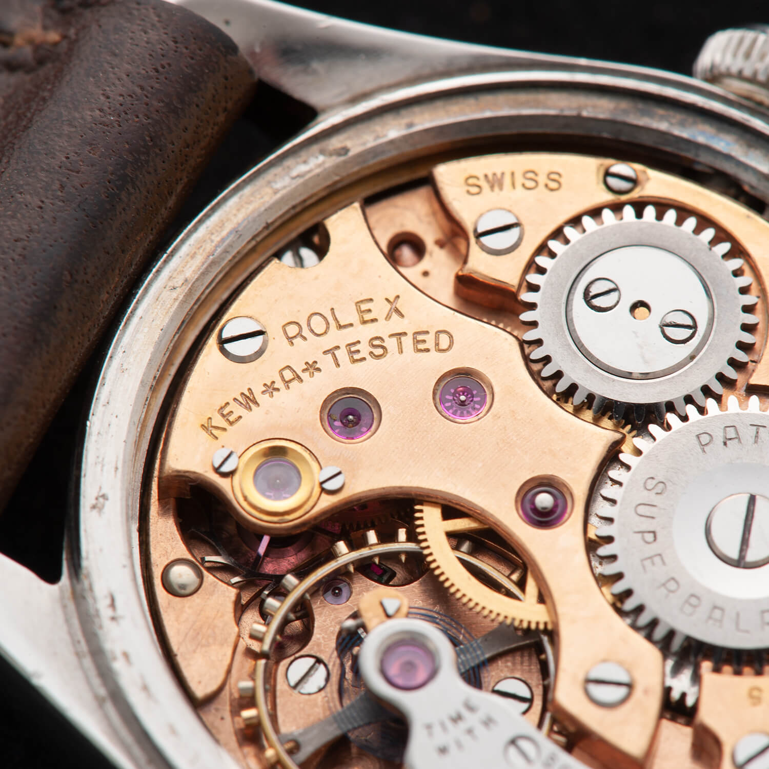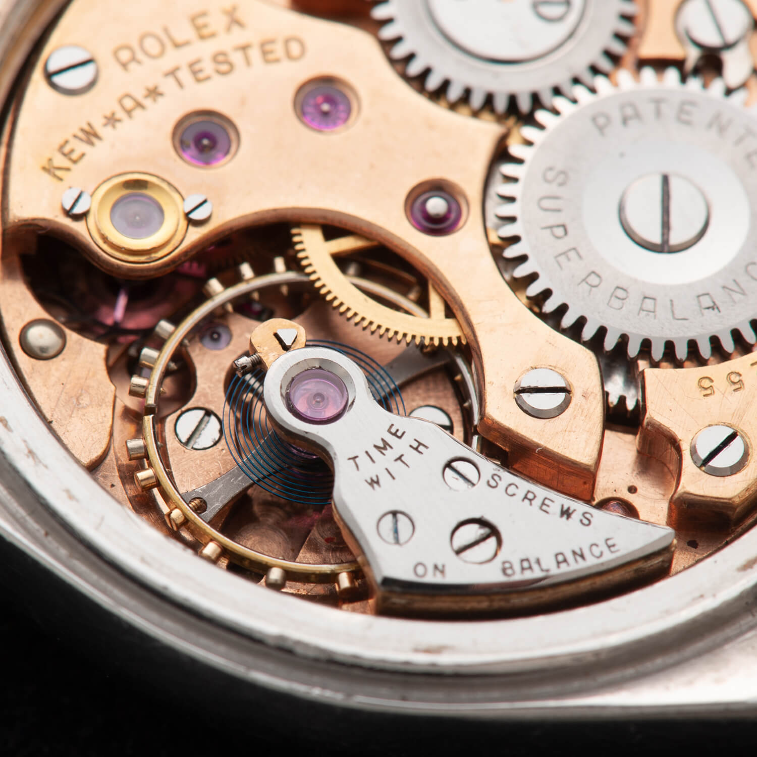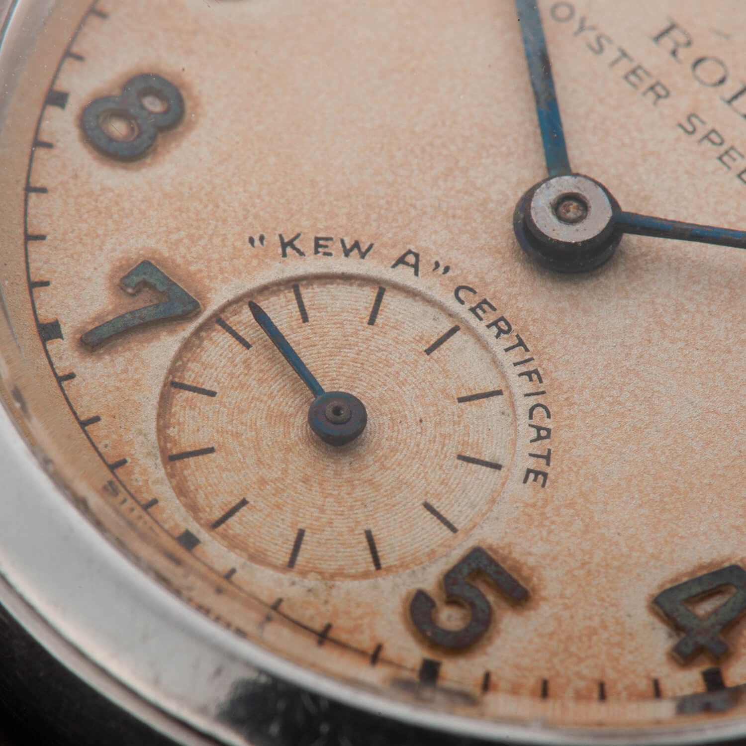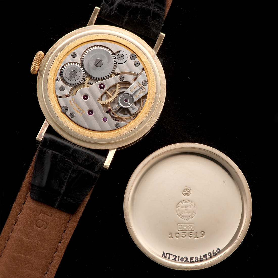 40年代にキューテストにて精度検定に用いた時計で、ダイアルに”KEW A CERTIFICATE”、ムーブメントには”KEW A TESTED” とテスト時に用いる固有番号”4255″が入り、このモデル用に作られたバイカラーの特殊ムーブメントを備えます。