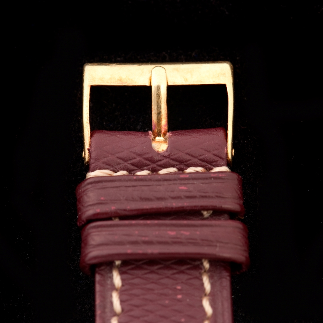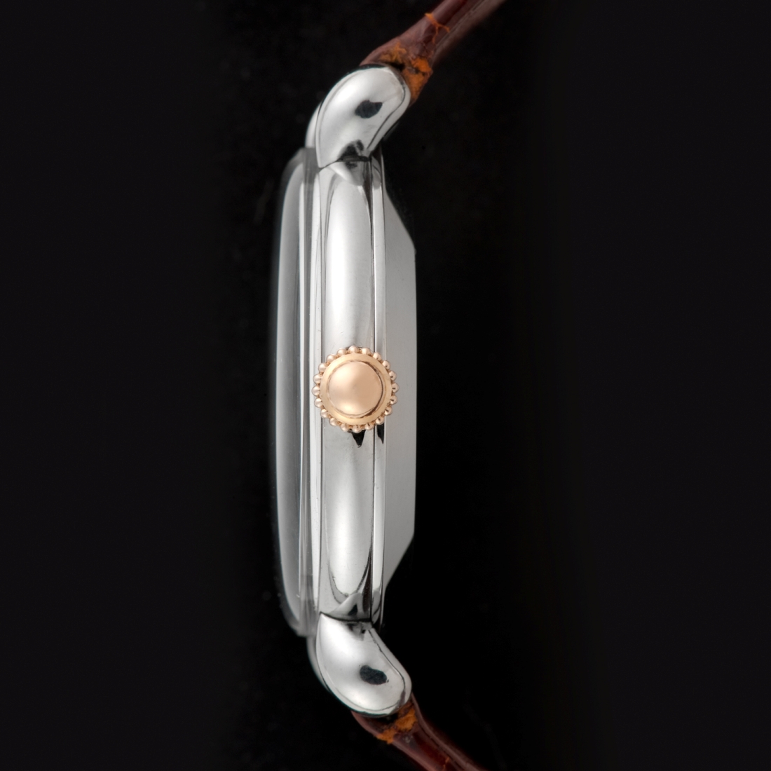 ロゴや細かいミニッツトラックが全てエナメルのダイアルは、外周を落とした作りと相まって立体感が感じられ、インデックスと長短針は金無垢素材、リューズの色味もしっかりとマッチした美しいピンクカラーで統一されております。