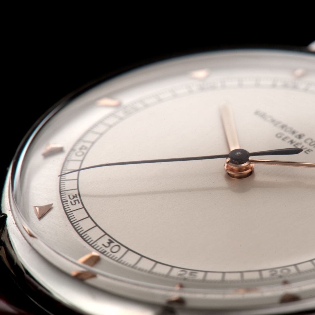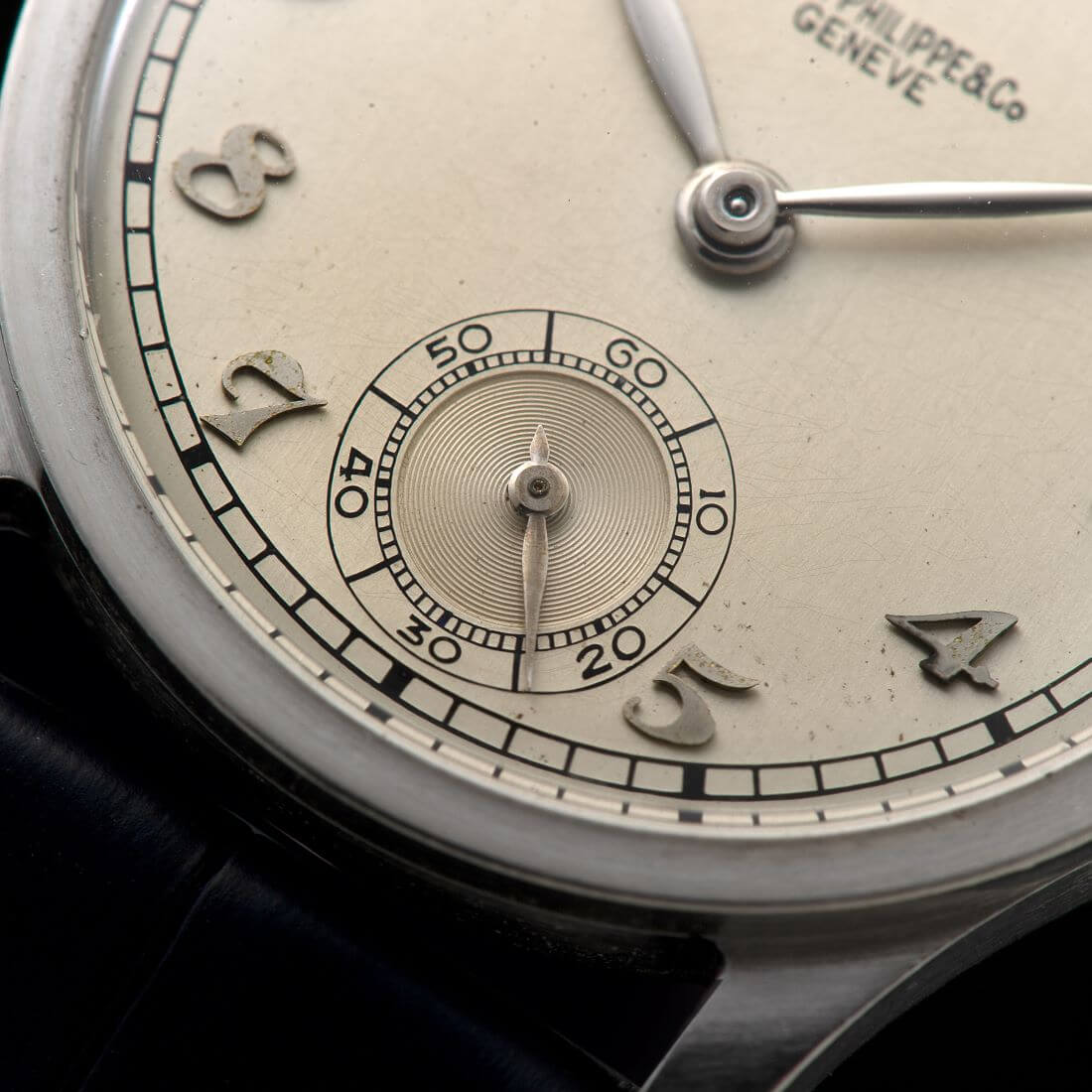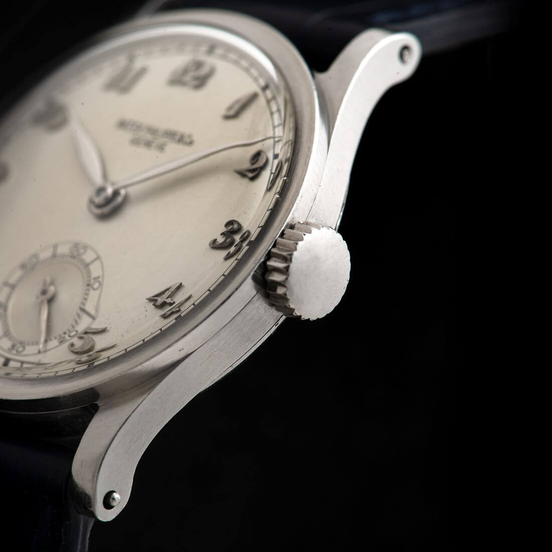 ステンレススチールにブレゲ数字を配したパテックの中でもあまりにも有名なリファレンス96です。一般的な植字の砲弾型インデックスはもとより、このブレゲ数字のモデルは愛好家なら誰しも憧れるモデルの一つと言えます。フラットなベゼル幅も広く高さもあり、ケースサイドからラグに向けての流れるような曲線美は非常に美麗です。文字盤外周はクラシカルなレールトラックを配し、スモールセコンド表記も非常に凝ってます。植字の立体的なブレゲ数字、先端がシャープなリーフハンド、象嵌の隆起が美しい“&Co”表記、この時代特有のFBケースの質感など、挙げたらきりがないほど魅力的な逸品です。