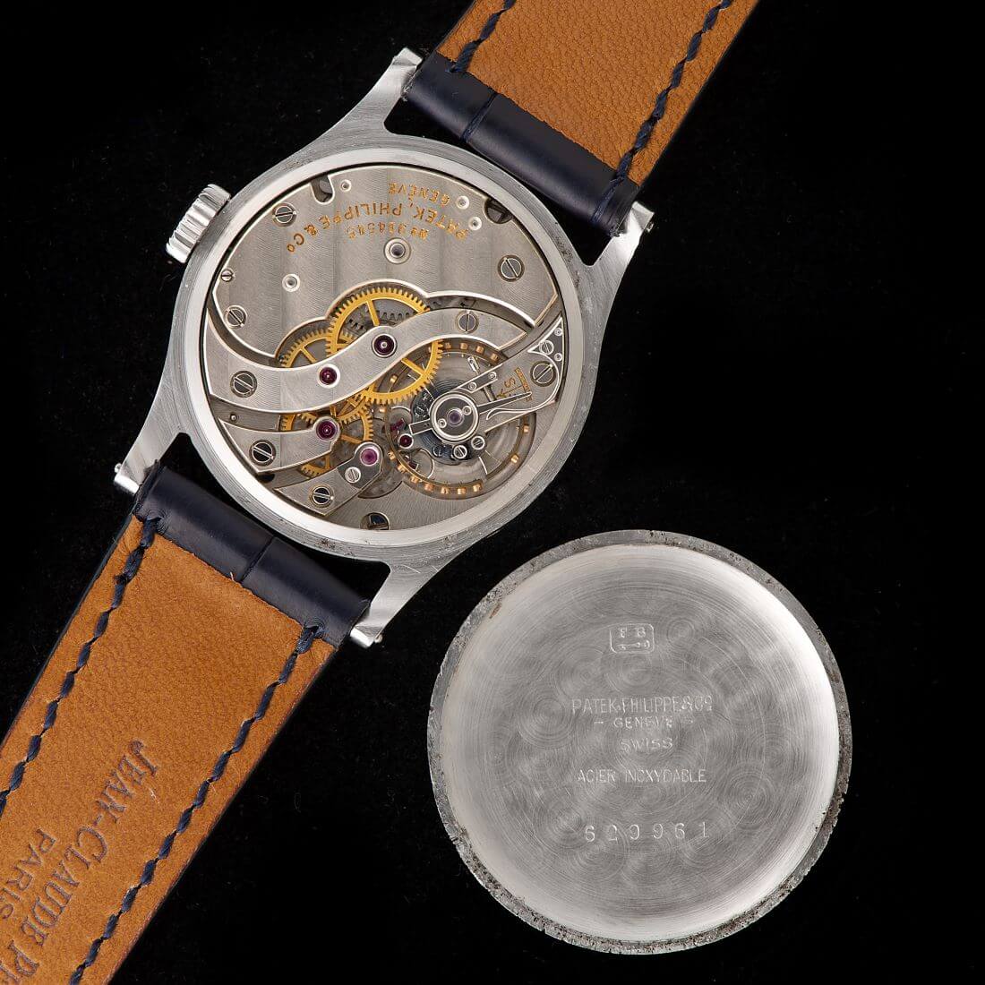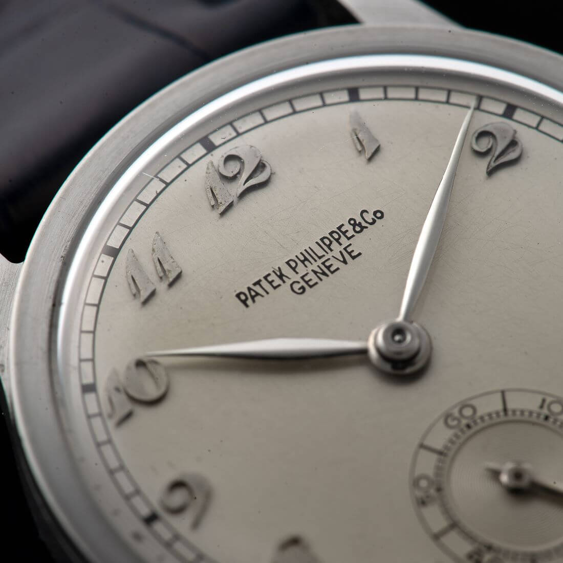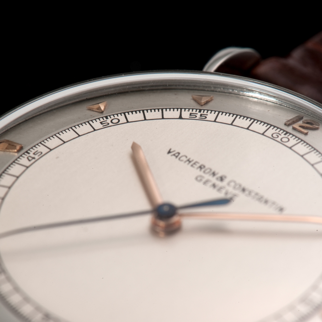 ステンレススチールにブレゲ数字を配したパテックの中でもあまりにも有名なリファレンス96です。一般的な植字の砲弾型インデックスはもとより、このブレゲ数字のモデルは愛好家なら誰しも憧れるモデルの一つと言えます。フラットなベゼル幅も広く高さもあり、ケースサイドからラグに向けての流れるような曲線美は非常に美麗です。文字盤外周はクラシカルなレールトラックを配し、スモールセコンド表記も非常に凝ってます。植字の立体的なブレゲ数字、先端がシャープなリーフハンド、象嵌の隆起が美しい“&Co”表記、この時代特有のFBケースの質感など、挙げたらきりがないほど魅力的な逸品です。