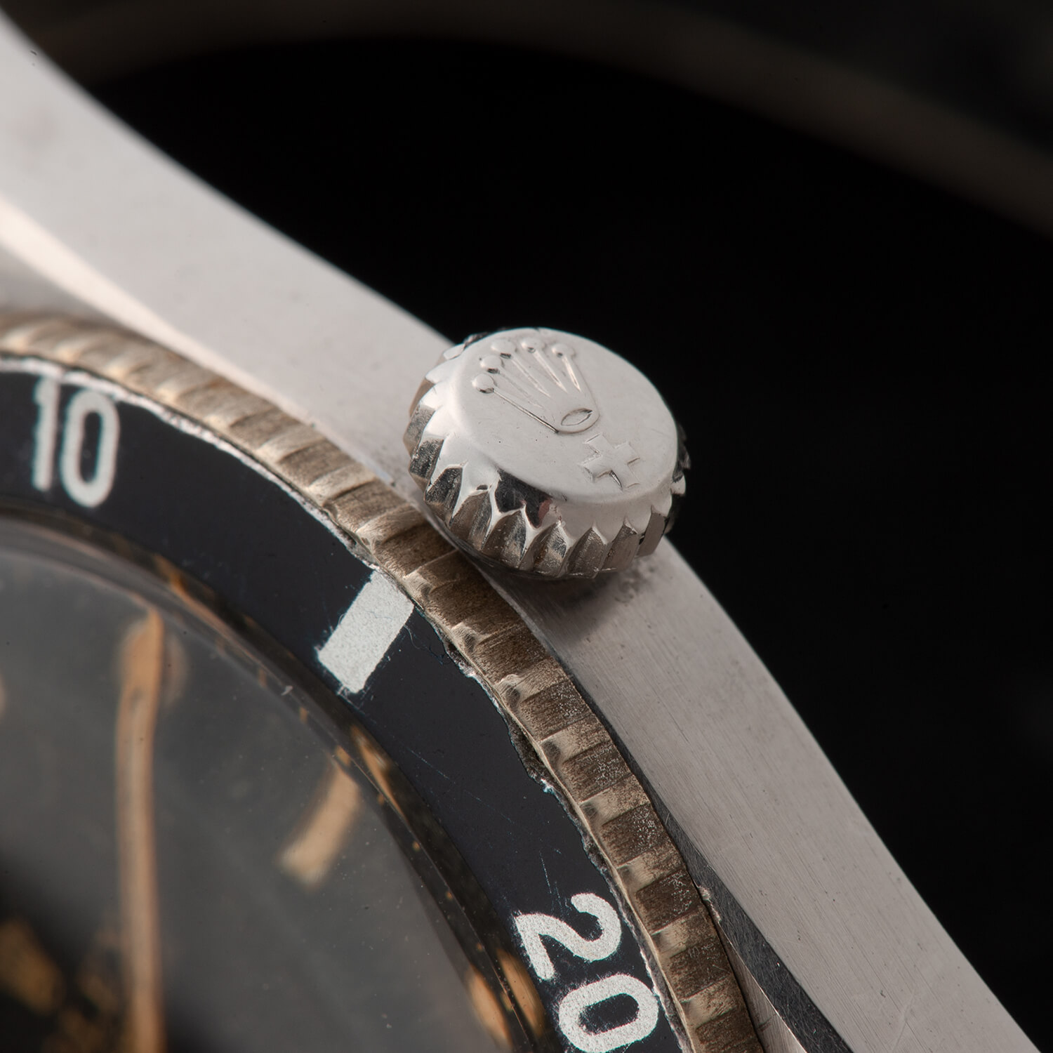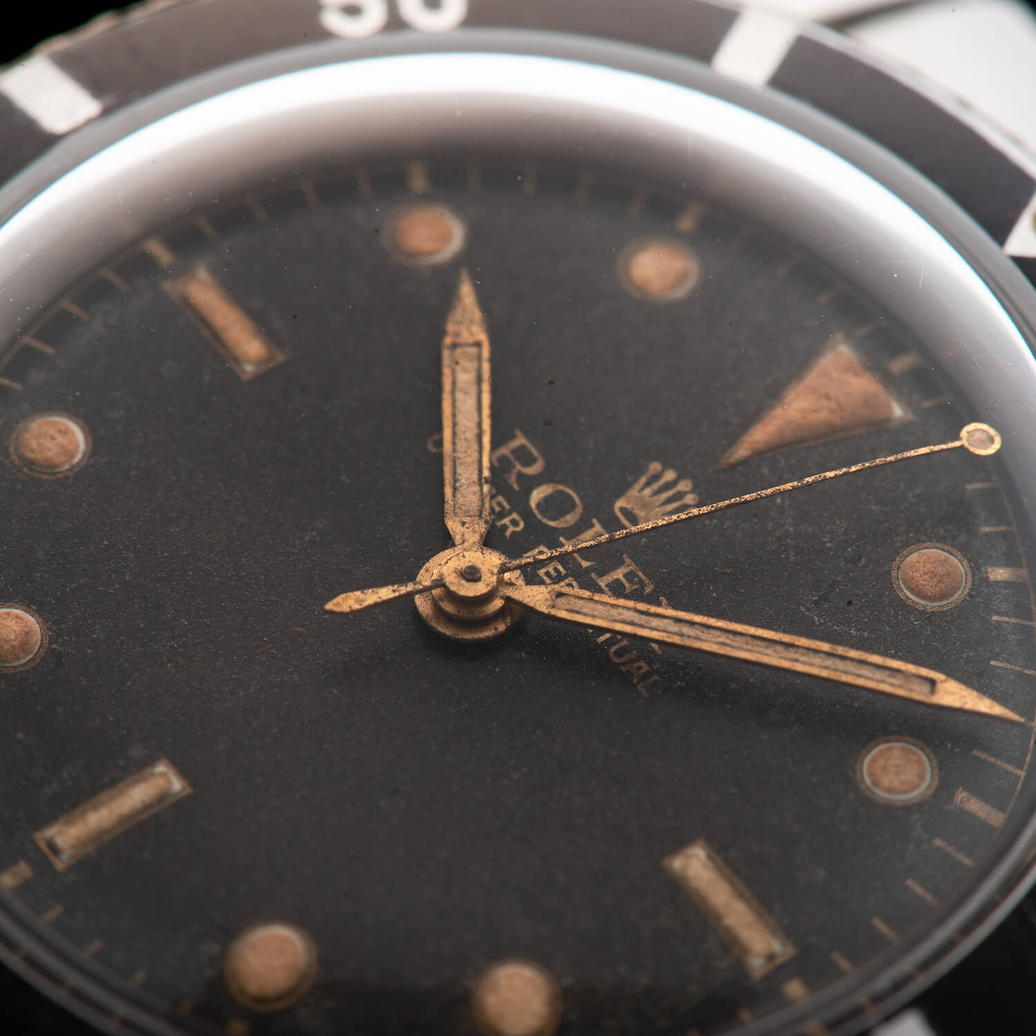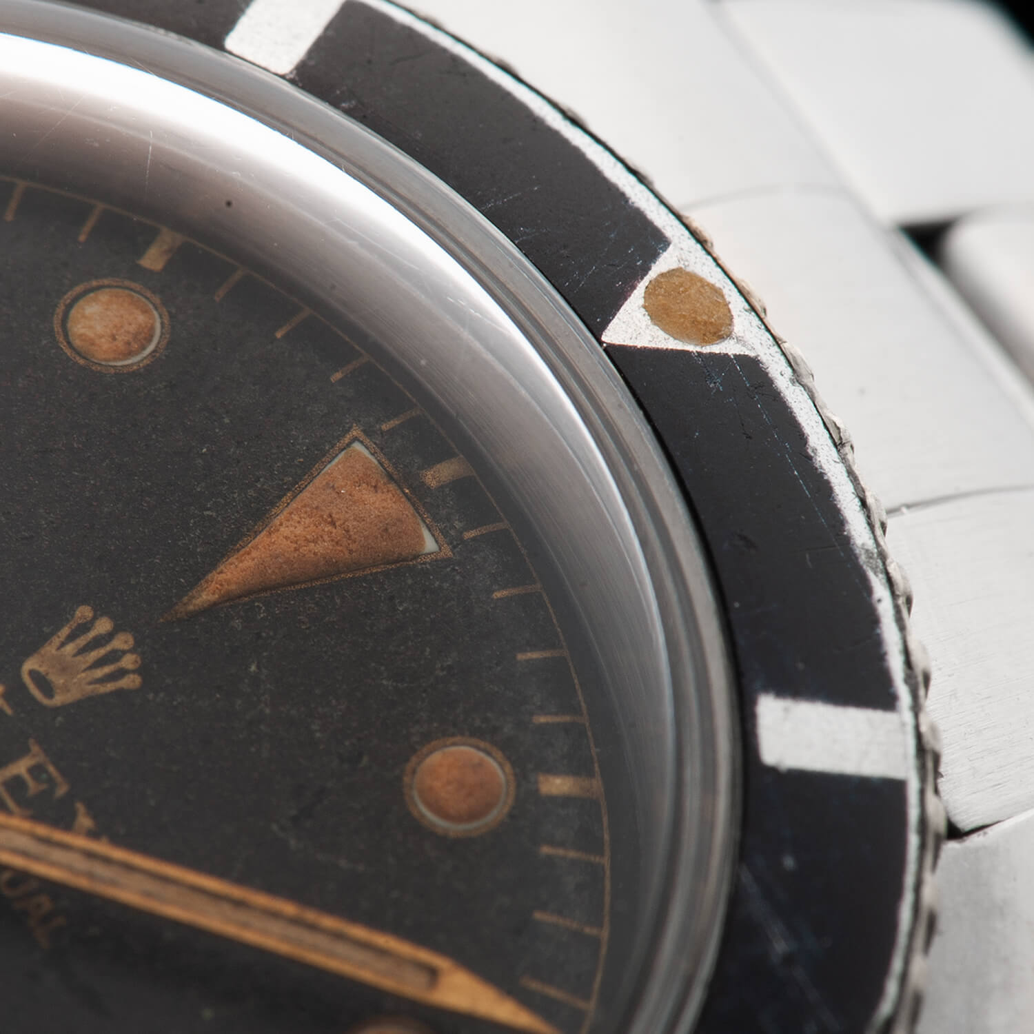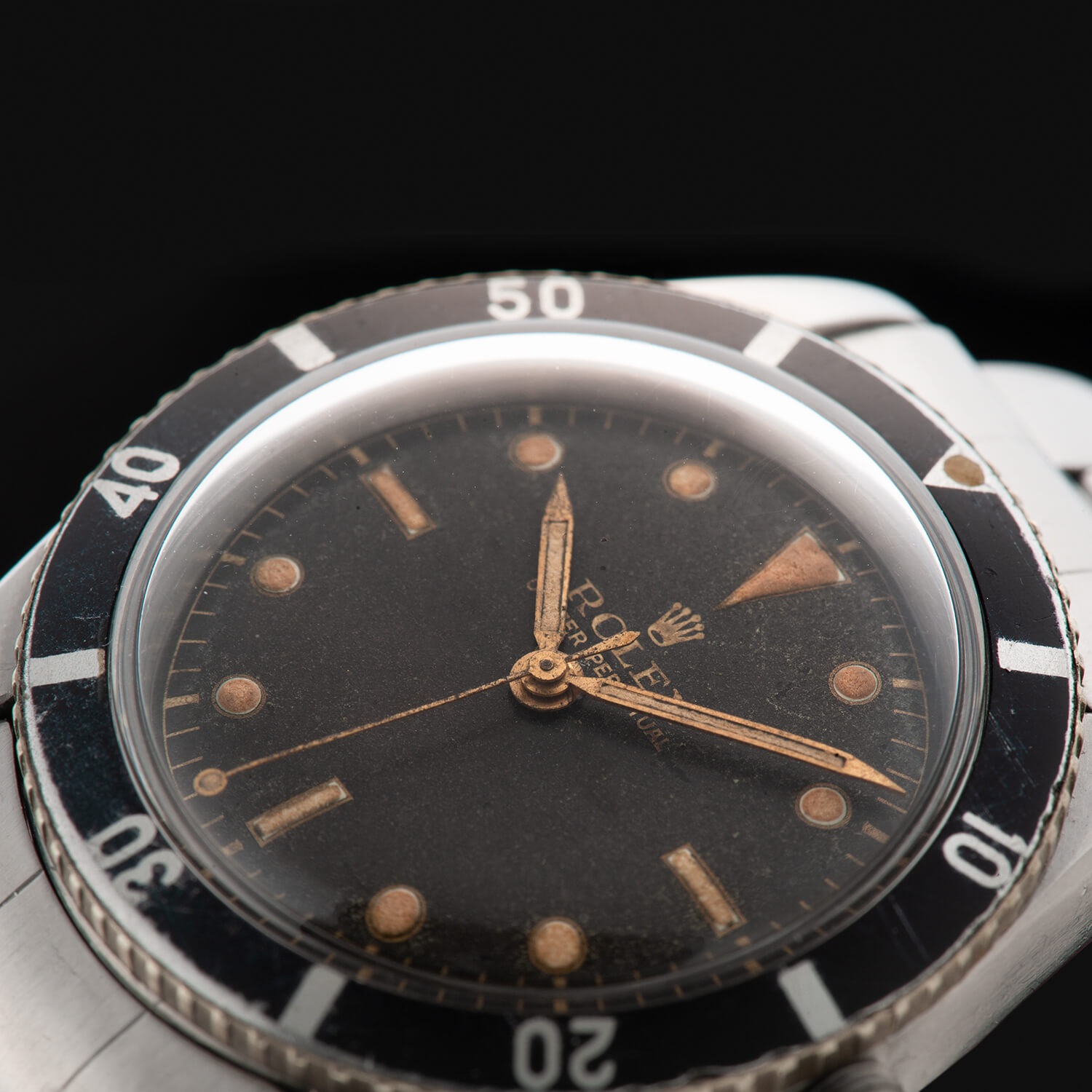 1954年から約1年間のみの製造と言われている稀少なモデルで、リューズガードがないケース、0から15まで分刻みのないベゼルインサート、サークル付きのミラーダイアルにはメルセデスハンドではなくペンシル型の長短針と小さめのロリポップを先端に配した秒針が付いたアーリーサブにしか見られないディテールとなります。