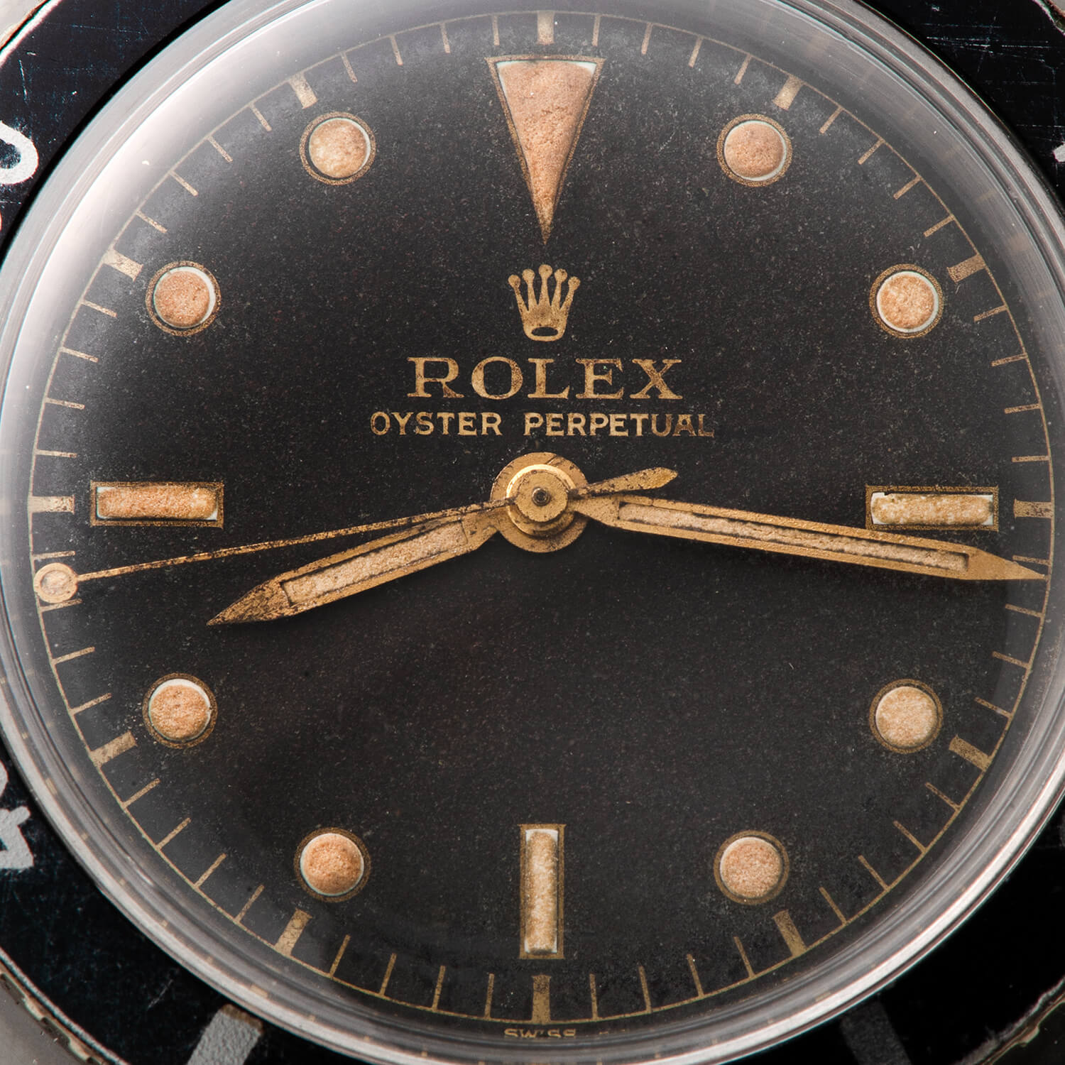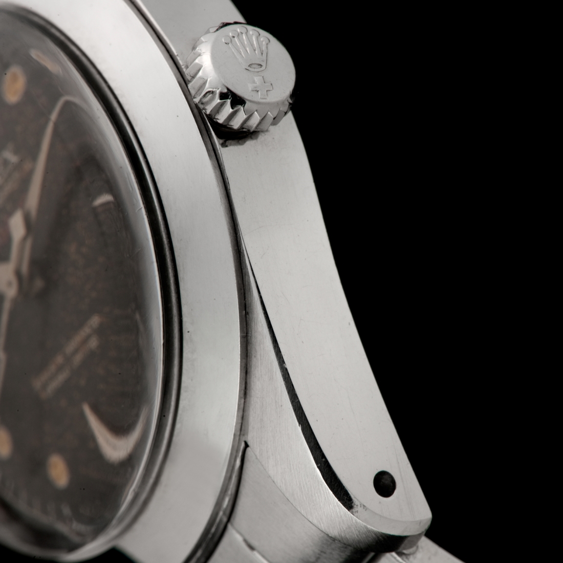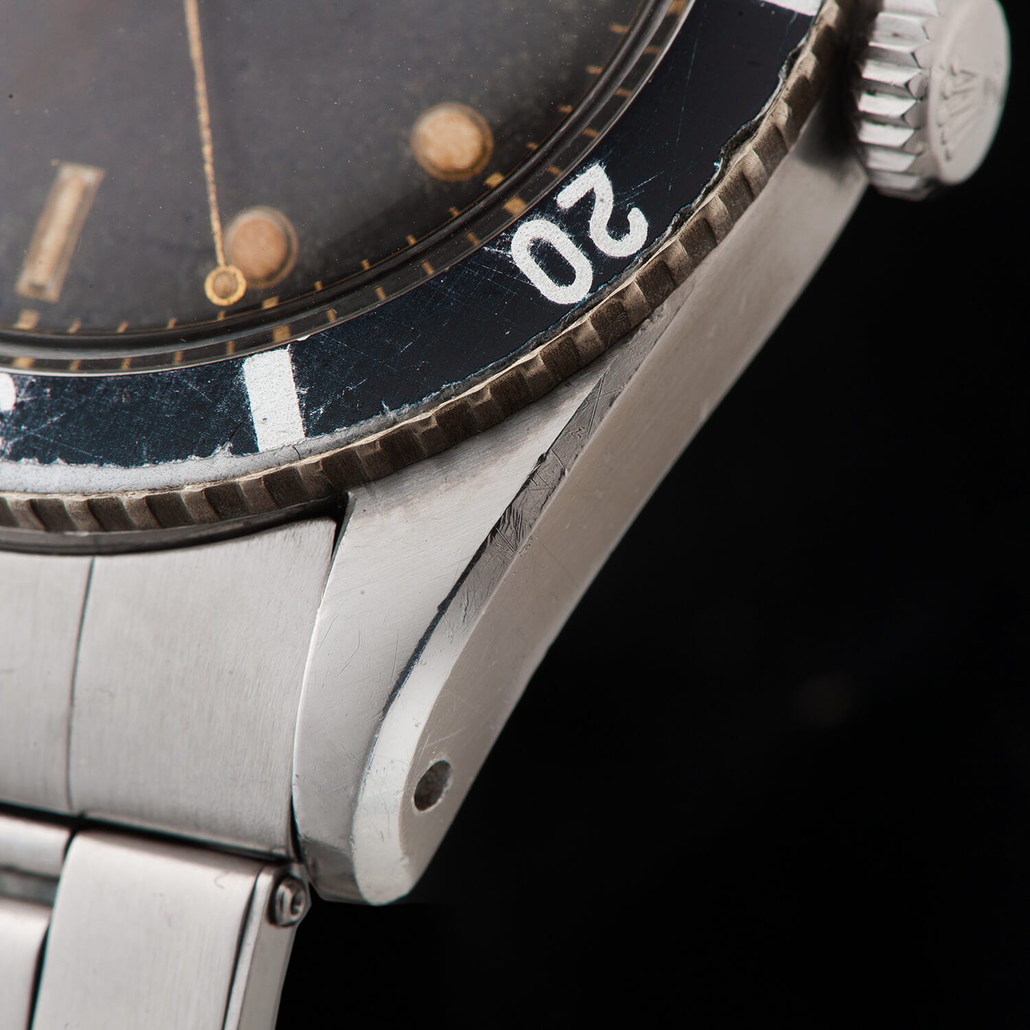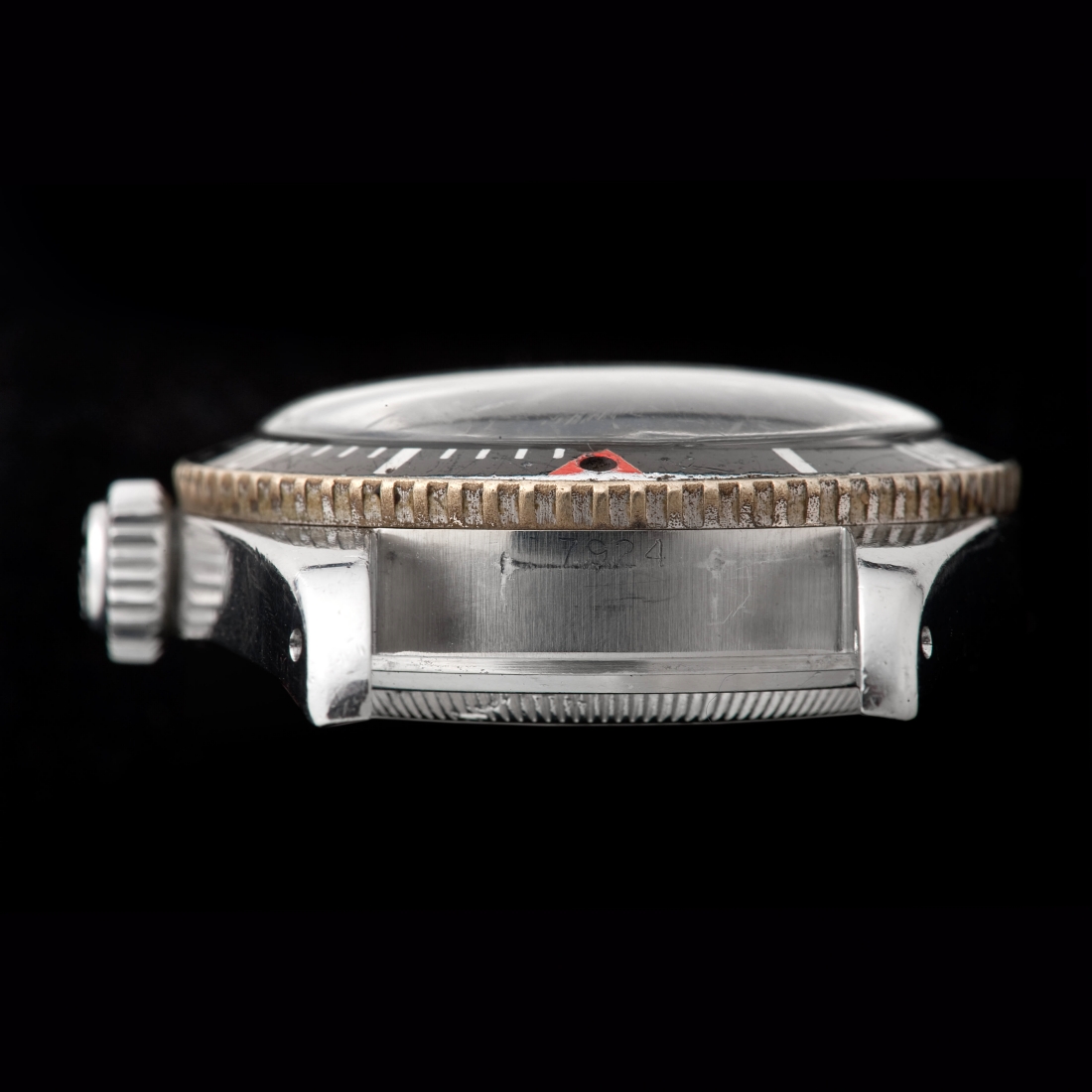 1954年から約1年間のみの製造と言われている稀少なモデルで、リューズガードがないケース、0から15まで分刻みのないベゼルインサート、サークル付きのミラーダイアルにはメルセデスハンドではなくペンシル型の長短針と小さめのロリポップを先端に配した秒針が付いたアーリーサブにしか見られないディテールとなります。