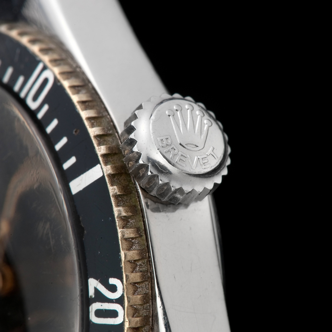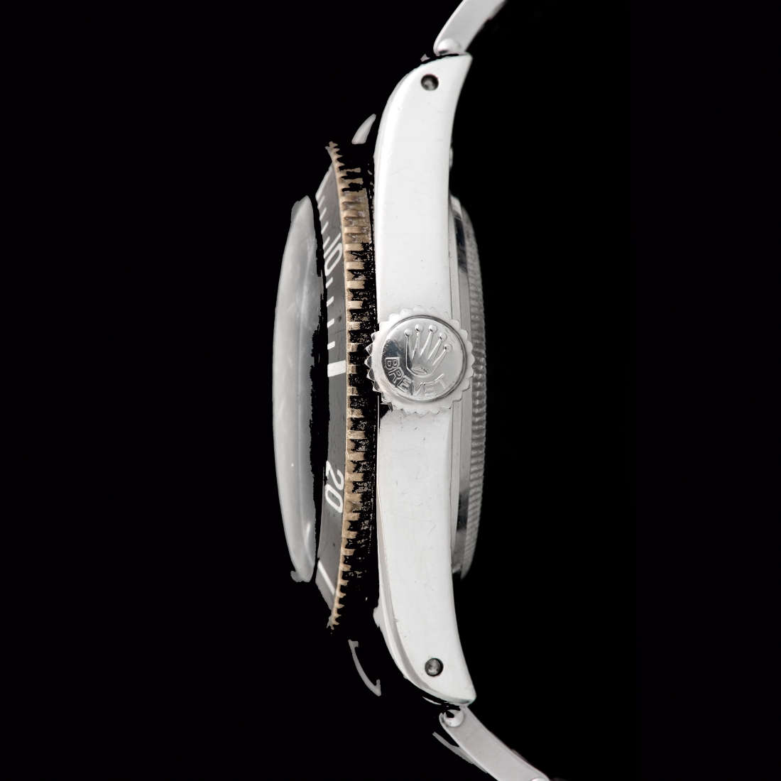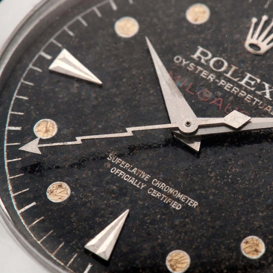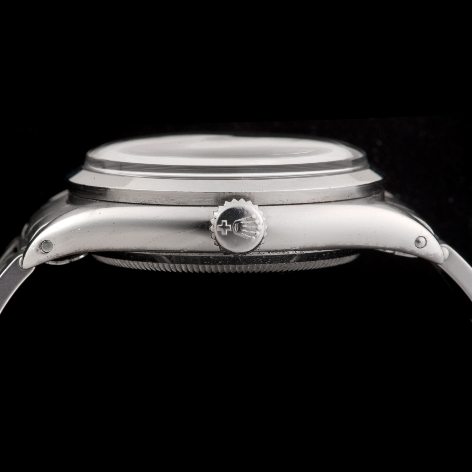 1954年から約1年間のみの製造と言われている稀少なモデルで、リューズガードがないケース、0から15まで分刻みのないベゼルインサート、サークル付きのミラーダイアルにはメルセデスハンドではなくペンシル型の長短針と小さめのロリポップを先端に配した秒針が付いたアーリーサブにしか見られないディテールとなります。