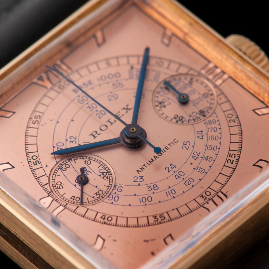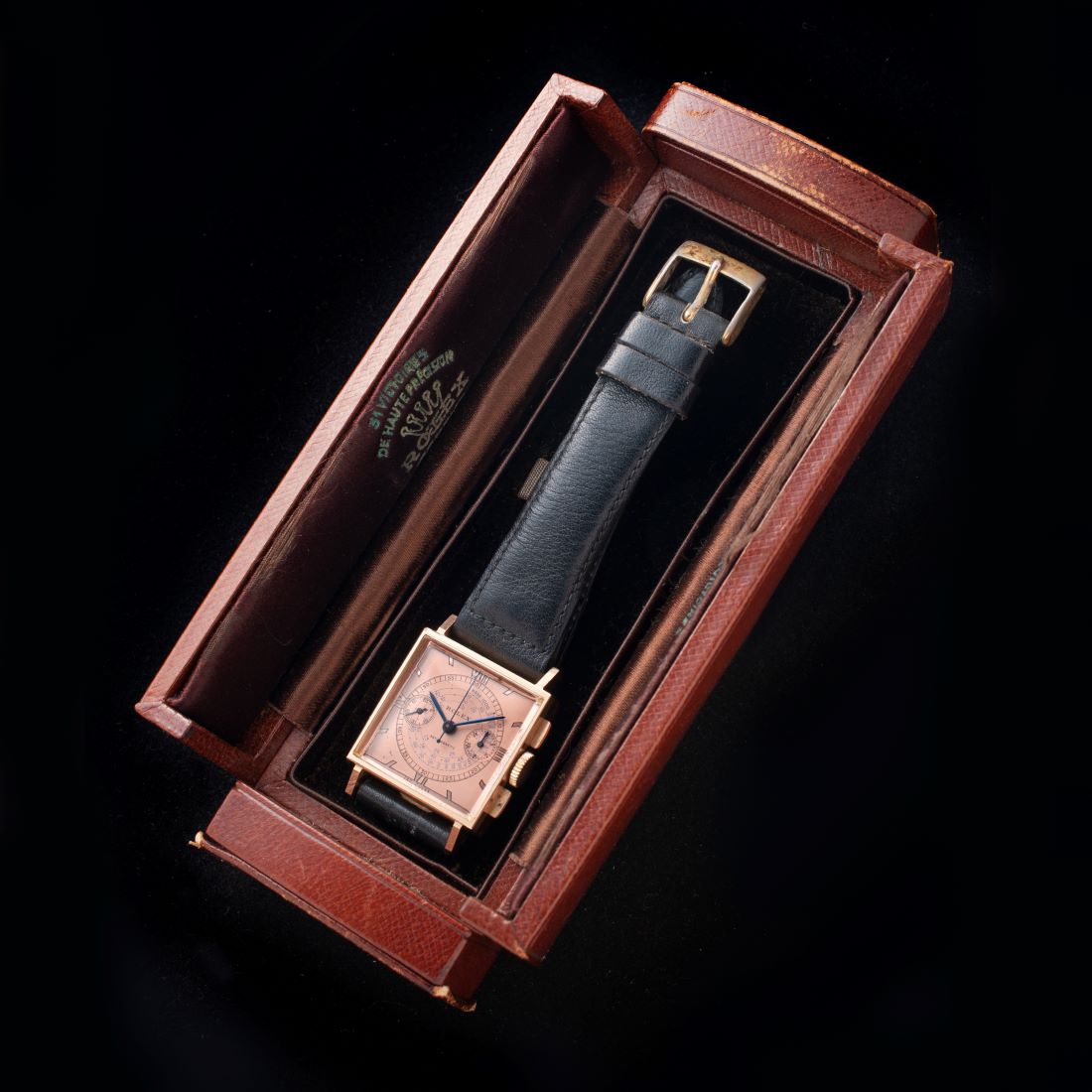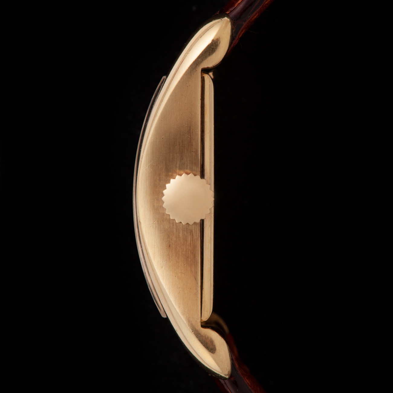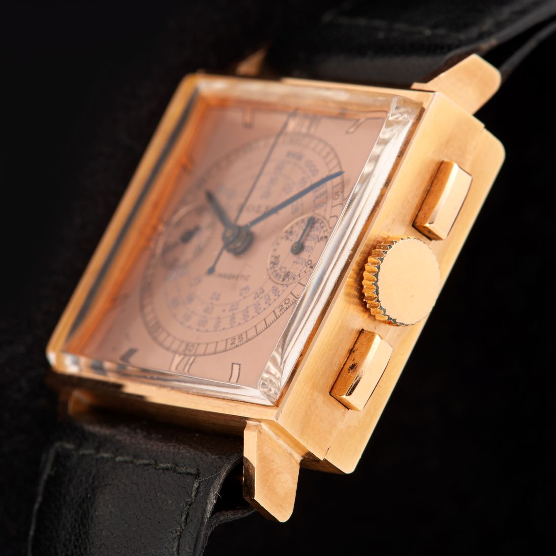 非常に希少なアンポリッシュの角型クロノグラフです。ケースは文字盤の色味と合ったピンクゴールドとなり、磨きが入っていないためオリジナルのヘアーラインがはっきりと確認できます。文字盤の内周にはブルーレターでスネイルタキメーターが配され、ブルースチール製の針の青色にマッチしております。また、外周は鏡面状に仕上げされたローマ数字が放射状に配され、アールデコの時代背景が文字盤に凝縮されております。裏蓋に刻まれた王冠マークもこの時代ならではのユニークなデザインです。機械は世界最小クロノグラフムーヴメントの一つ、バルジュー69が搭載されております。