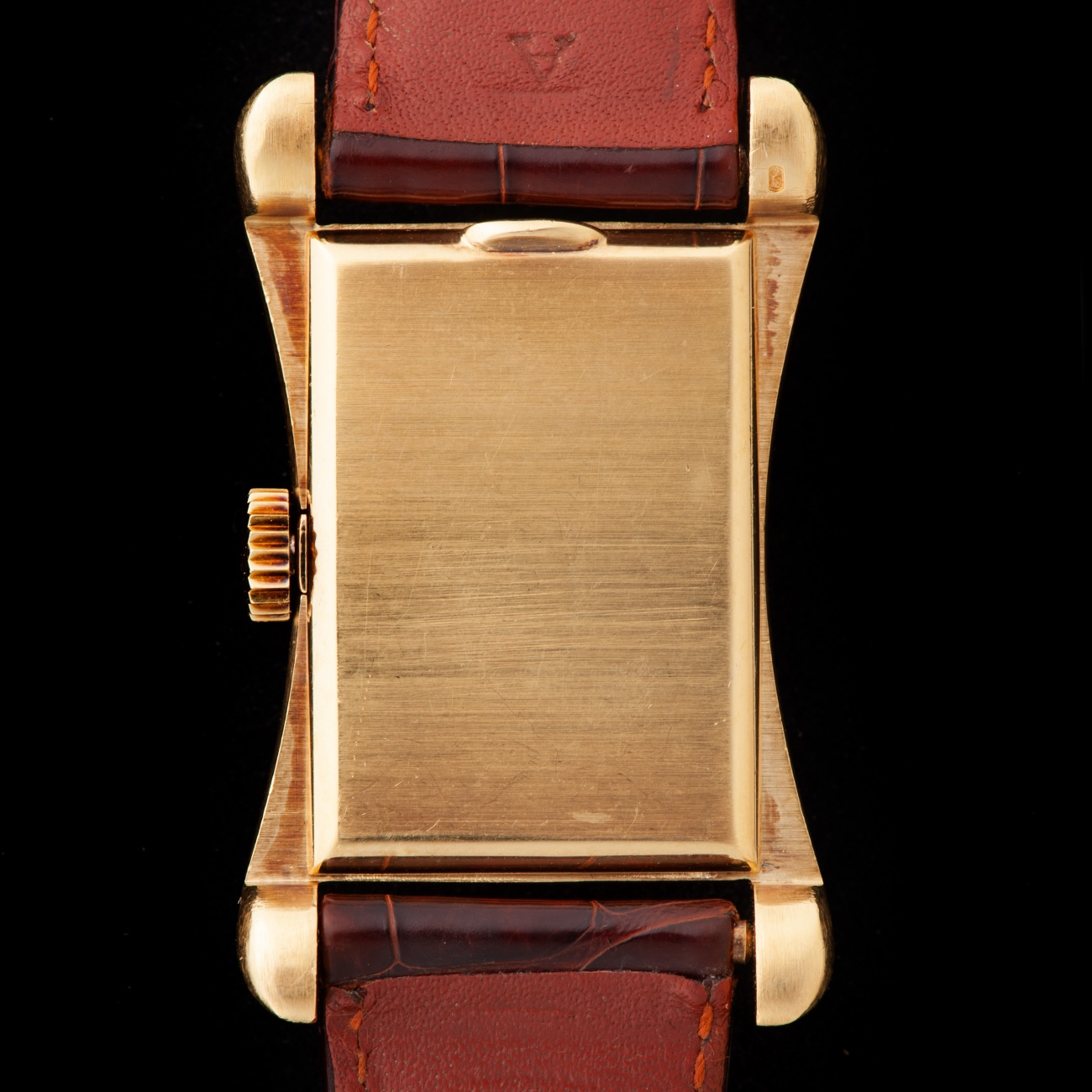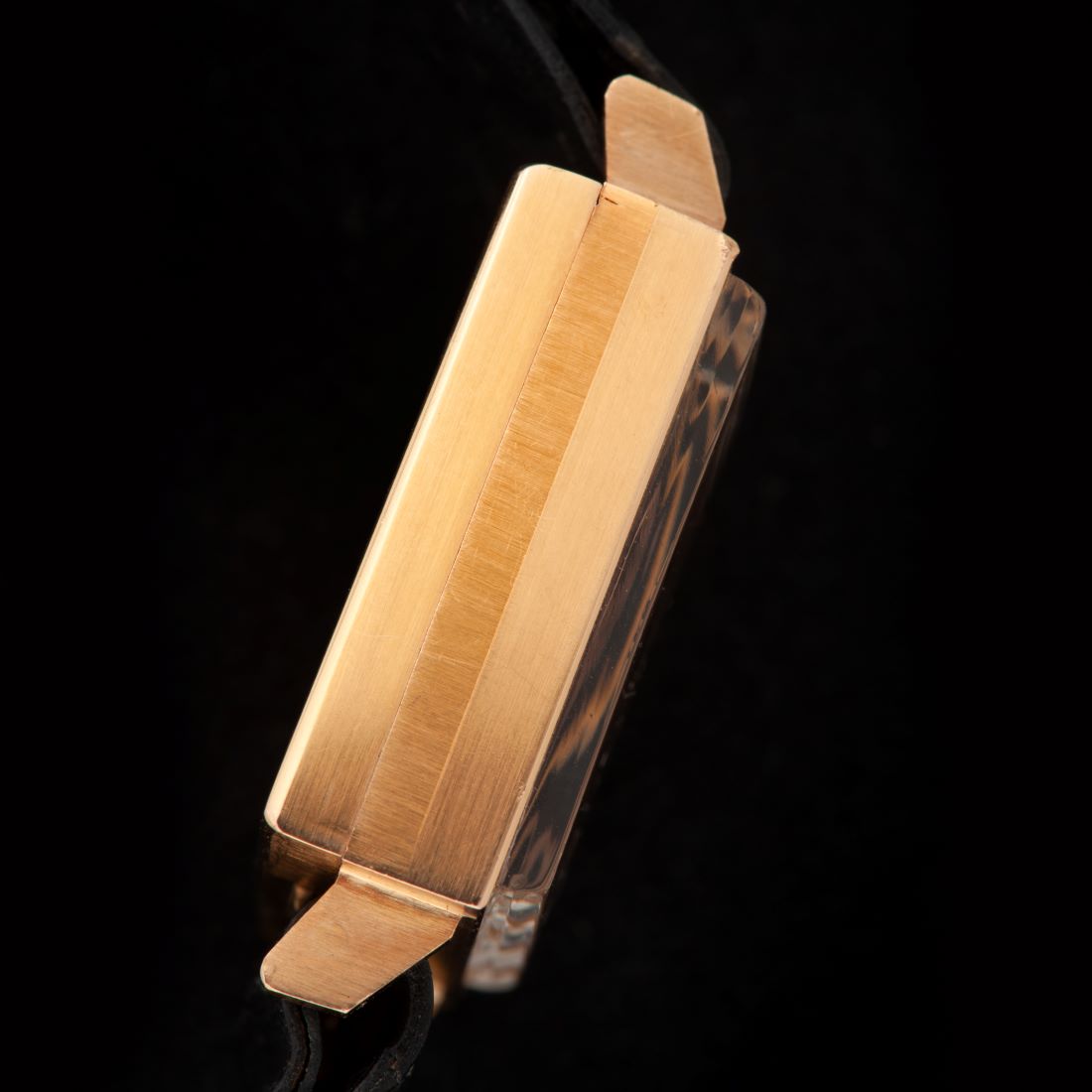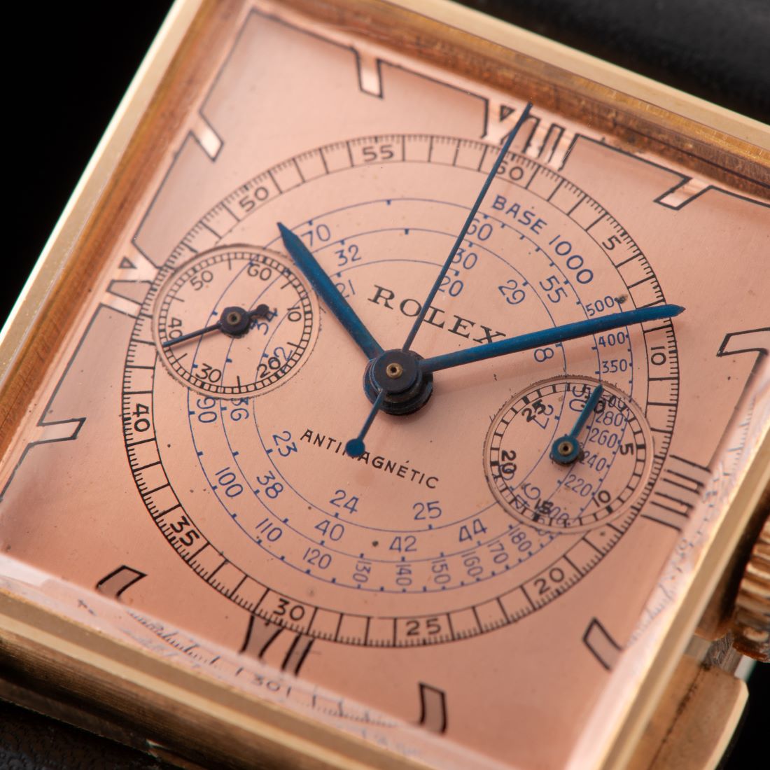 非常に希少なアンポリッシュの角型クロノグラフです。ケースは文字盤の色味と合ったピンクゴールドとなり、磨きが入っていないためオリジナルのヘアーラインがはっきりと確認できます。文字盤の内周にはブルーレターでスネイルタキメーターが配され、ブルースチール製の針の青色にマッチしております。また、外周は鏡面状に仕上げされたローマ数字が放射状に配され、アールデコの時代背景が文字盤に凝縮されております。裏蓋に刻まれた王冠マークもこの時代ならではのユニークなデザインです。機械は世界最小クロノグラフムーヴメントの一つ、バルジュー69が搭載されております。