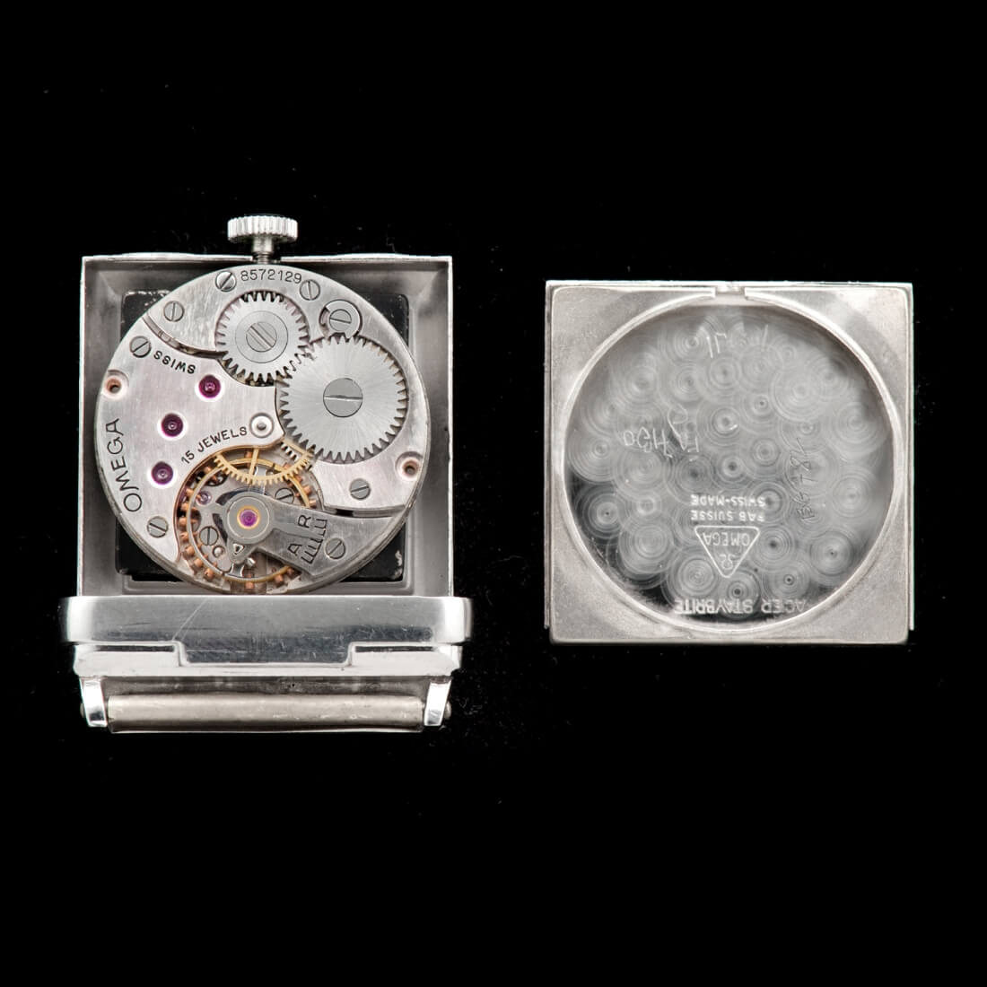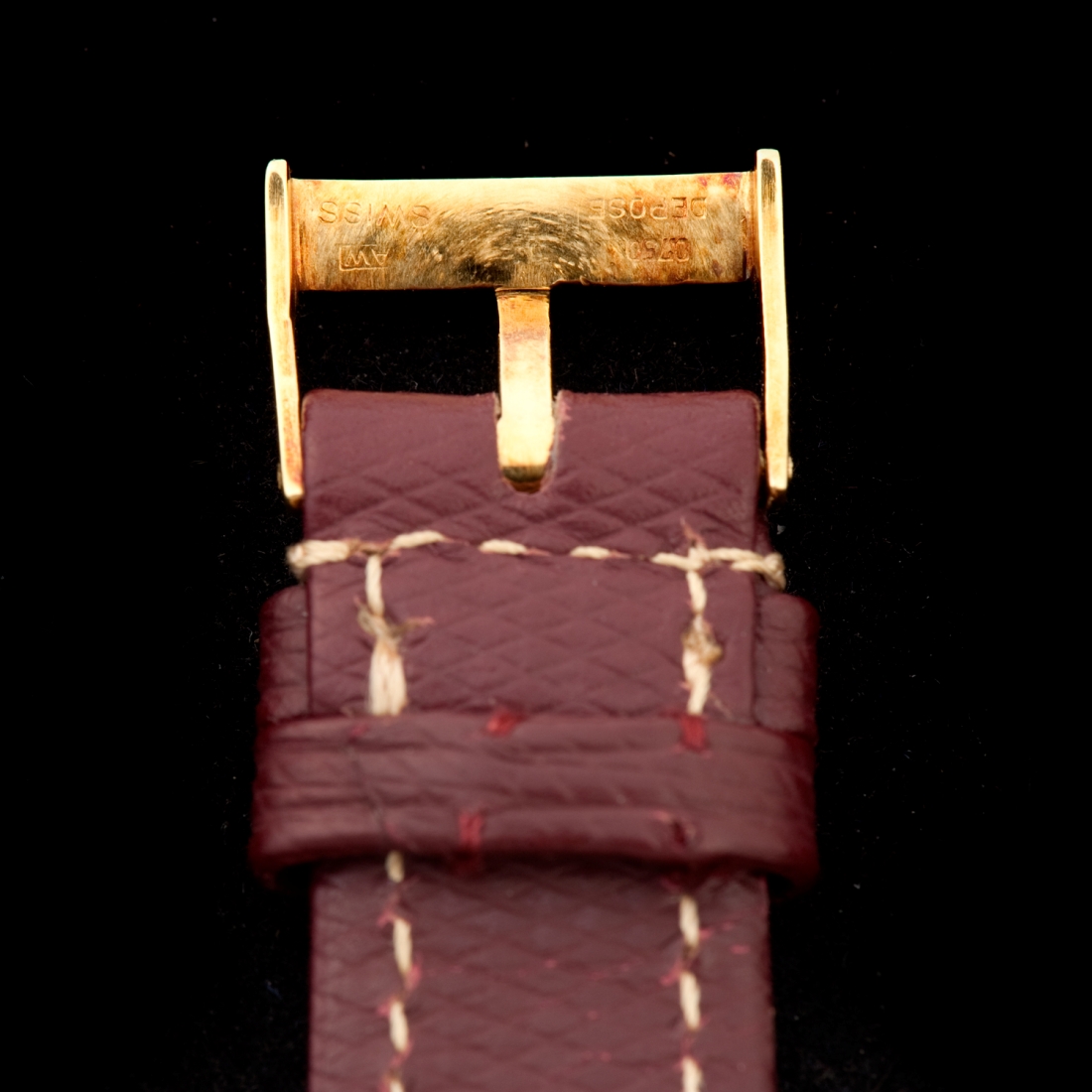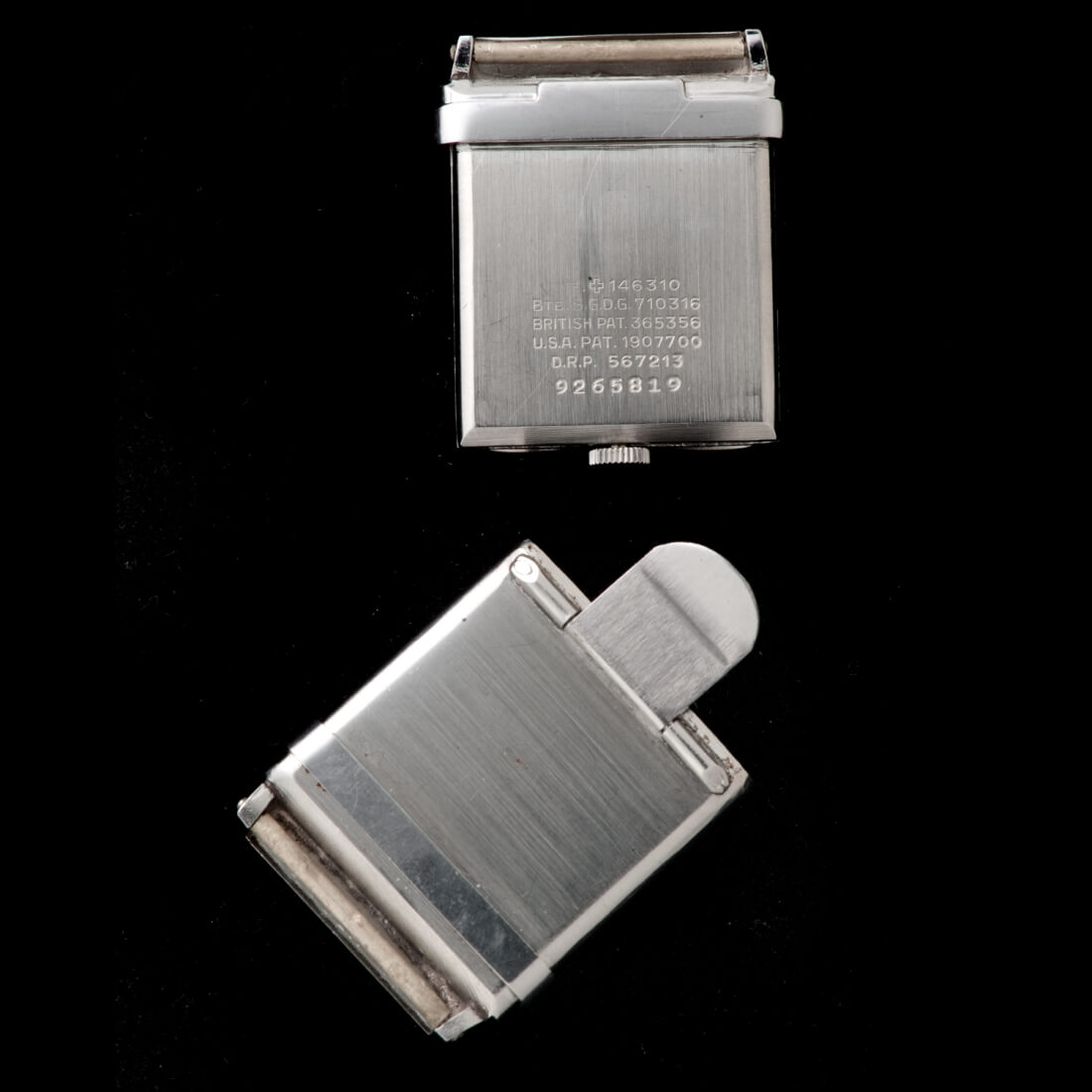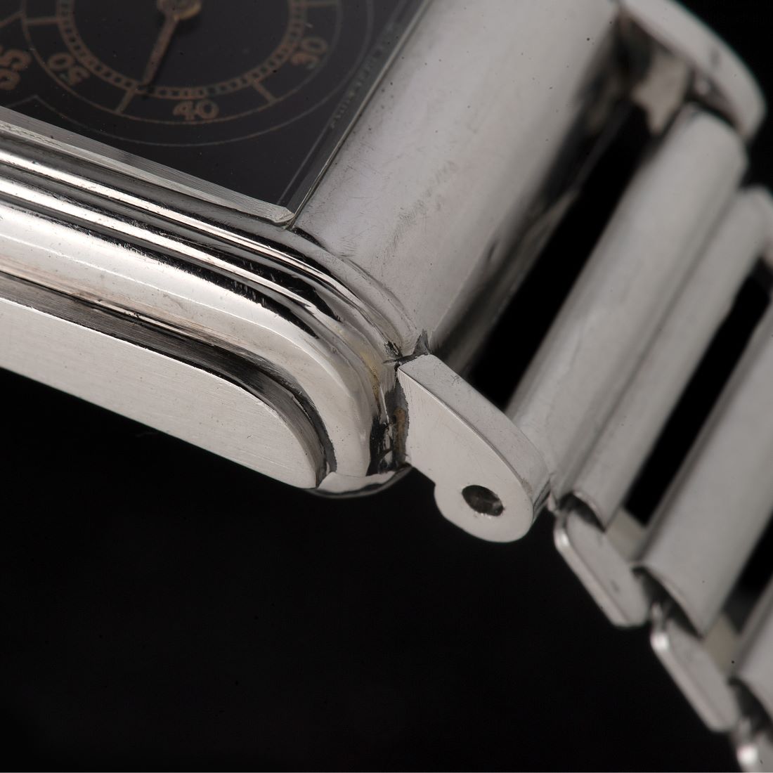 非常に希少なアンポリッシュの角型クロノグラフです。ケースは文字盤の色味と合ったピンクゴールドとなり、磨きが入っていないためオリジナルのヘアーラインがはっきりと確認できます。文字盤の内周にはブルーレターでスネイルタキメーターが配され、ブルースチール製の針の青色にマッチしております。また、外周は鏡面状に仕上げされたローマ数字が放射状に配され、アールデコの時代背景が文字盤に凝縮されております。裏蓋に刻まれた王冠マークもこの時代ならではのユニークなデザインです。機械は世界最小クロノグラフムーヴメントの一つ、バルジュー69が搭載されております。