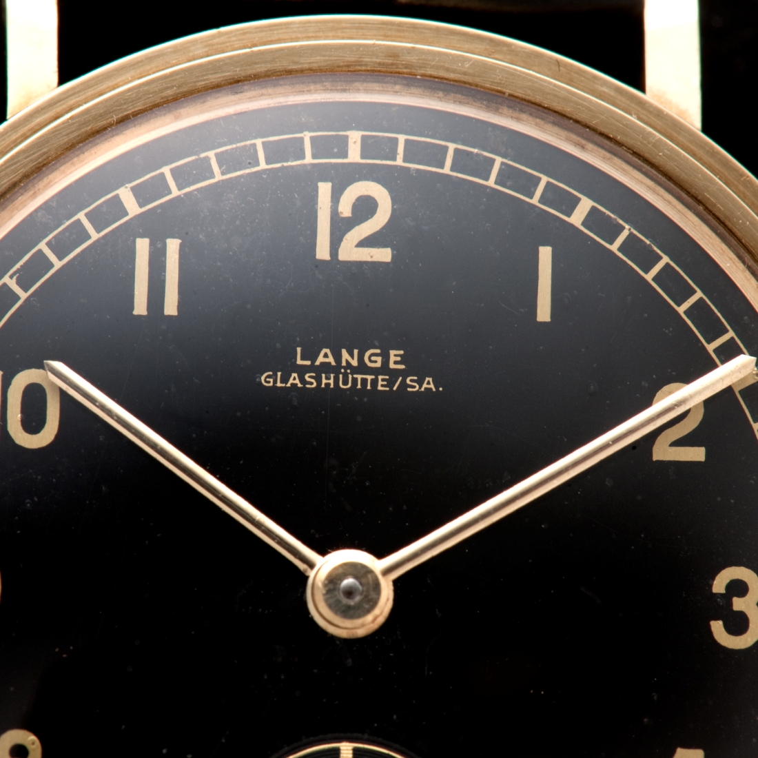 アイボリーカラーの文字盤には、金無垢素材のシャープなシルエットの剣針とクサビインデックスが使用されており、夜光塗料が使われていない仕様という事もあり、針やインデックスの鋭角的な輪郭線がより一層際立ちます。