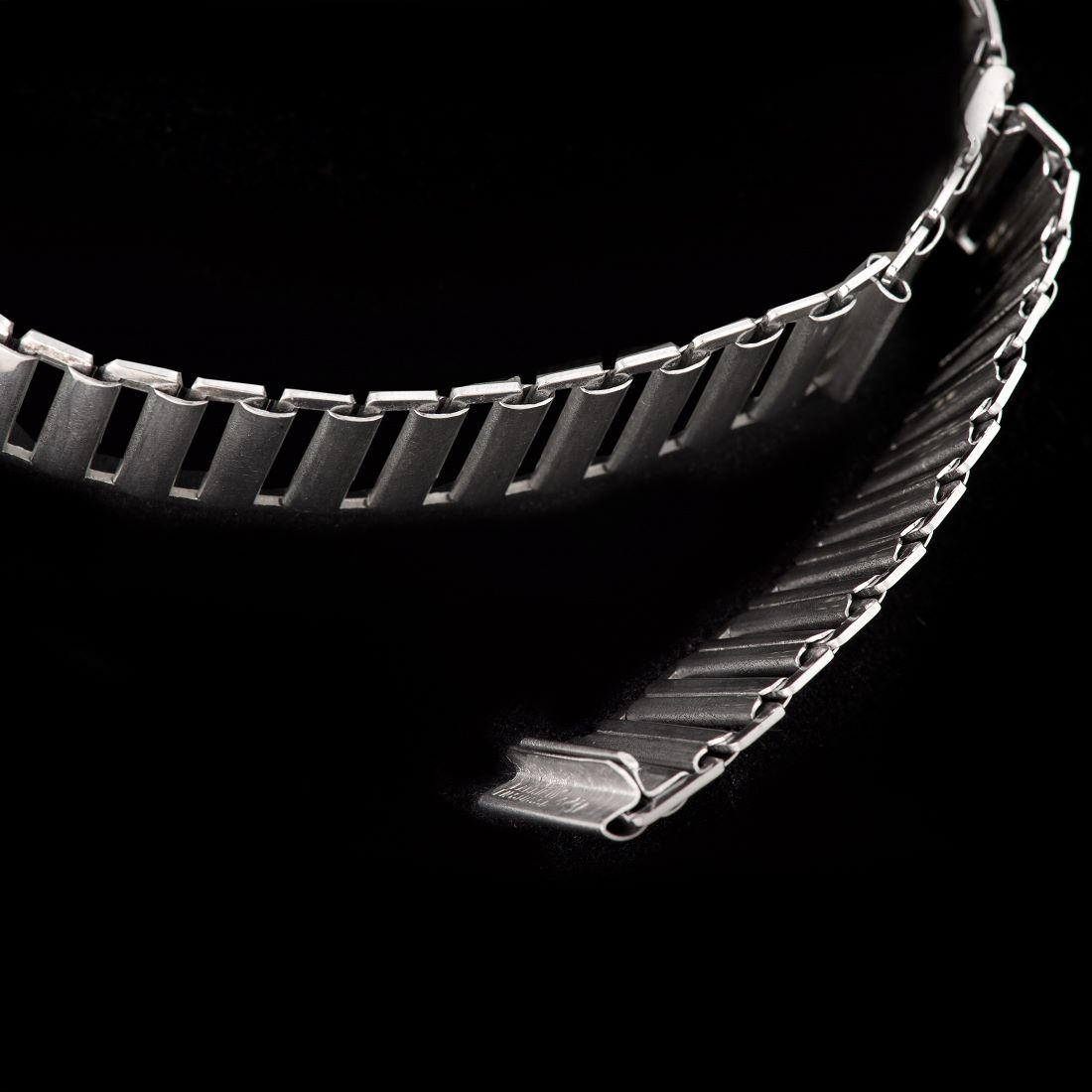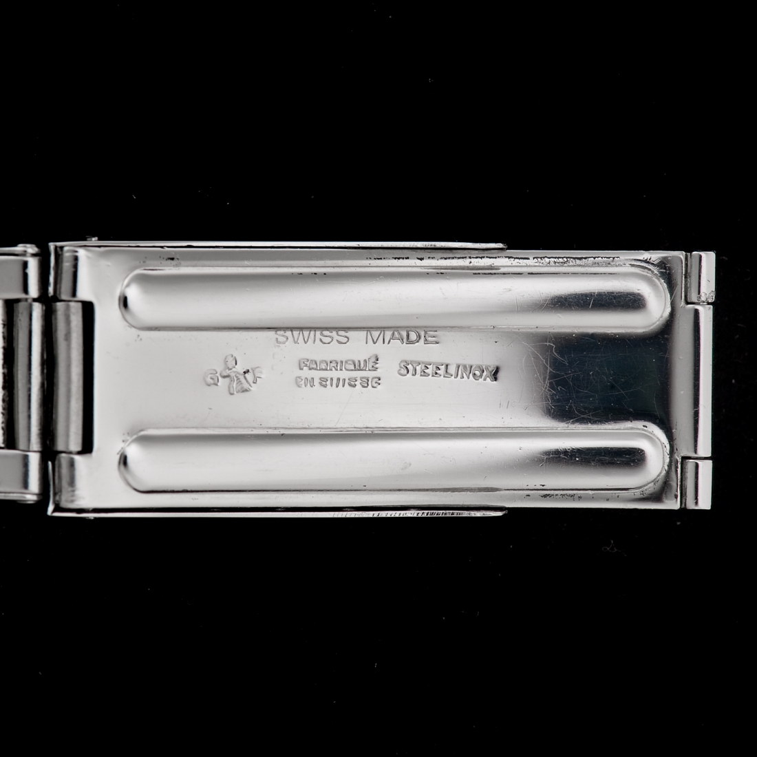また、ブレスレットにはスイス製のGay Freres社とアメリカ製のJB Champion社のものがあり、こちらはGay Freres製で、FFにはトリコンパックス用の”UW”のものが付きます。一見ラグをはみ出るようなボリューム感ですが、この貴重なFFこそがメーカー推奨のマッチングです。