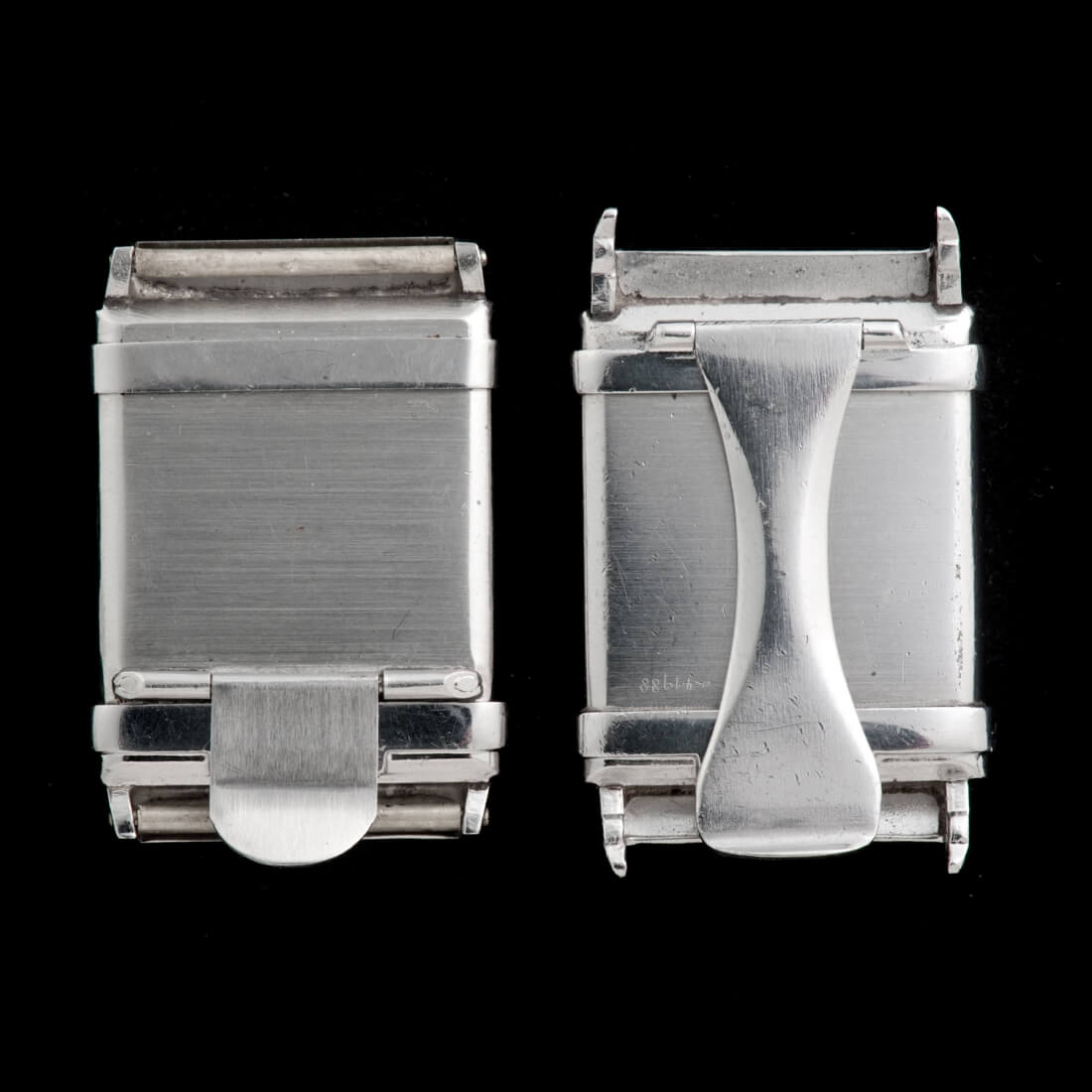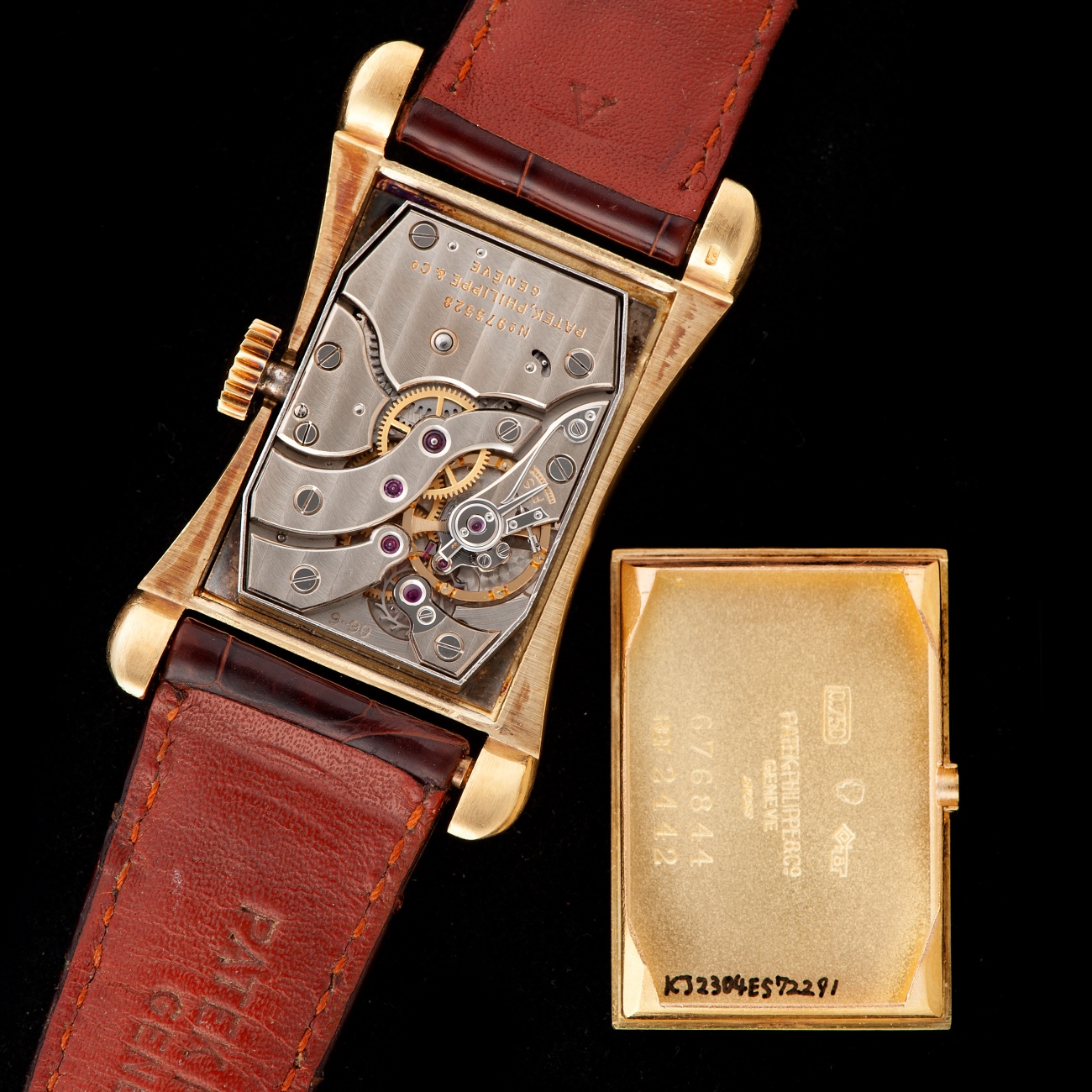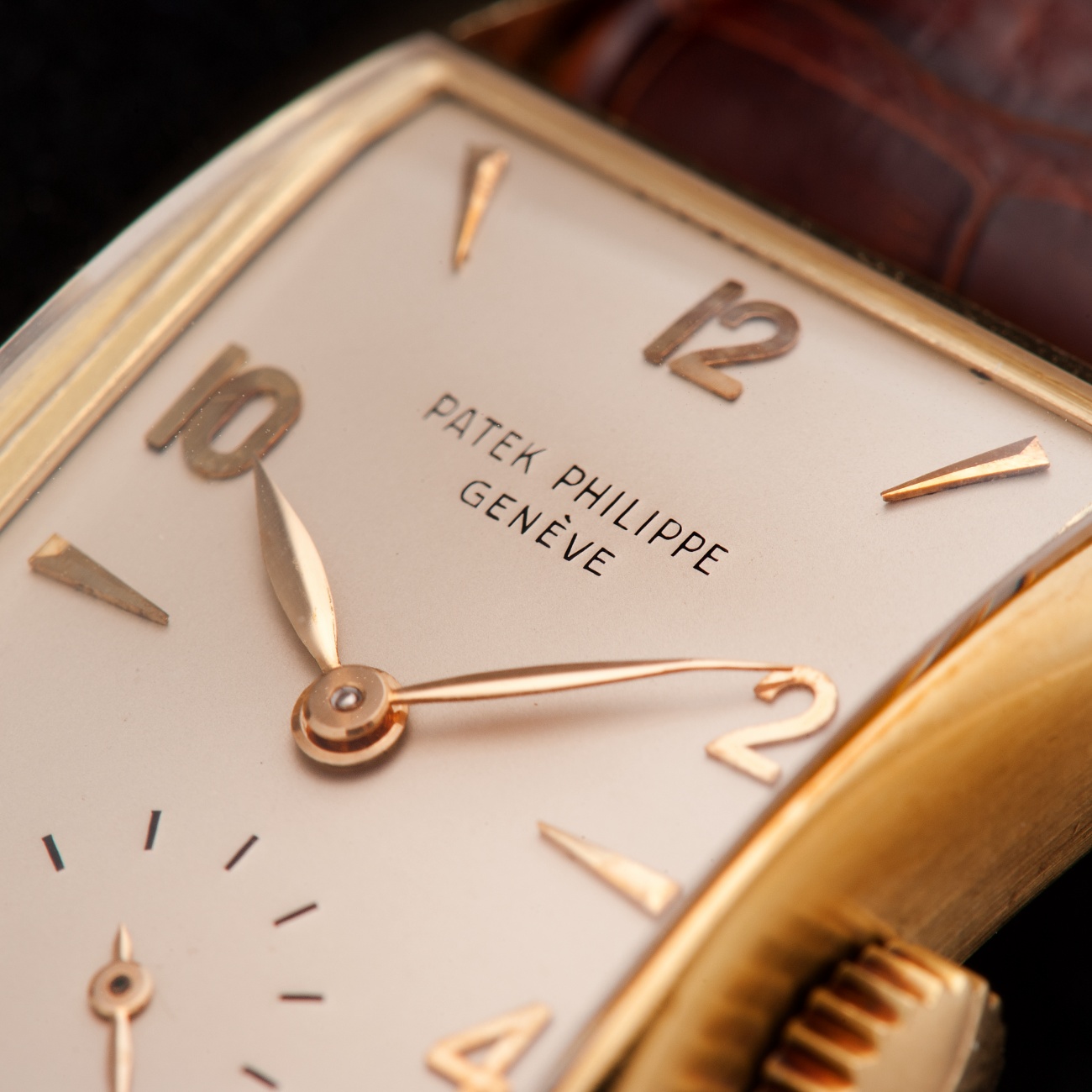 このRef.2442はケース形状から「耳たぶ」や「バナナ」などの愛称で愛好家の間では呼ばれています。こちらはパテック・フィリップのレクタングルモデルの中では、非常に評価の高いモデルです。他に類を見ない独創的なラグのシェイプは、手首に乗せた時のサイドビューも美しく非常に優雅。アンポリッシュの奇跡的なコンディションでムーブメントは角型ムーブといて名高いCal.9-90を搭載しています。