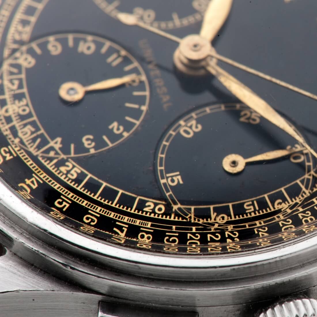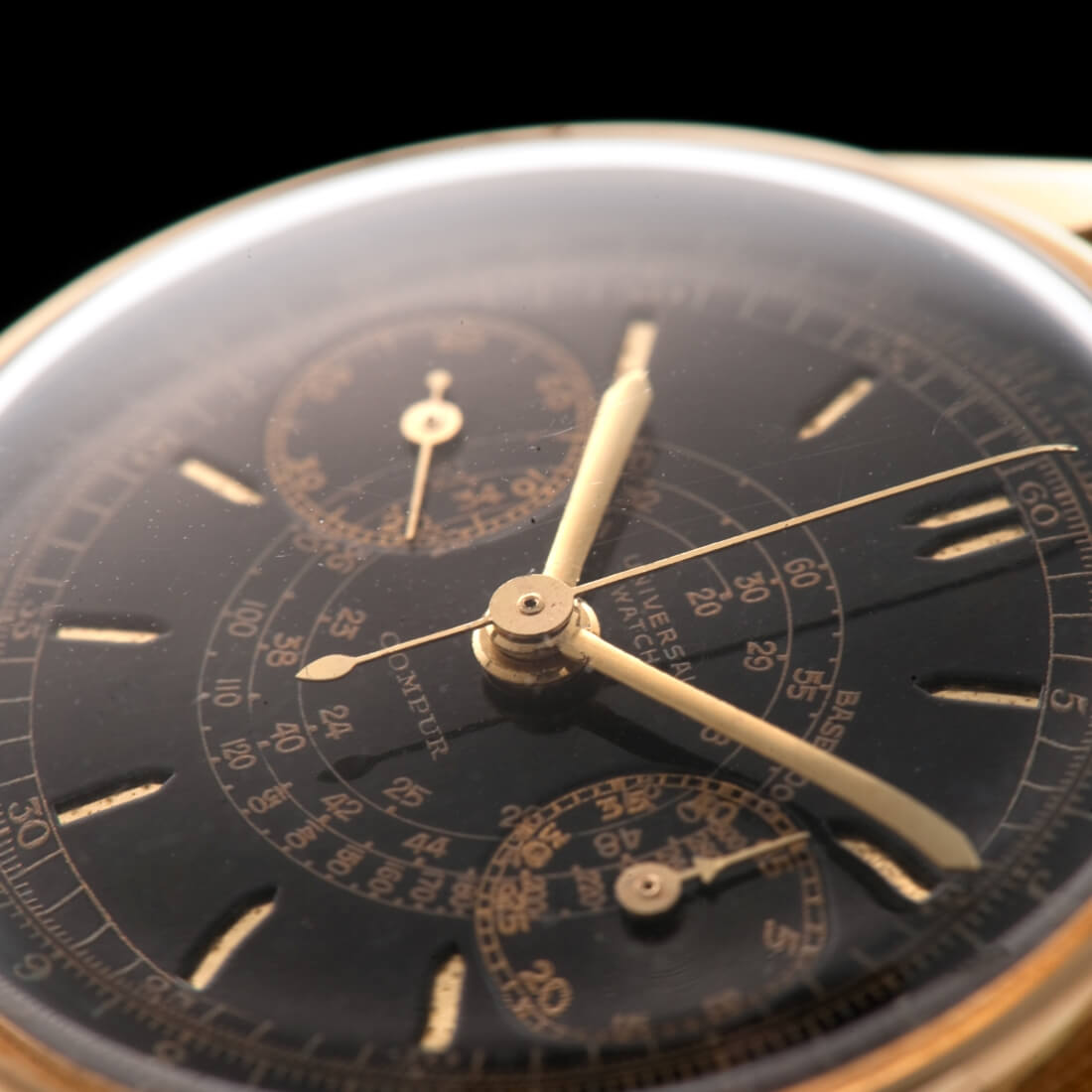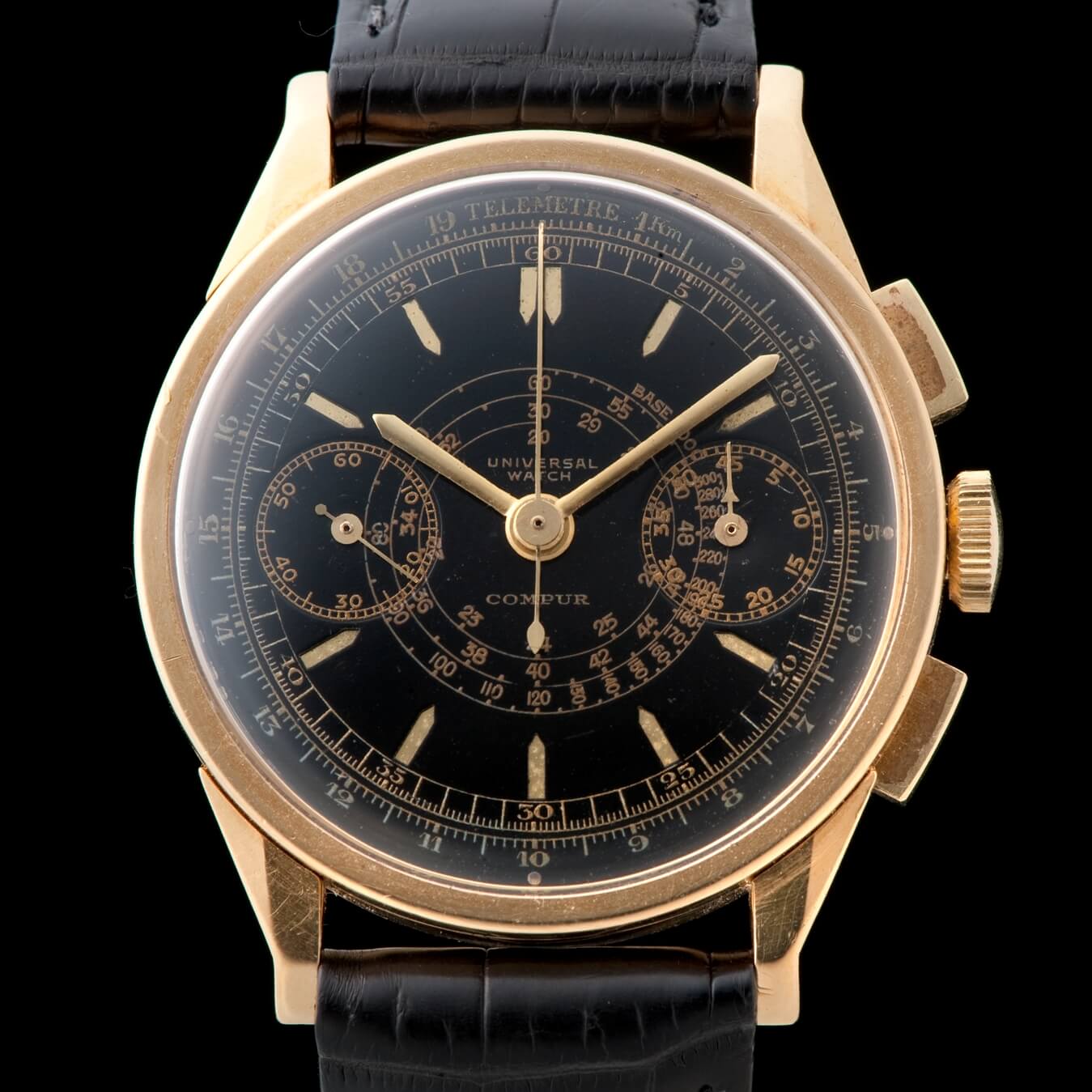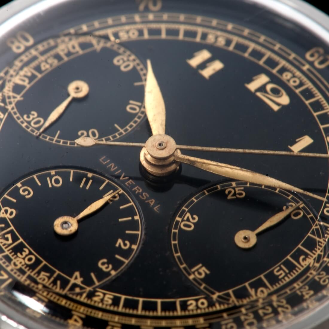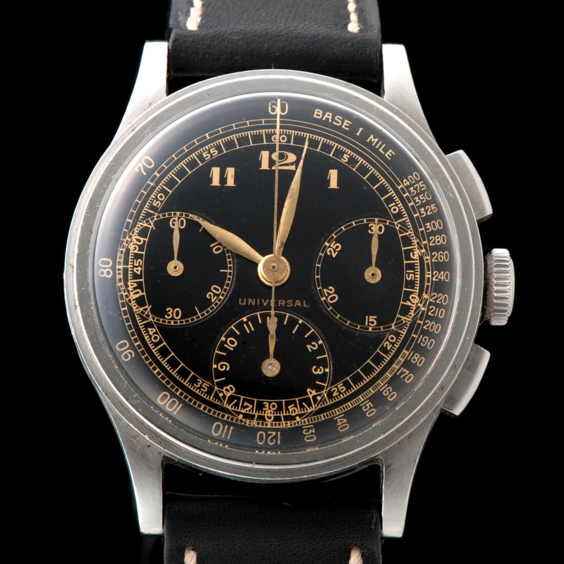 UNIVERSAL WATCHの2つ目クロノ”COMPUR”、稀少なサンドイッチ、ブラックダイアルです。
