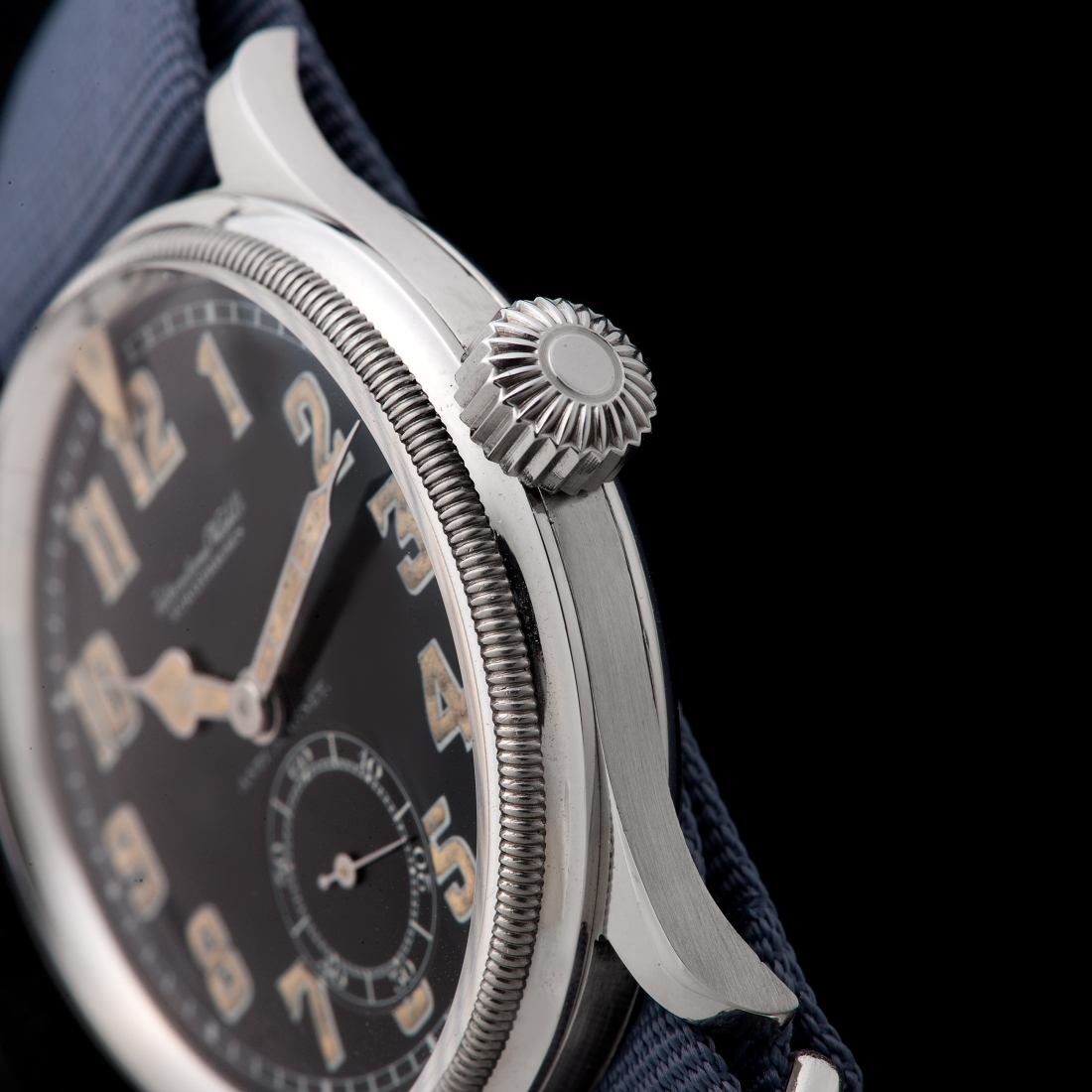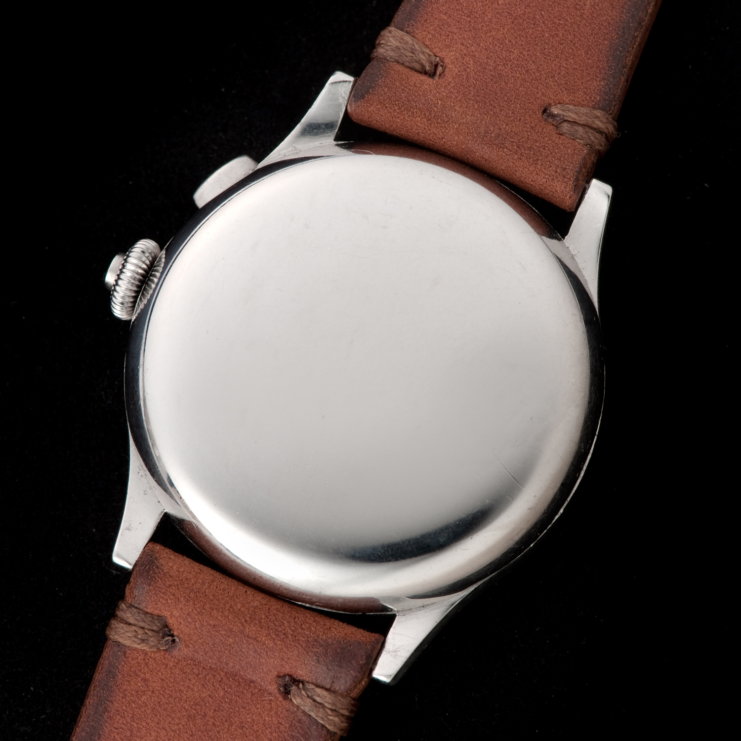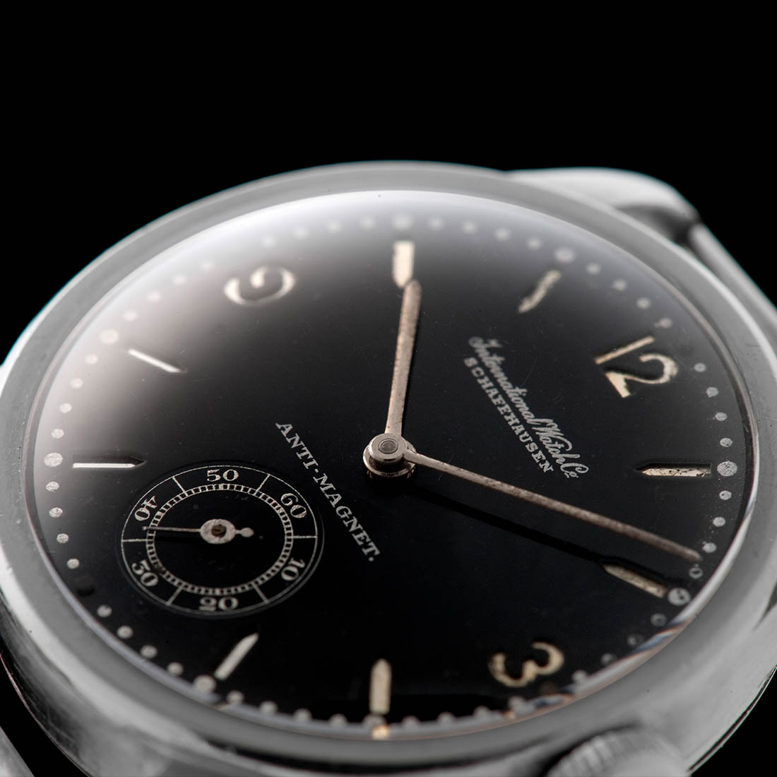 加えてこの年代はスナップバックが主流の中、こちらはスクリューバック仕様の点も評価できます。ステンレスケース、ブラックダイアル、スクリューバックと希少性を全て備えながら、IWC、中でも知られつくされたメジャーなムーブメントCal.83でこちらの時計が存在したことは、今後ROLEXやOMEGAでもこの様なものが見つかる可能性を感じさせる希望ある発見でした。