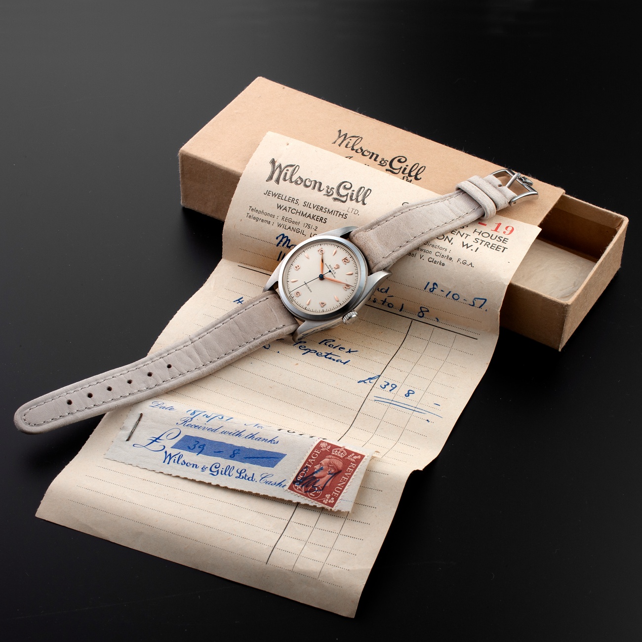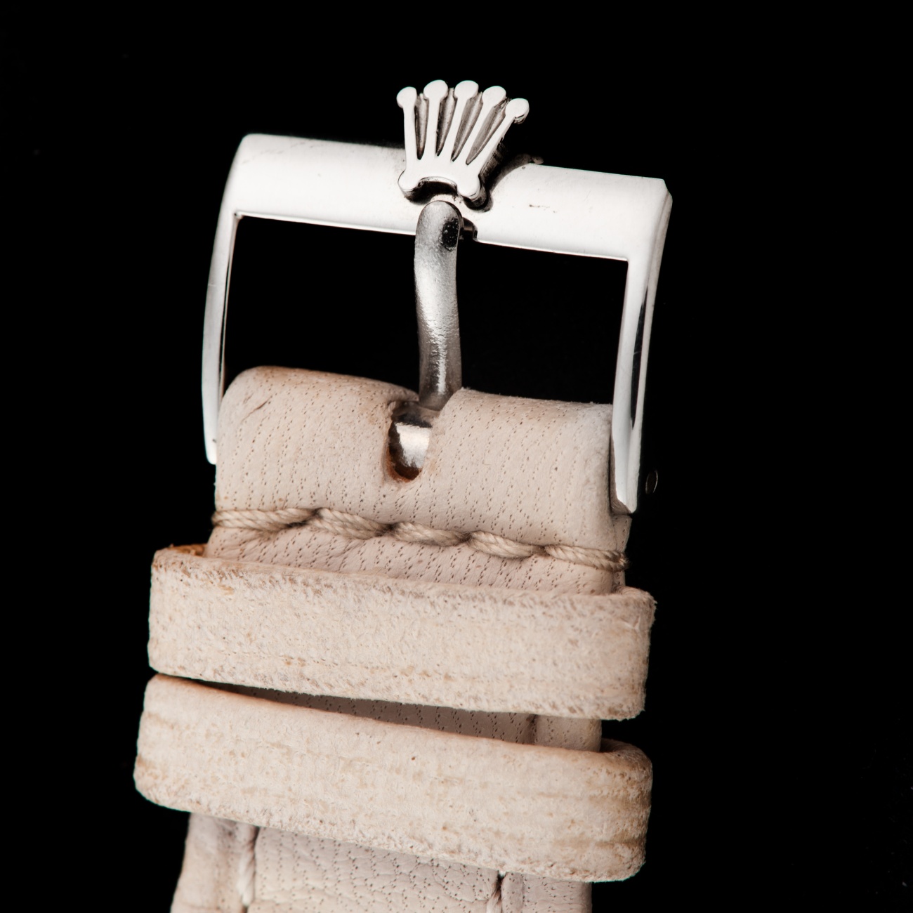 所謂セミバブルよりも一回りサイズが大きい“ビッグバブル”と呼ばれるモデルです。アンポリッシュでオリジナルの皮ベルト、尾錠、レシートまで残った素晴らしい逸品です。パウダーホワイトダイアルに美しいピンクインデックスが映え渡ります。
