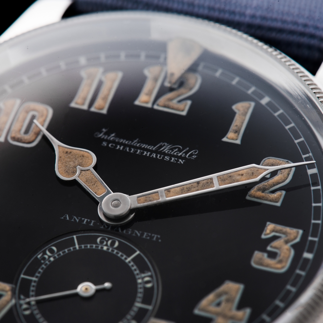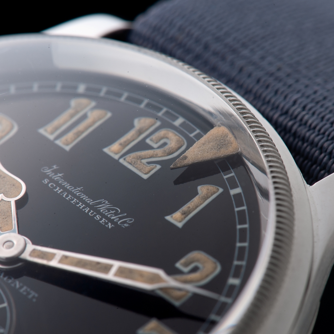 ダイアルは艶が十分に残ったブラックミラーダイアルで、視認性の高い夜光アラビア数字と、短針のデザインが特徴的な夜光ハンドとの組み合わせです。リューズはグローブをはめても操作しやすいようにかなり大きめなものが使用されております。軍用時計らしく、インナーカバーで保護されたムーブメントはこの年代のIWCを代表するCal.83が搭載されております。