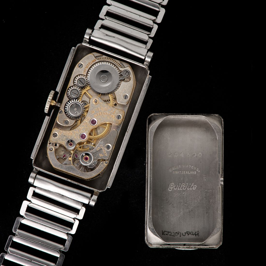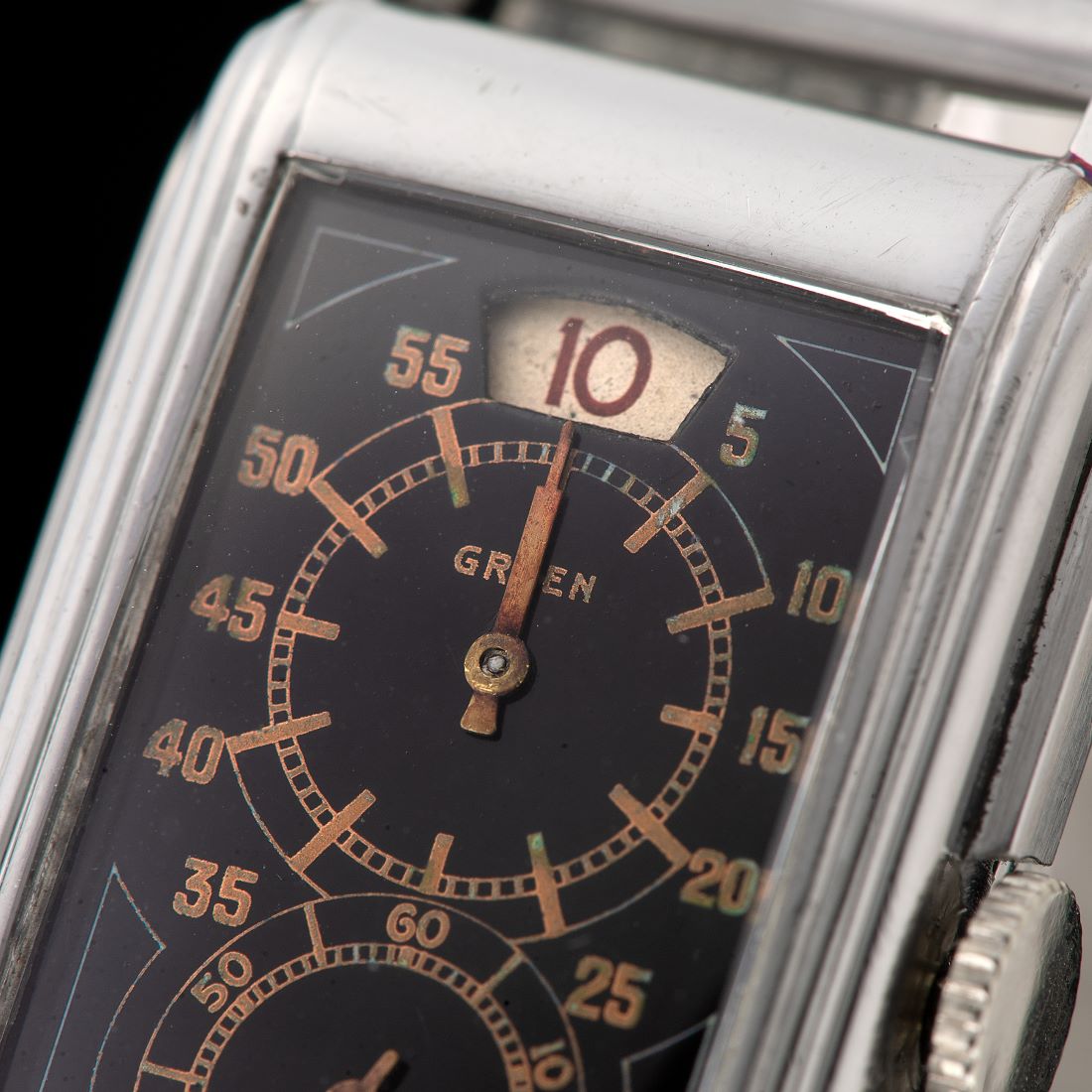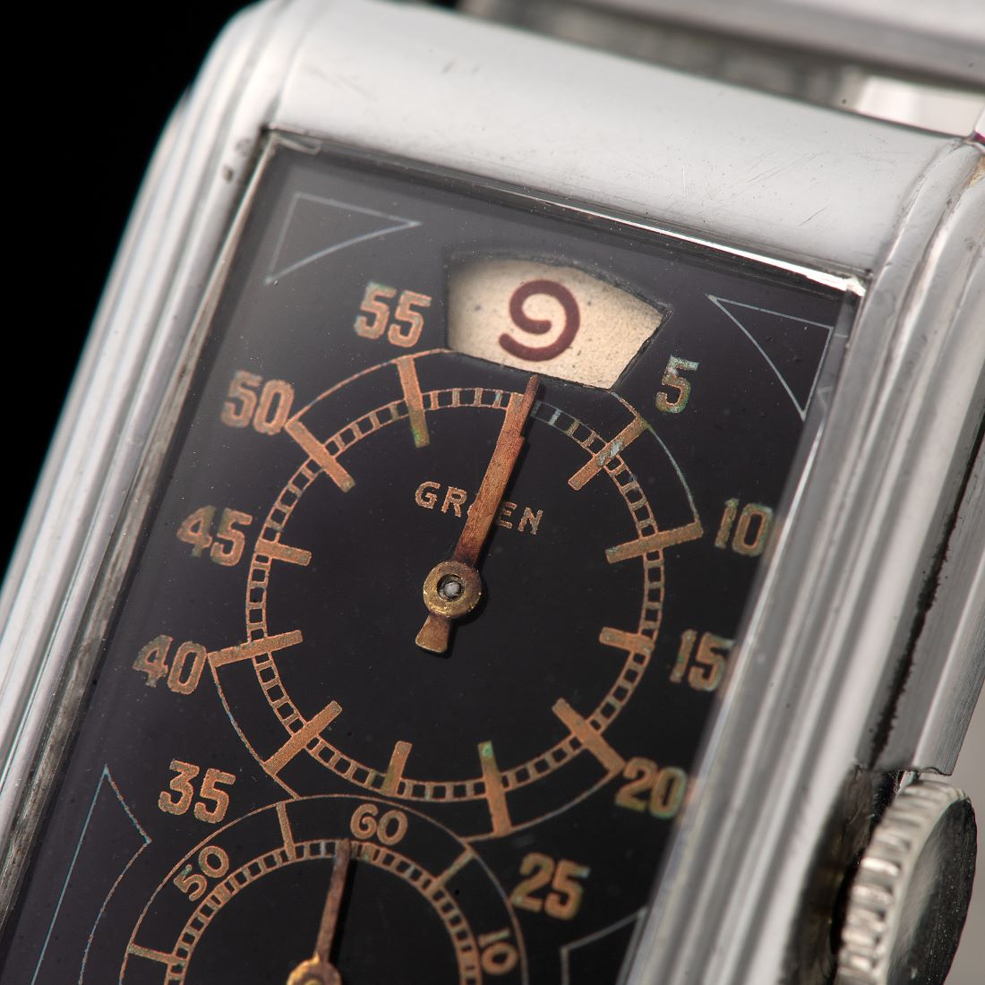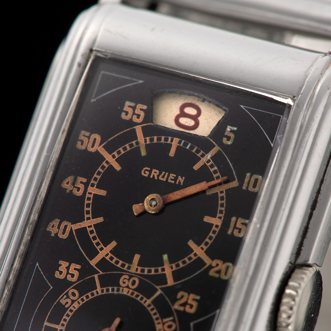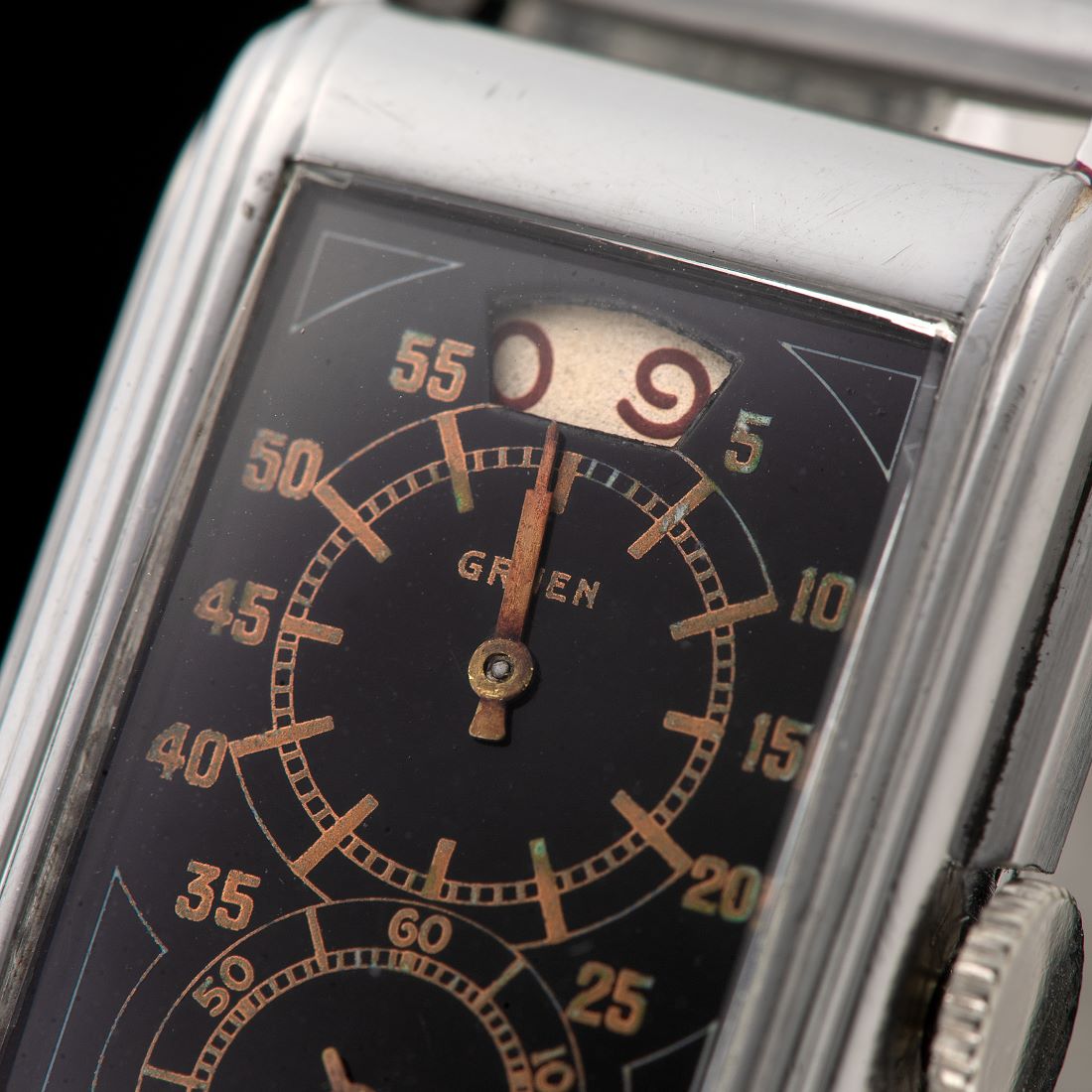 ドクターズウォッチの中でも稀少性の高いジャンピングアワーです。金張り、シルバー、金無垢などいくつかのバリエーションがあるGRUENのドクターズウォッチにおいて、ステンレスケースは極めて珍しく、ジャンピングアワー仕様、しかもブラックダイアルという、珍しいスペックが詰まった時計です。12時位置の小窓で時(Hour)をデジタル表示したジャンピングアワーの下に、ピンクがかった粒状の塗料で分(Minutes)表示と秒(Second)を表示したブラックダイアルは、四隅の隙間を埋めるように、ホワイトで幾何学的なプリントした手の込んだつくりです。ケースはスリーステップのアールデコデザインで、幾何学調のダイアルとバランスのとれた素晴らしいデザインです。自社製cal.877はROLEXのプリンスにも供給されたGRUENを代表する名機です。