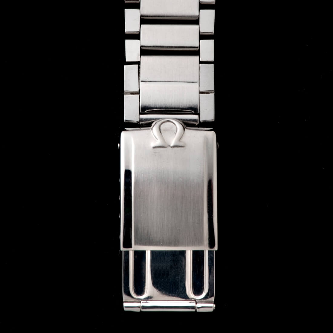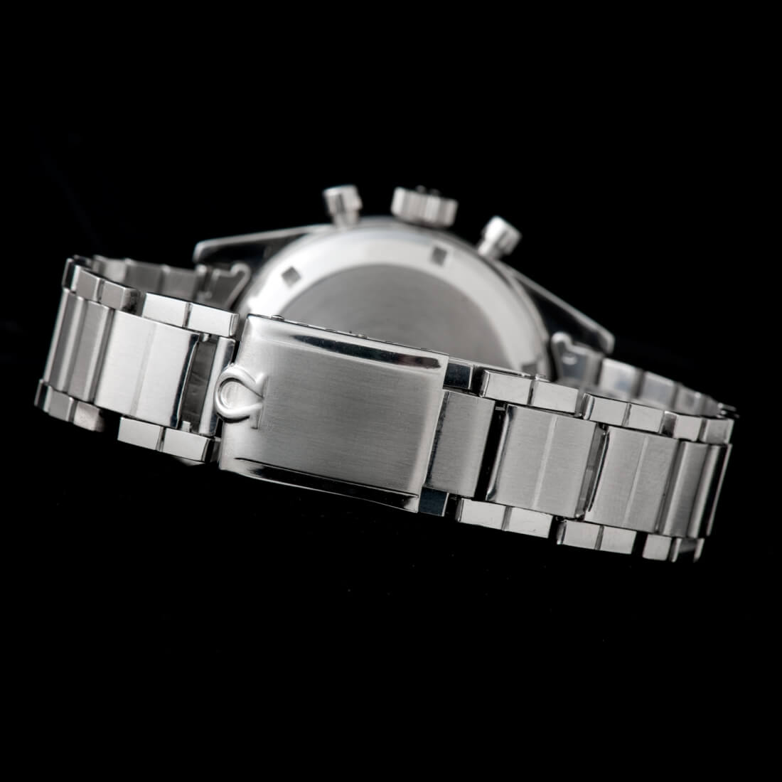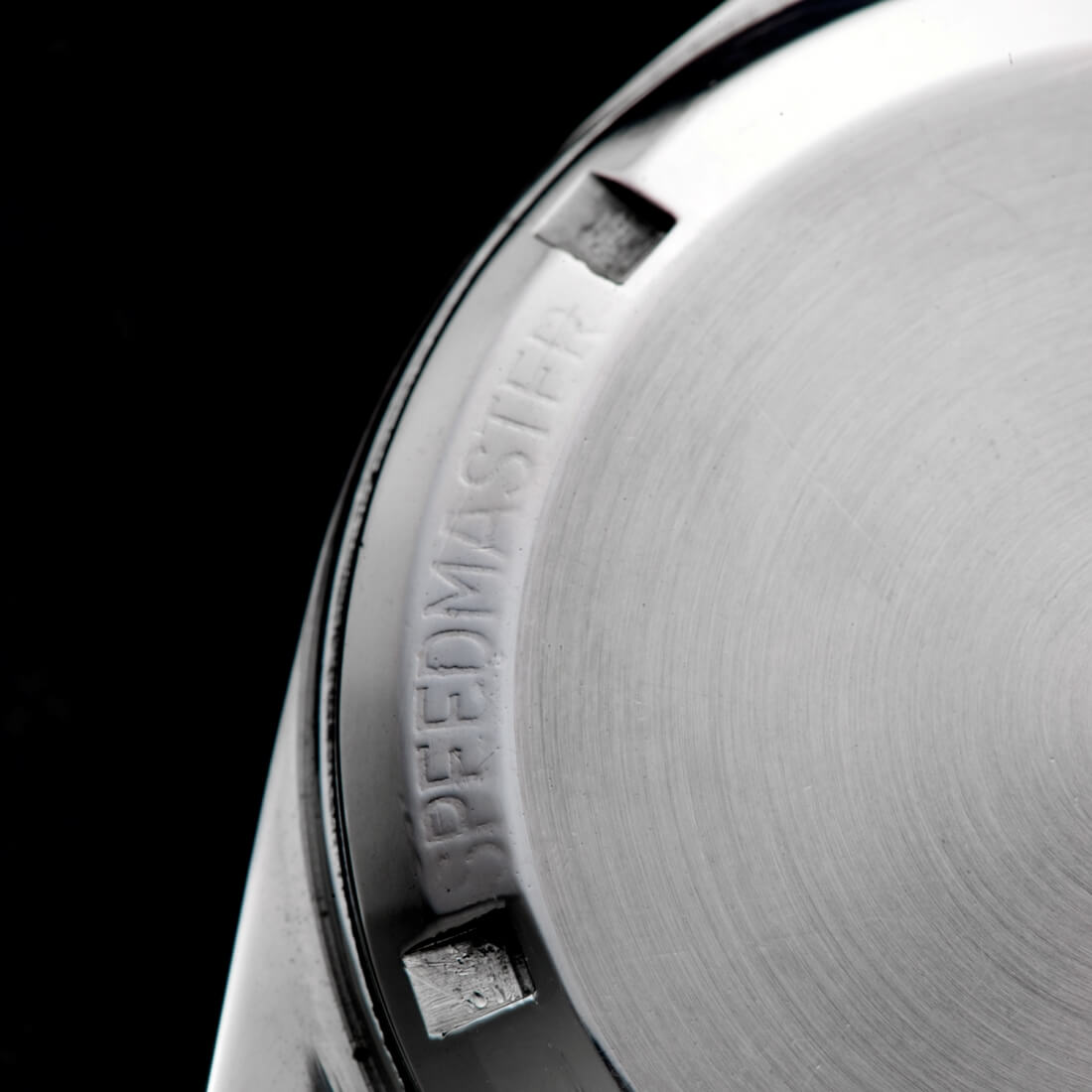 言わずと知れたスピードマスターファーストモデルです。1957年にスタートしたこちらのモデルは、現在に至るまでマイナーチェンジを繰り返しながら作り続けられているOMEGA社を象徴するモデルです。短針は矢じり型のアローハンドを備え、ベゼルはファーストモデルのみステンレスにタキメーター表記が刻まれるディティールで、これ以降のベゼルはアルミ製焼き付け塗装となります。 通常裏蓋にはシーホースの刻印が入りますが、ファーストモデルは入りません。ブレスはFF6のオリジナルキャタピラブレスとなります。