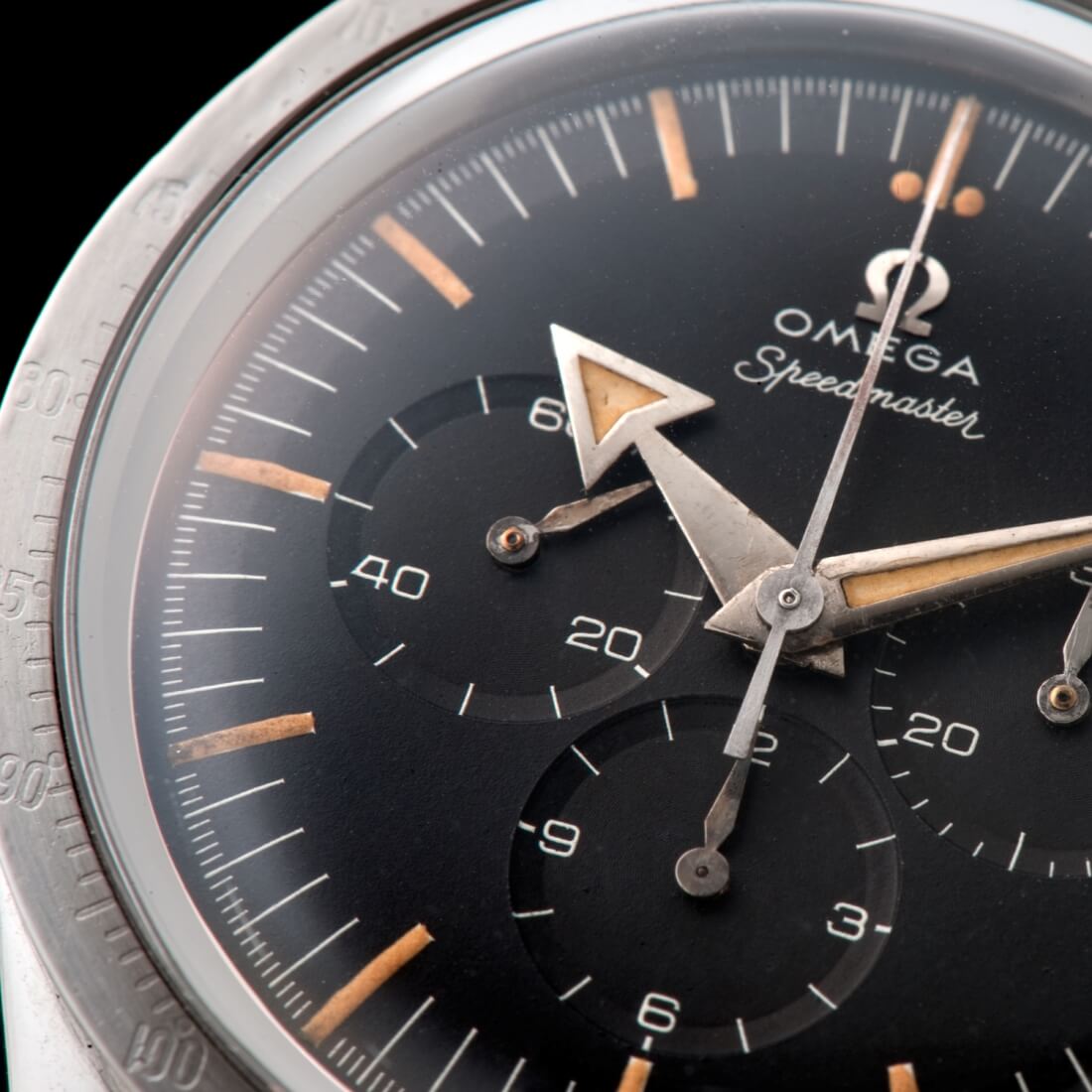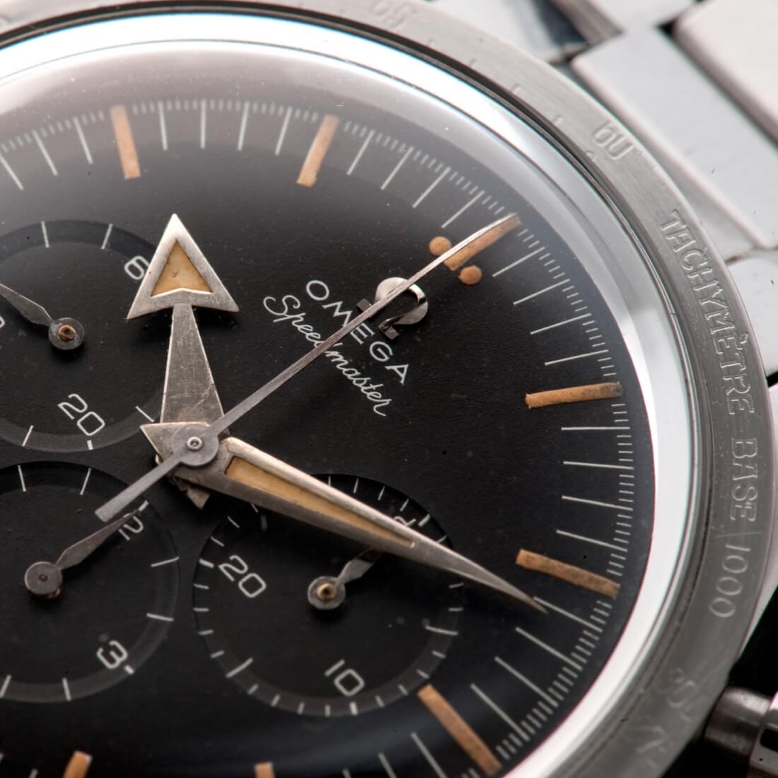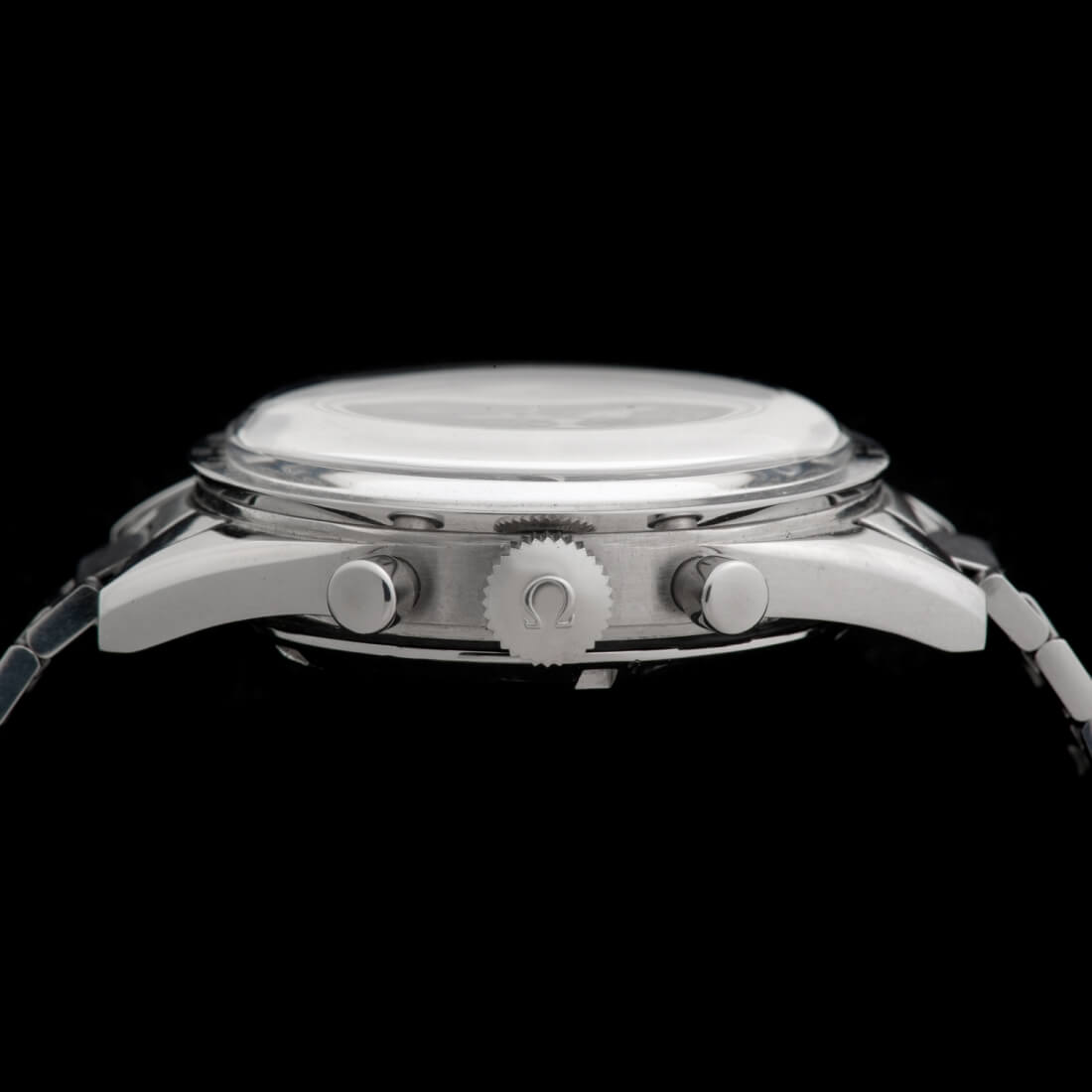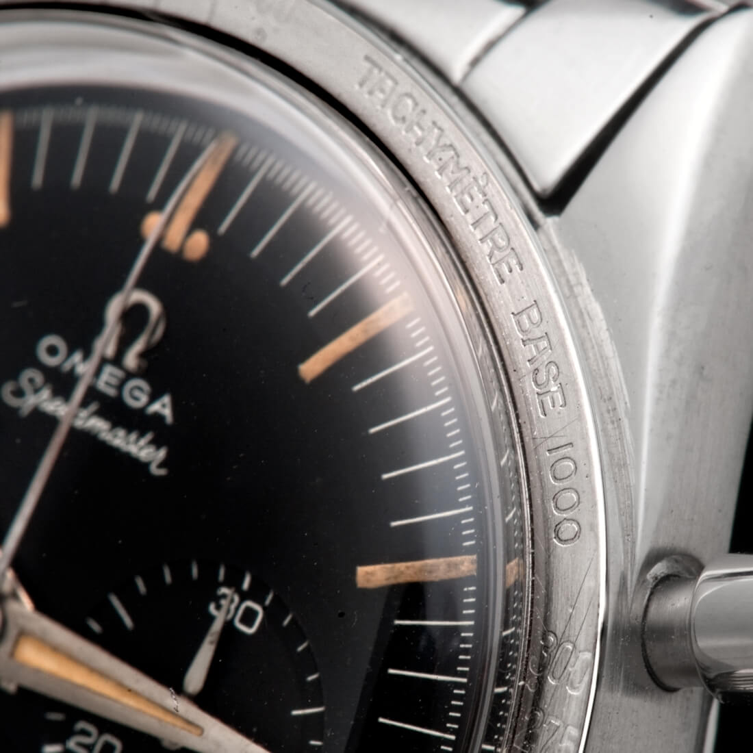 言わずと知れたスピードマスターファーストモデルです。1957年にスタートしたこちらのモデルは、現在に至るまでマイナーチェンジを繰り返しながら作り続けられているOMEGA社を象徴するモデルです。短針は矢じり型のアローハンドを備え、ベゼルはファーストモデルのみステンレスにタキメーター表記が刻まれるディティールで、これ以降のベゼルはアルミ製焼き付け塗装となります。 通常裏蓋にはシーホースの刻印が入りますが、ファーストモデルは入りません。ブレスはFF6のオリジナルキャタピラブレスとなります。
